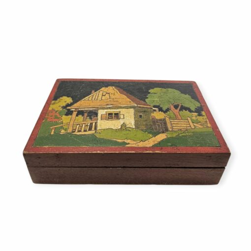 Fából készült kézzel festett ékszerdoboz az 1920-as évekből. A doboz tetején egy hagyományos stílusú ház látható, fák és egy kerítés társaságában , ami vidéki hangulatot kölcsönöz a tárgynak. Rusztikus stílusú enteriőrben mutat igazán. Korának megfelelő állapotú. Méretei :13 x 19 x 5 cm