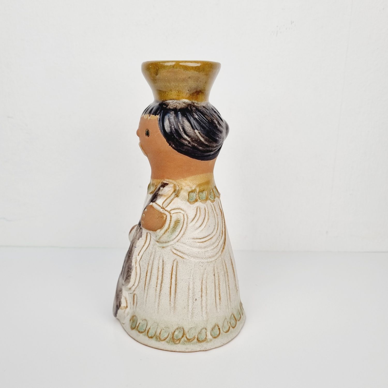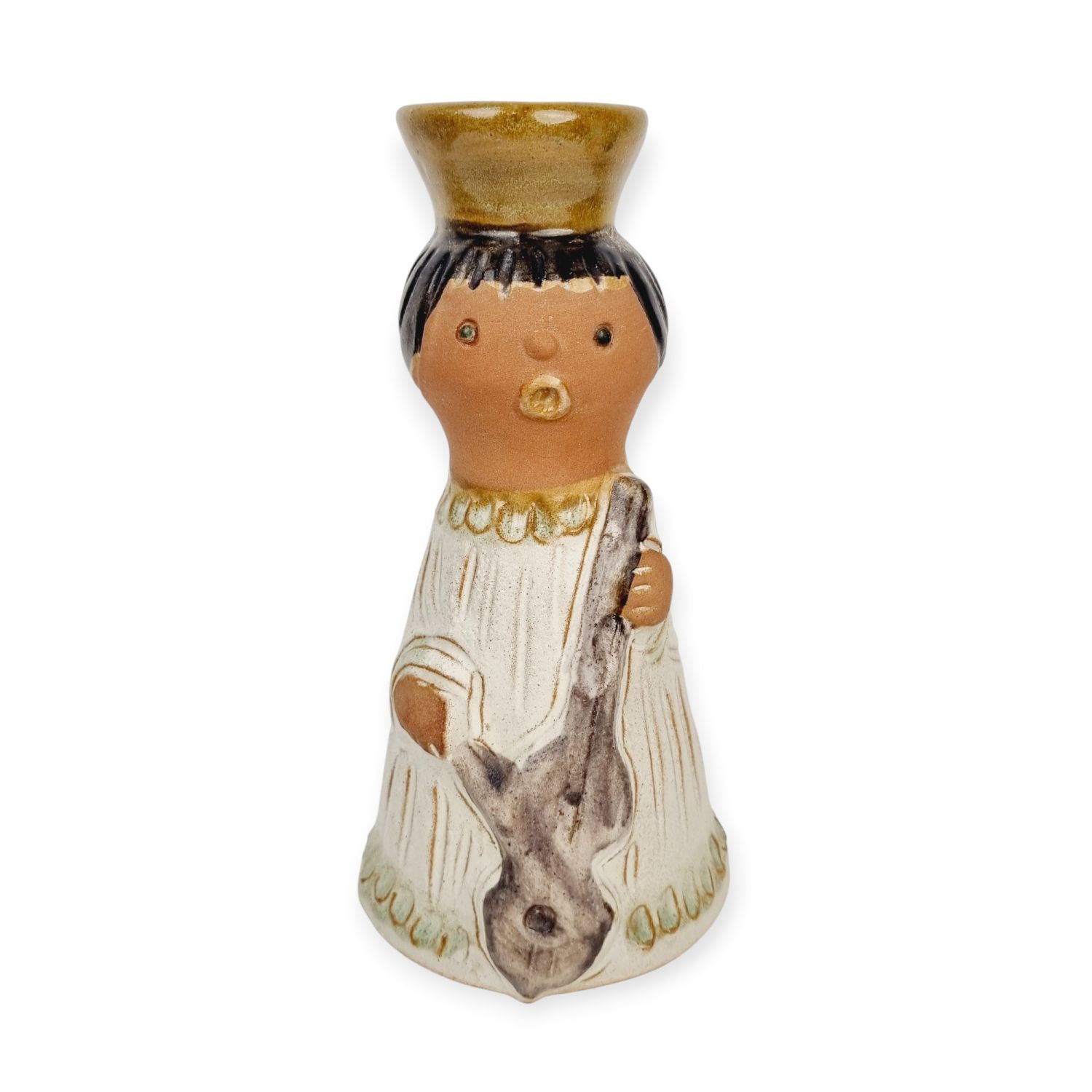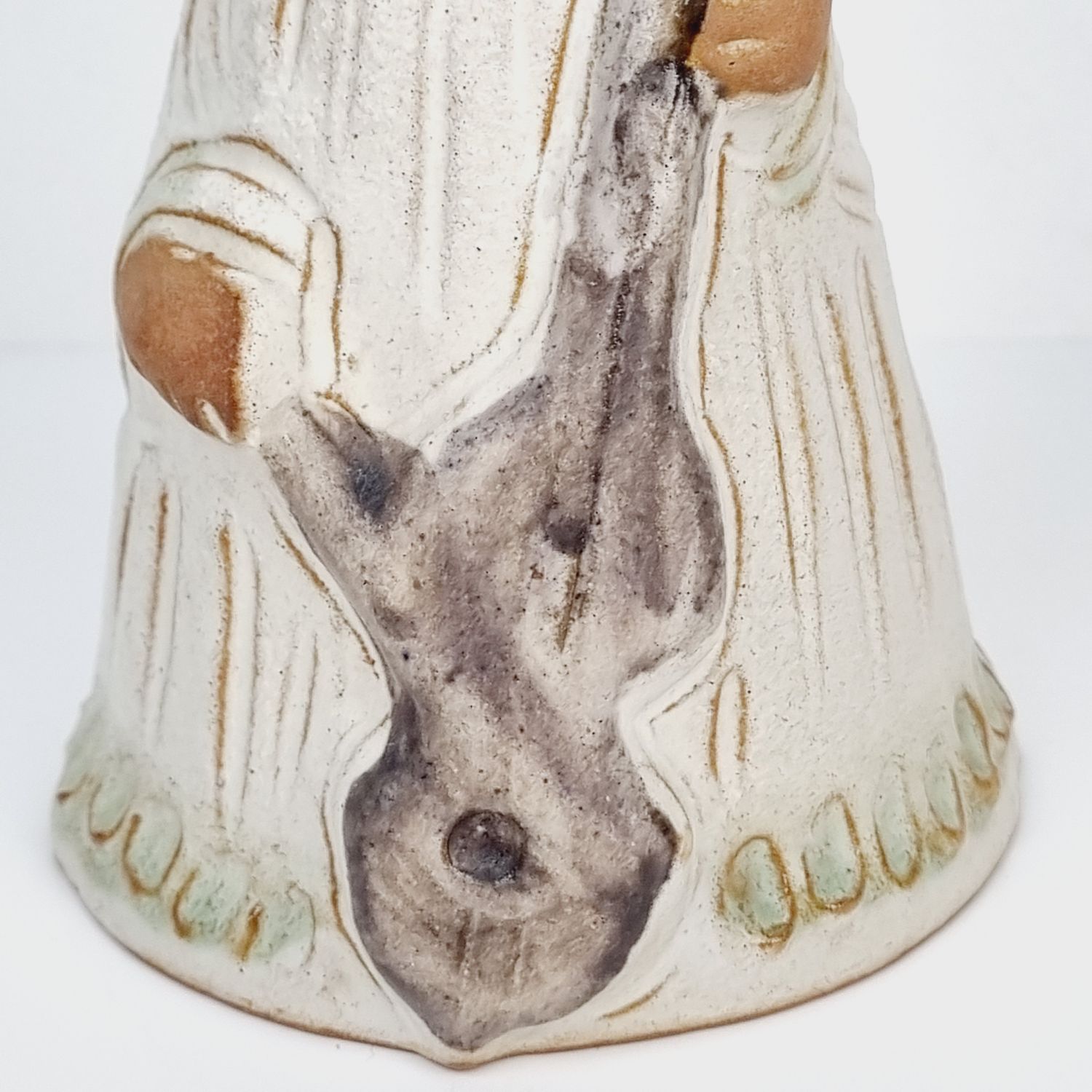 Csellózó leány figura Kiss Roóz Ilona kerámikus művésztől. Kora az 1980-as évekre tehető. Visszafogott színvilág, kedves líraiság a jellemzője. Korának megfelelő állapotú. Jelzett. Méretei: 16 x 8 x 8 cm.