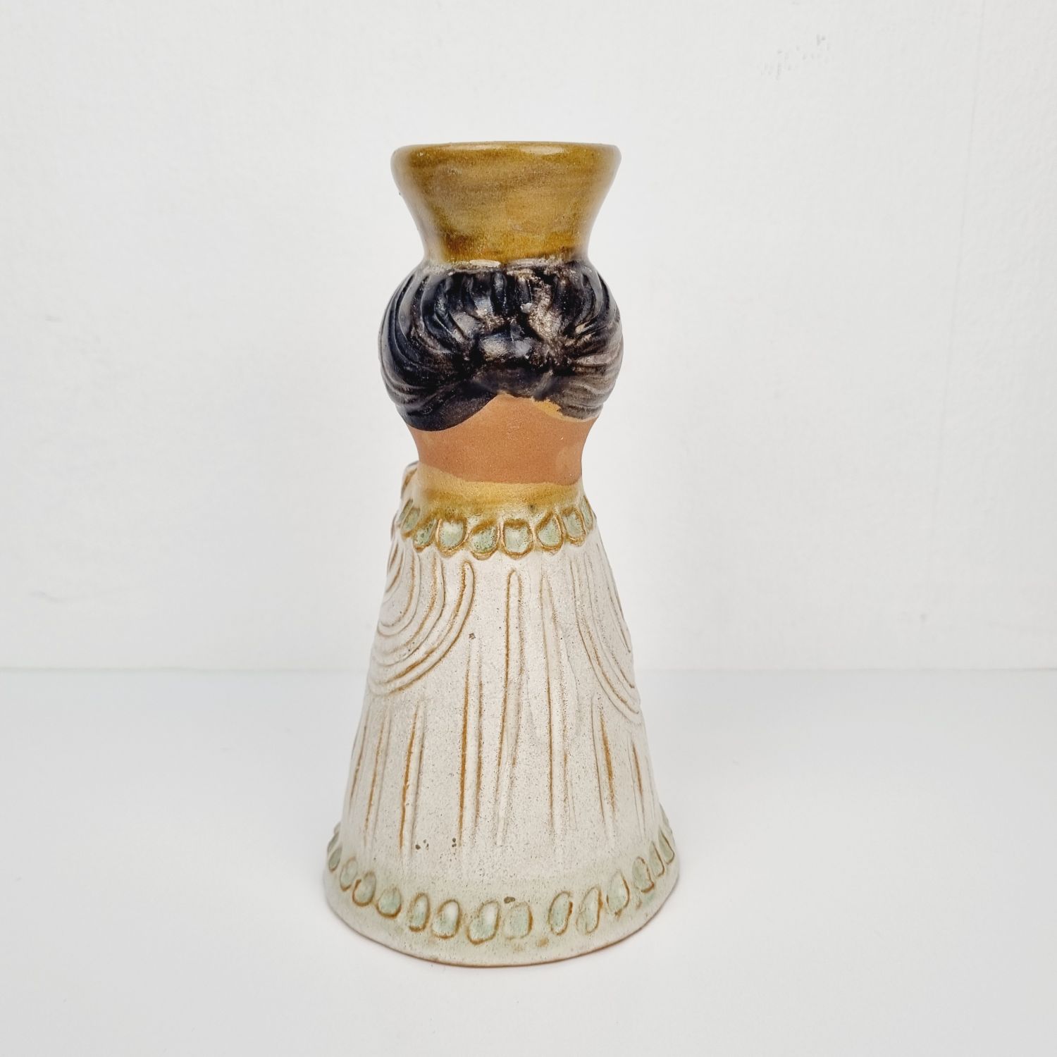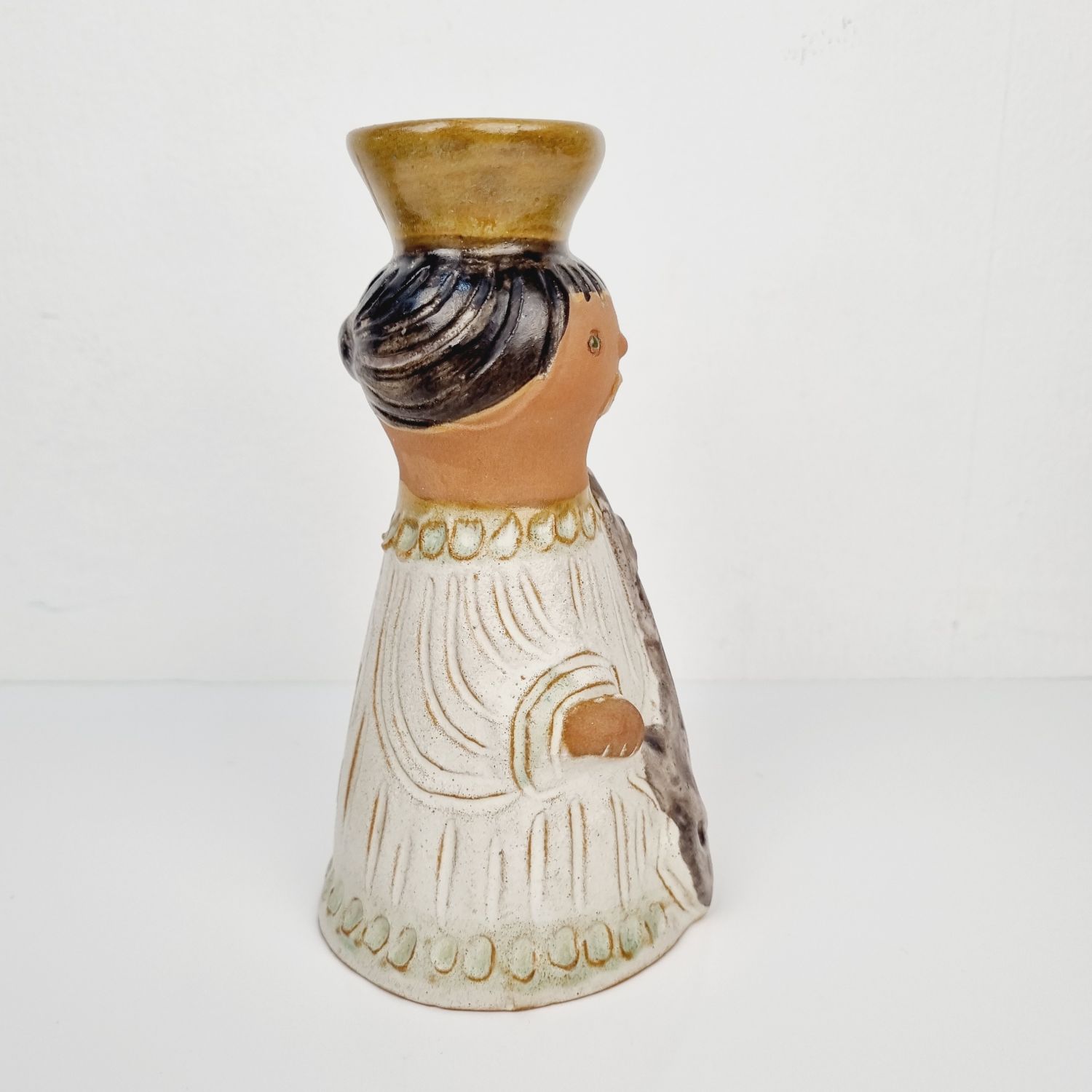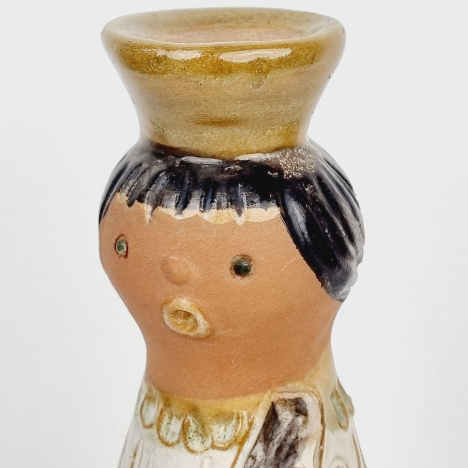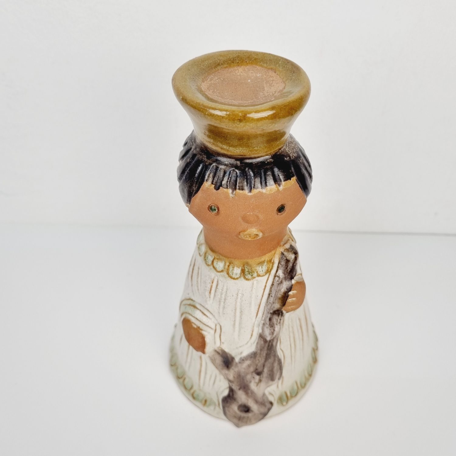 Csellózó leány figura Kiss Roóz Ilona kerámikus művésztől. Kora az 1980-as évekre tehető. Visszafogott színvilág, kedves líraiság a jellemzője. Korának megfelelő állapotú. Jelzett. Méretei: 16 x 8 x 8 cm.