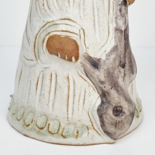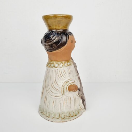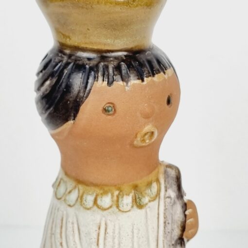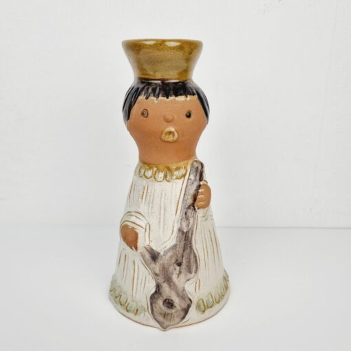 Csellózó leány figura Kiss Roóz Ilona kerámikus művésztől. Kora az 1980-as évekre tehető. Visszafogott színvilág, kedves líraiság a jellemzője. Korának megfelelő állapotú. Jelzett. Méretei: 16 x 8 x 8 cm.