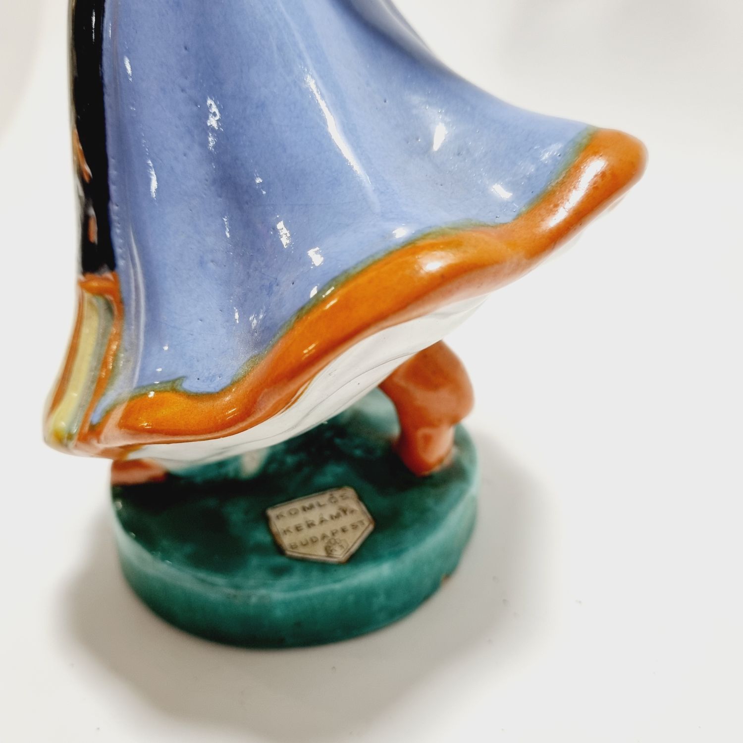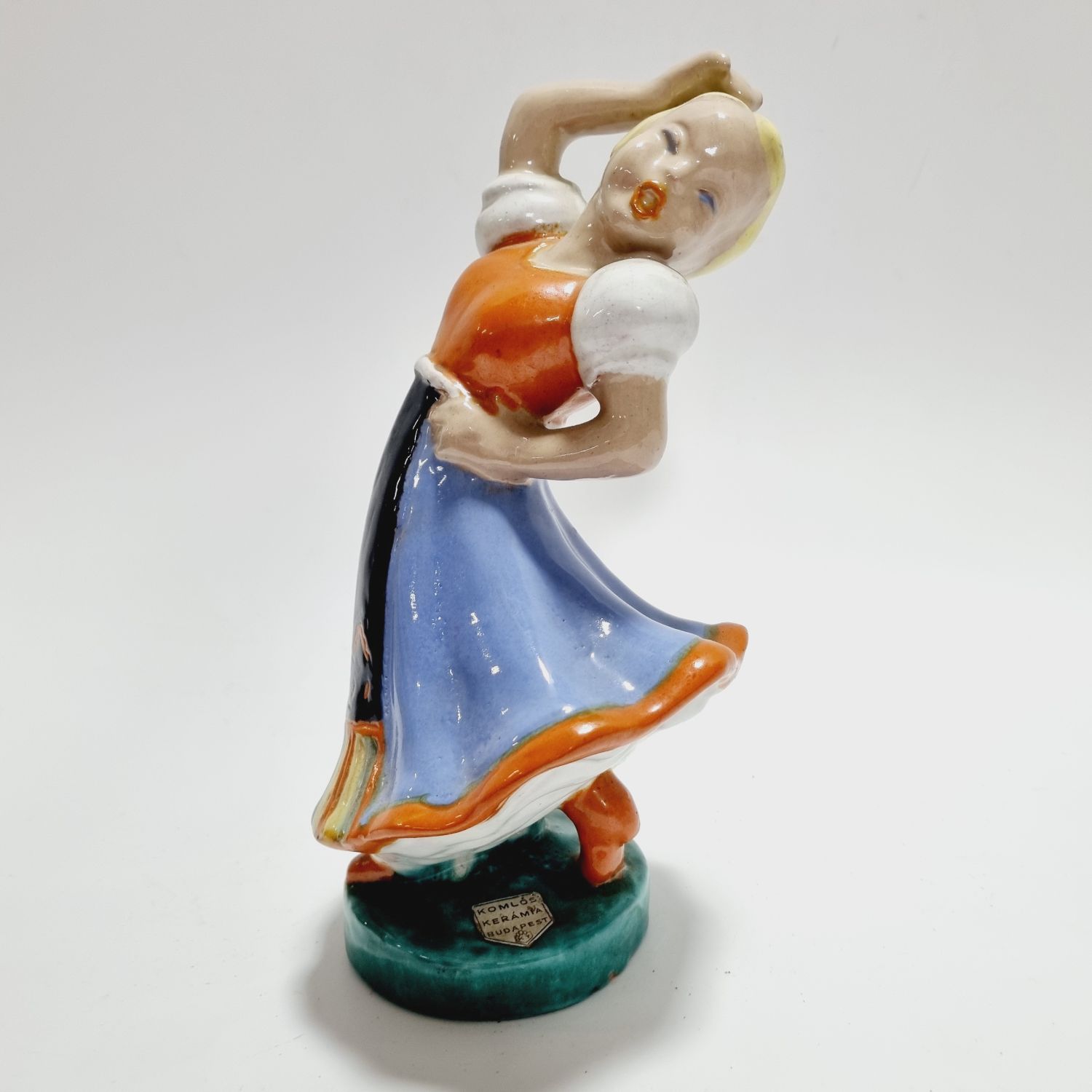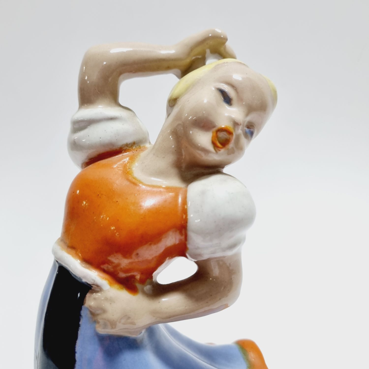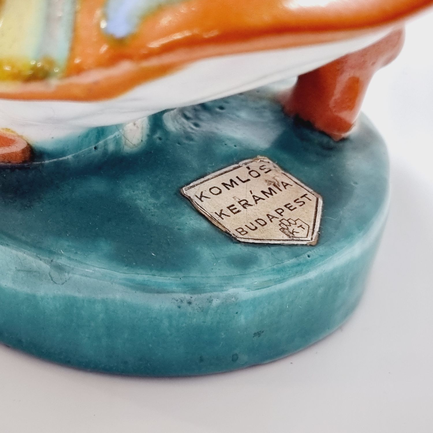 Komlós Sándor :Táncoló leány kerámia figura az 1940-es évekből.Egy iparművészeti stílust jelölnek a Komlós Sándor és fia Komlós Tibor által készített kerámiák. A polgári és a paraszti életből merített kedves színes figurák vidám, élettel teli alkotások. A Táncoló leány méretei: 24 x 12 x 10 cm. Korának megfelelő állapotú.