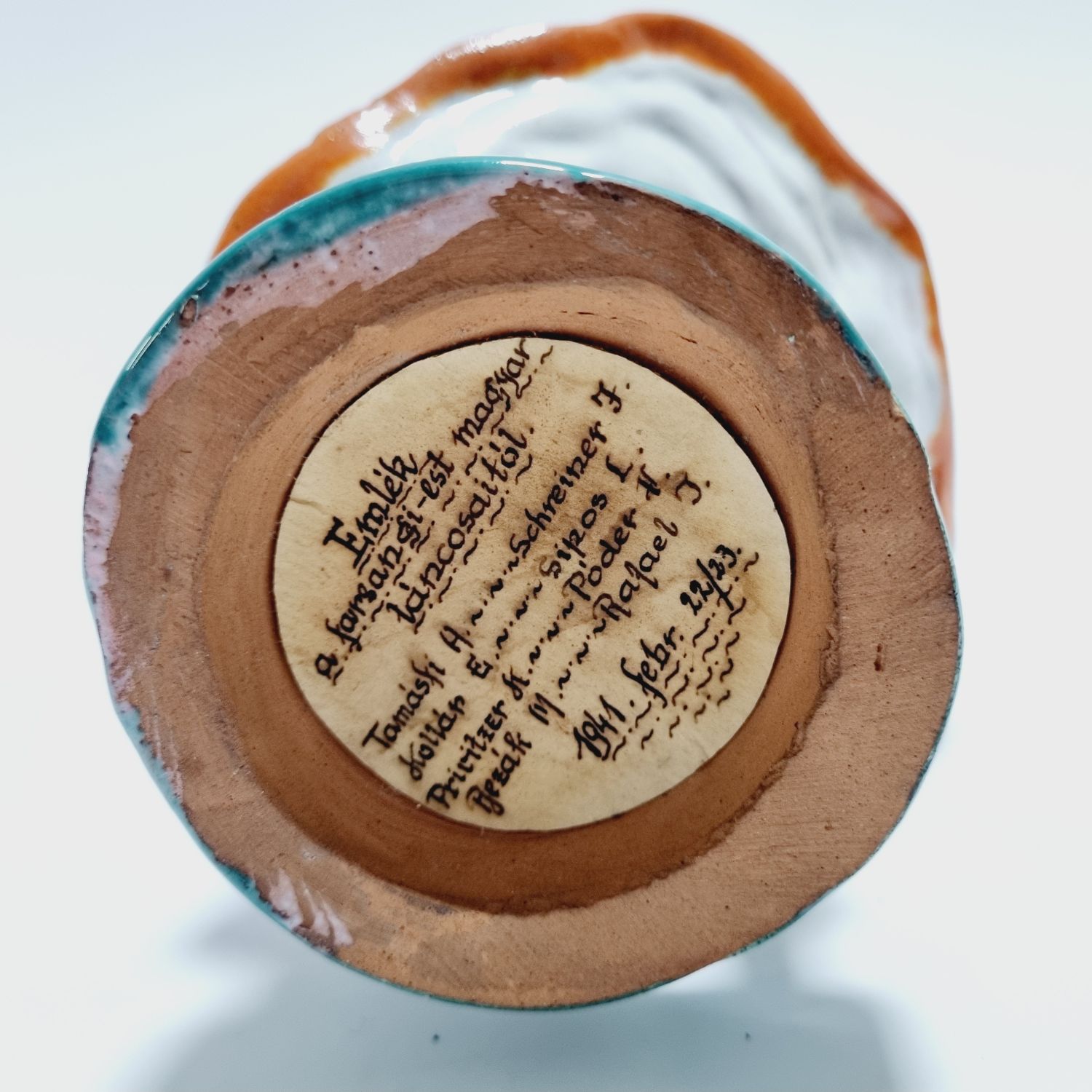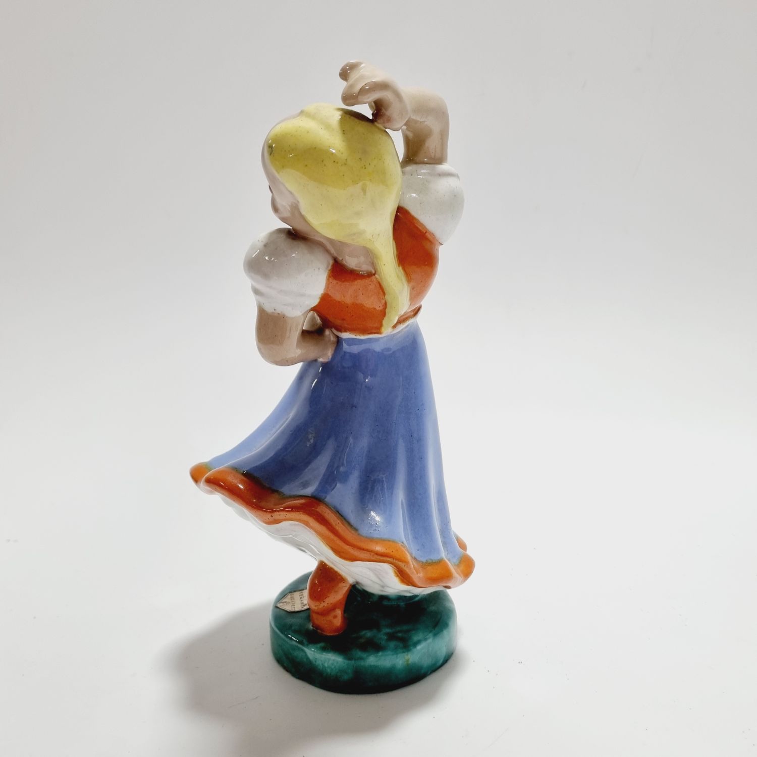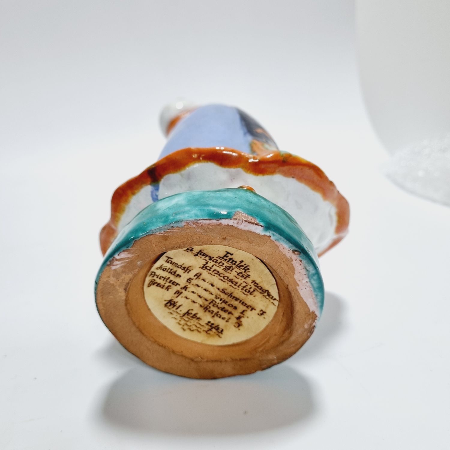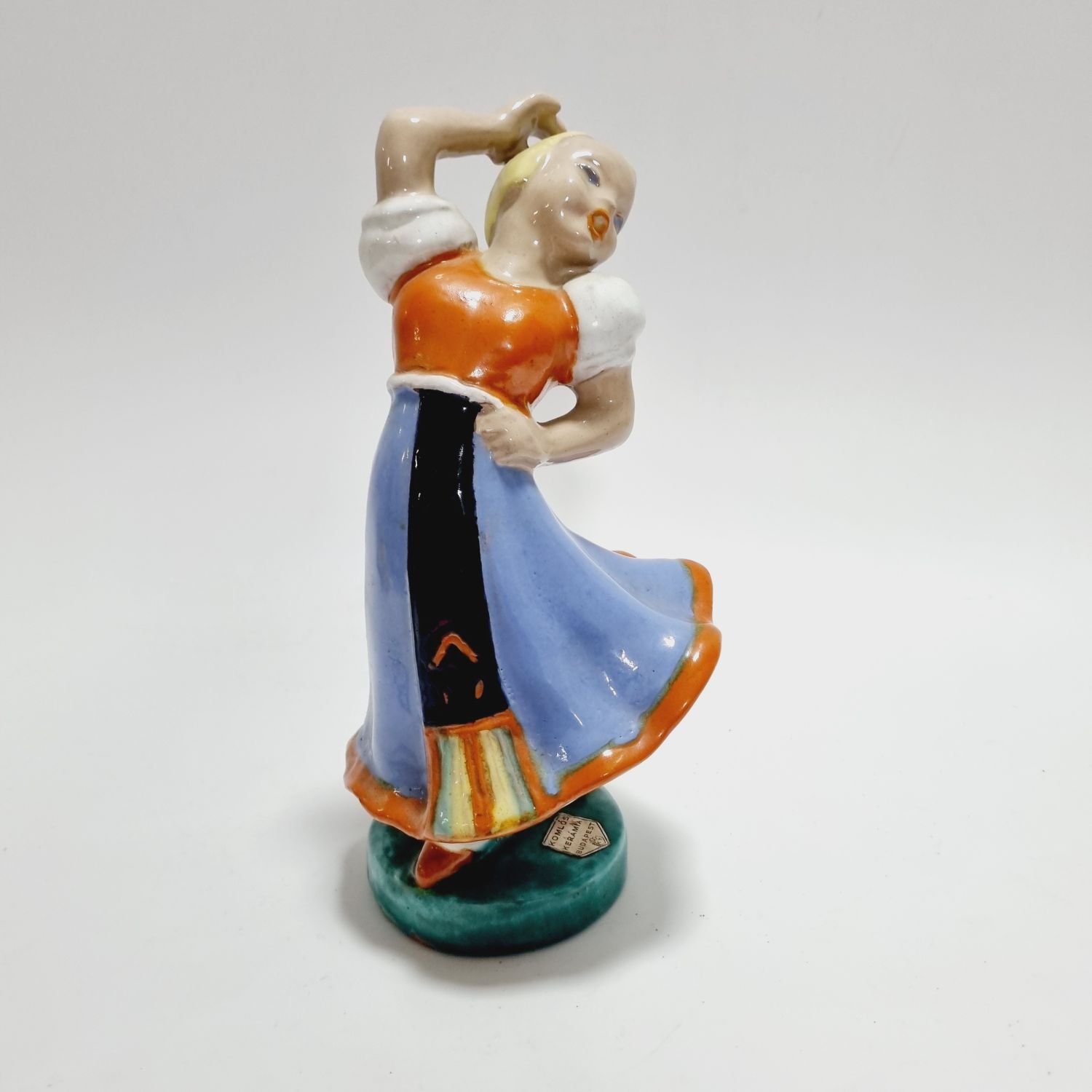 Komlós Sándor :Táncoló leány kerámia figura az 1940-es évekből.Egy iparművészeti stílust jelölnek a Komlós Sándor és fia Komlós Tibor által készített kerámiák. A polgári és a paraszti életből merített kedves színes figurák vidám, élettel teli alkotások. A Táncoló leány méretei: 24 x 12 x 10 cm. Korának megfelelő állapotú.