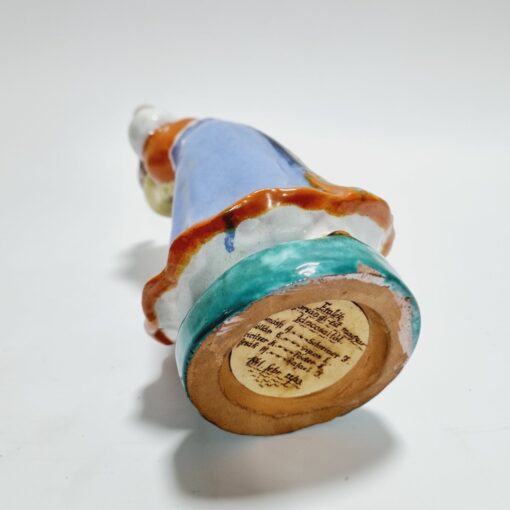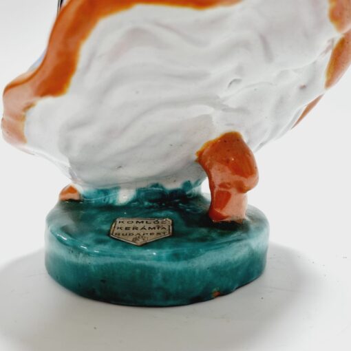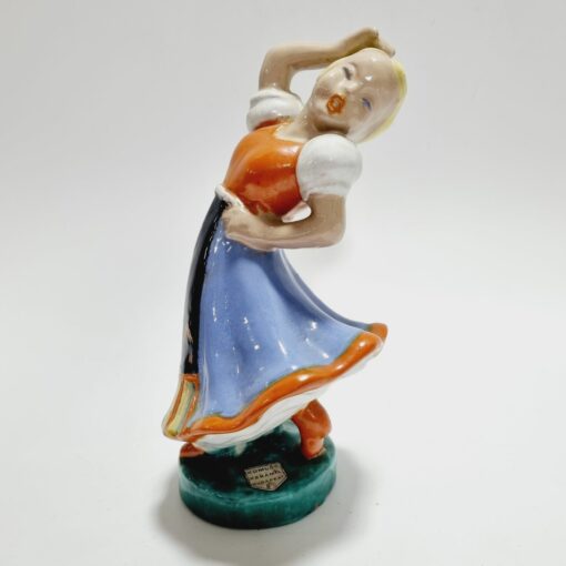 Komlós Sándor :Táncoló leány kerámia figura az 1940-es évekből.Egy iparművészeti stílust jelölnek a Komlós Sándor és fia Komlós Tibor által készített kerámiák. A polgári és a paraszti életből merített kedves színes figurák vidám, élettel teli alkotások. A Táncoló leány méretei: 24 x 12 x 10 cm. Korának megfelelő állapotú.