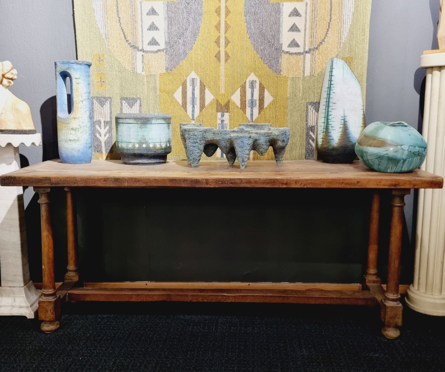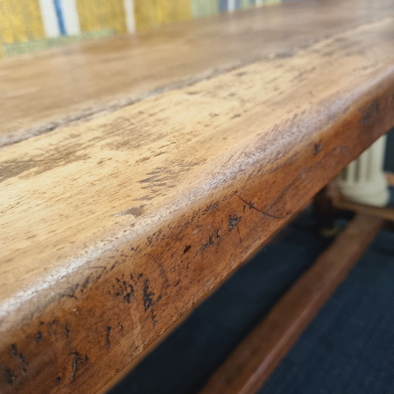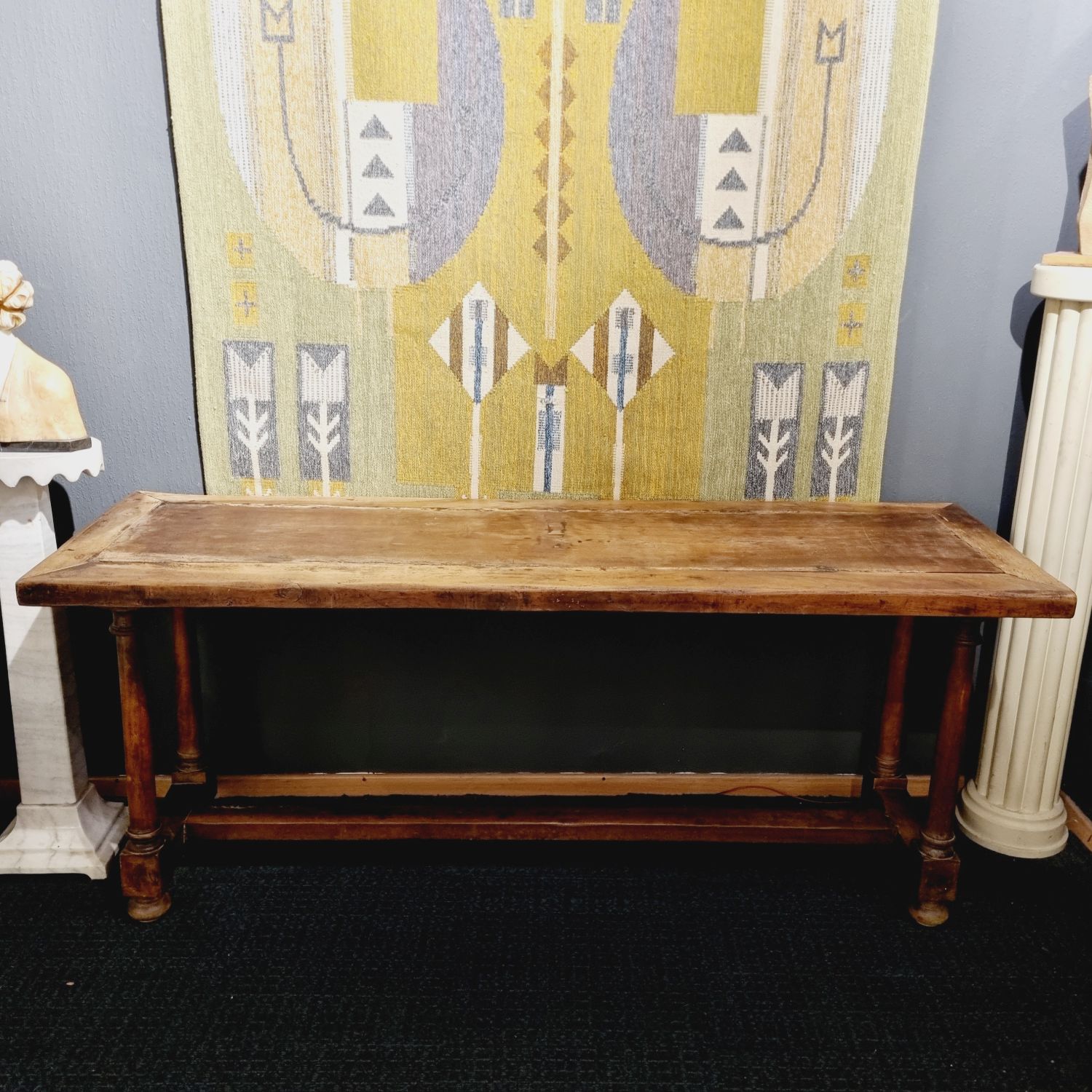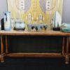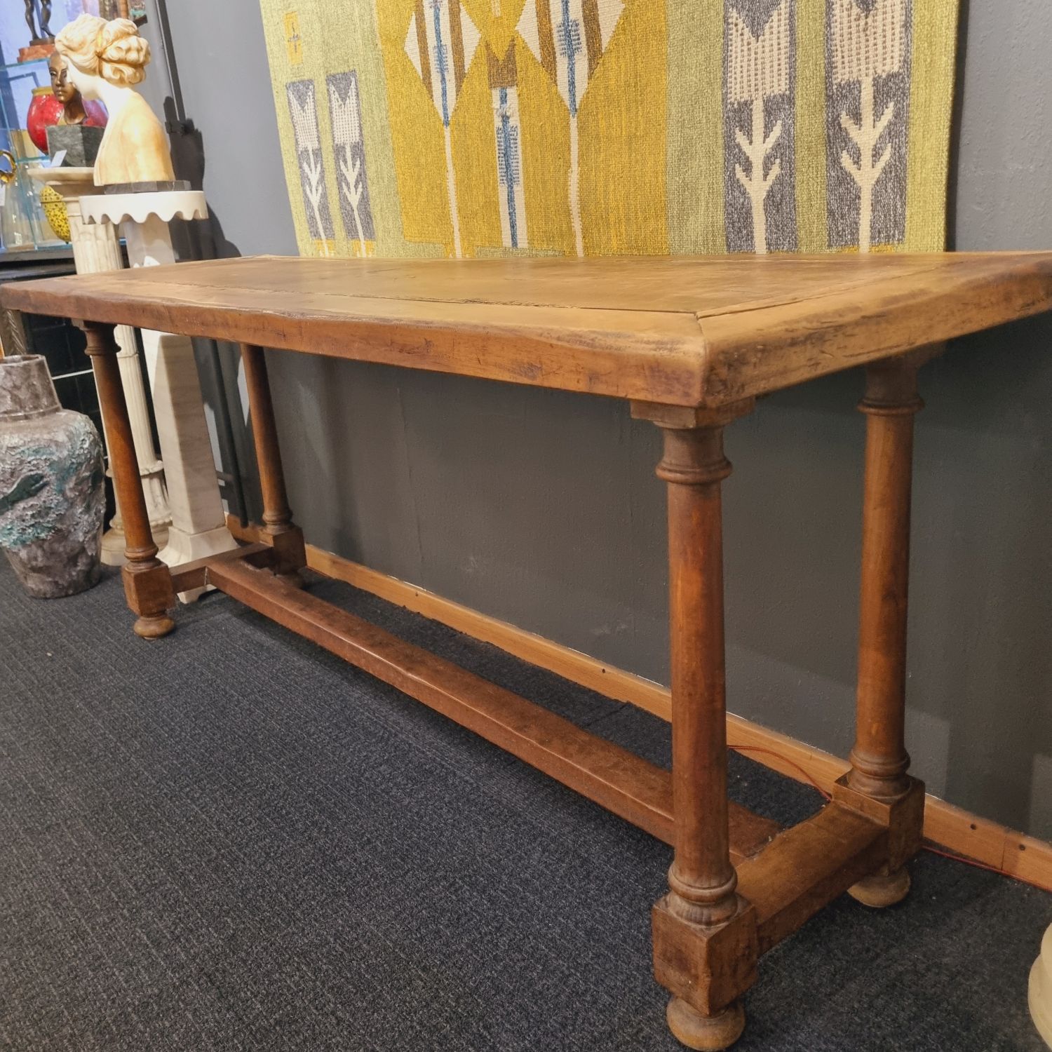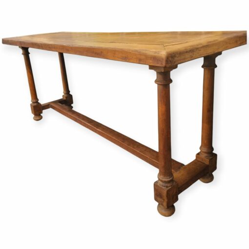 XVIII.századi, tömör diófából készült, rusztikus konzolasztal, ami gyönyörű kiegészítője egy stílusos otthonnak, vagy egy toszkán hangulatú nyaralónak. Ez a 300 éves asztal hangulatos légkört teremt minden térben. A funkció és a stílus remek ötvözete. Méretei: 80 cm x193 cm x 62 cm. Szép, korának megfelelő állapotban.