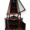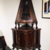 Egyedi kivitelű, rendkívül mívesen kidolgozott, sarokba helyezhető italosszekrény. Szivarszoba vagy férfi iroda fantasztikus berendezési tárgya lehet. Felsőrész eredeti metszett üvegekkel. Gyönyörű eredeti állapotban.