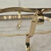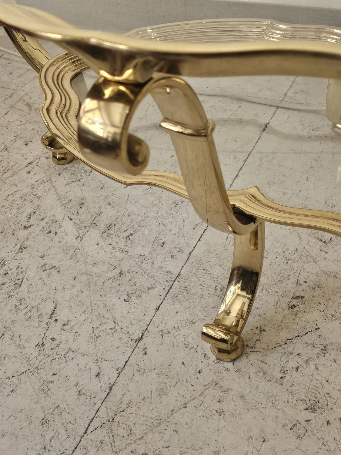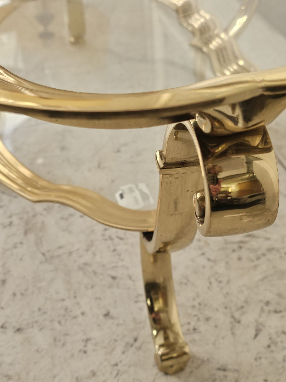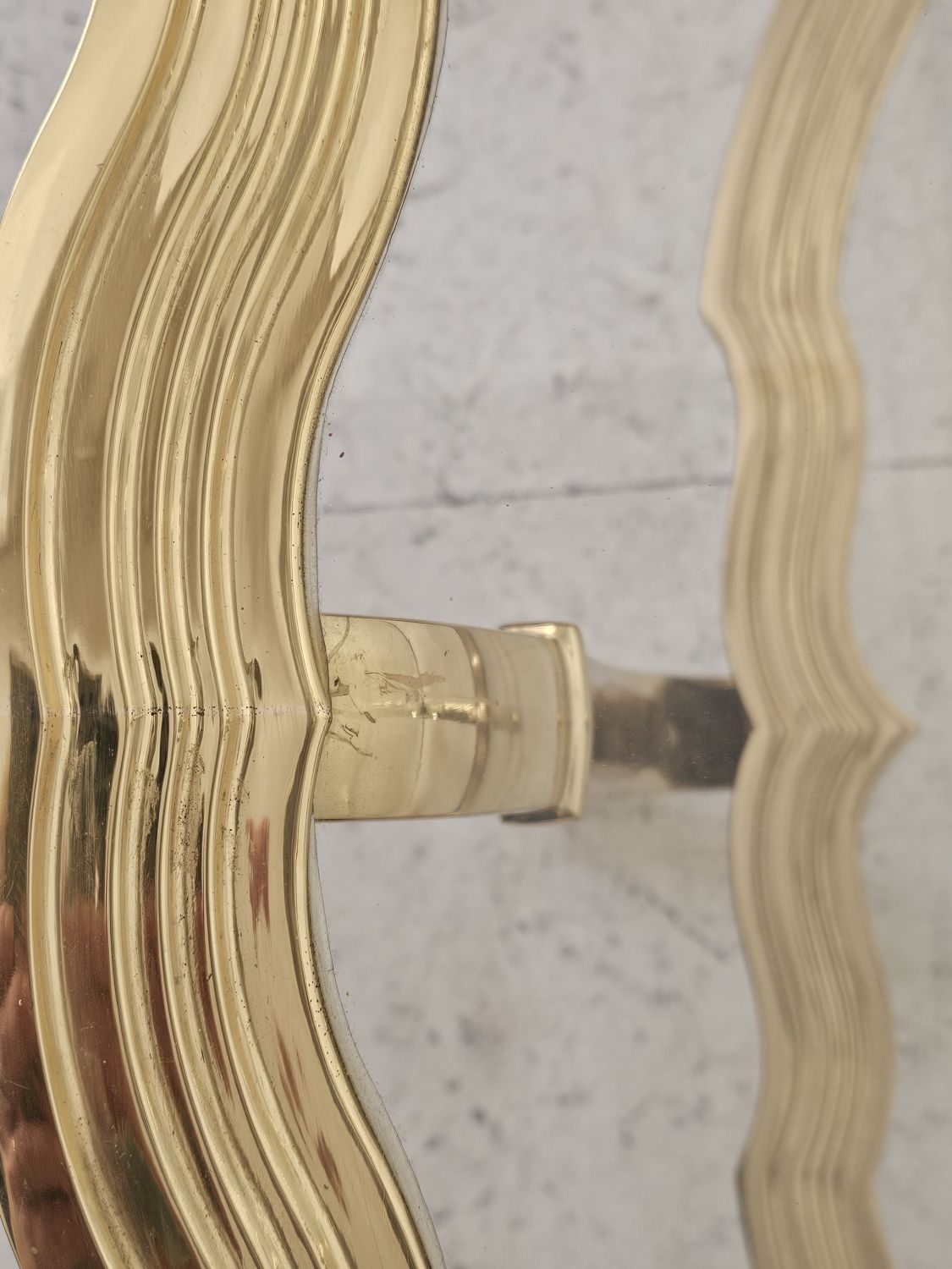 LaBarge amerikai design aranyozott rézasztal üveg lappal az 1970-es évekből. Jellegzetes hullámos szegéllyel rendelkezik. Stílusa: Hollywood ragency. Elegáns, ívelt formája miatt impozáns modern darabja az antik és a modern enteriőrnek egyaránt.