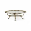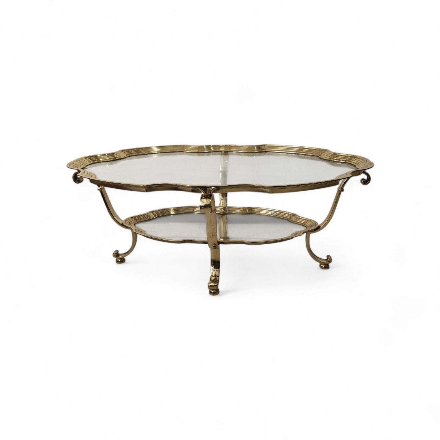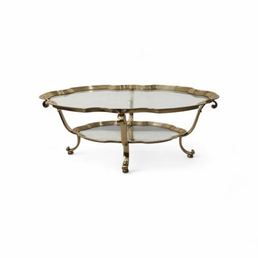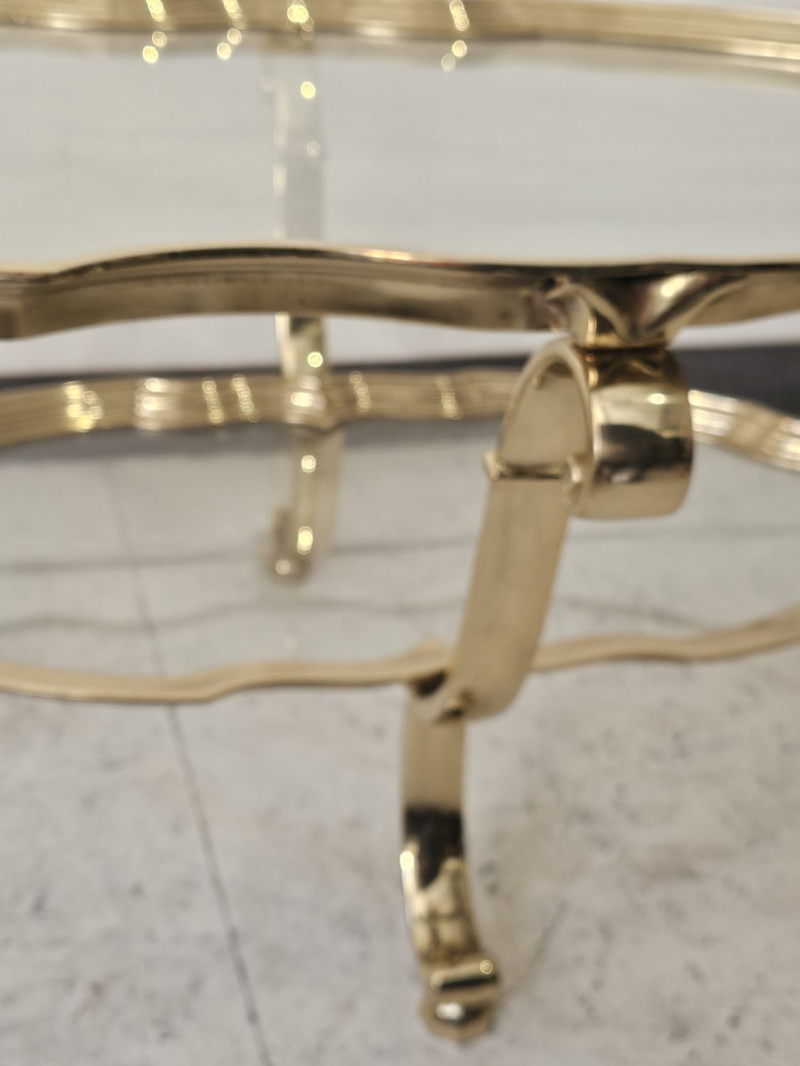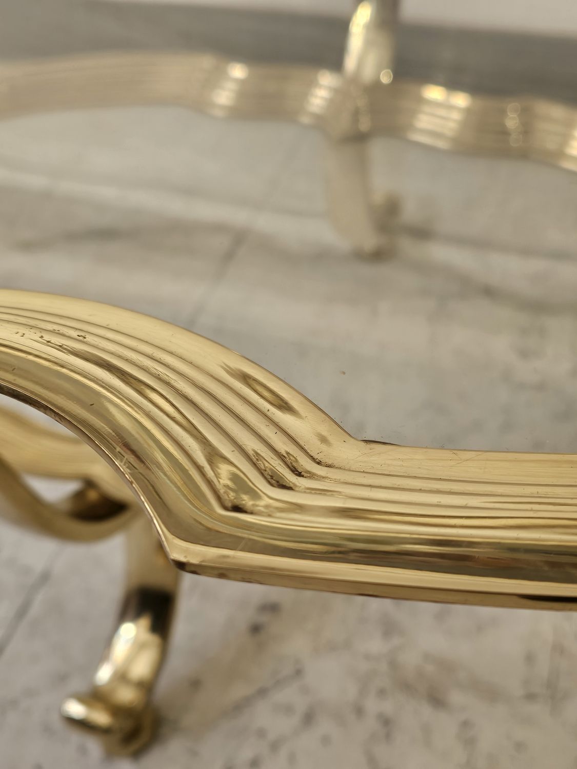 LaBarge amerikai design aranyozott rézasztal üveg lappal az 1970-es évekből. Jellegzetes hullámos szegéllyel rendelkezik. Stílusa: Hollywood ragency. Elegáns, ívelt formája miatt impozáns modern darabja az antik és a modern enteriőrnek egyaránt.