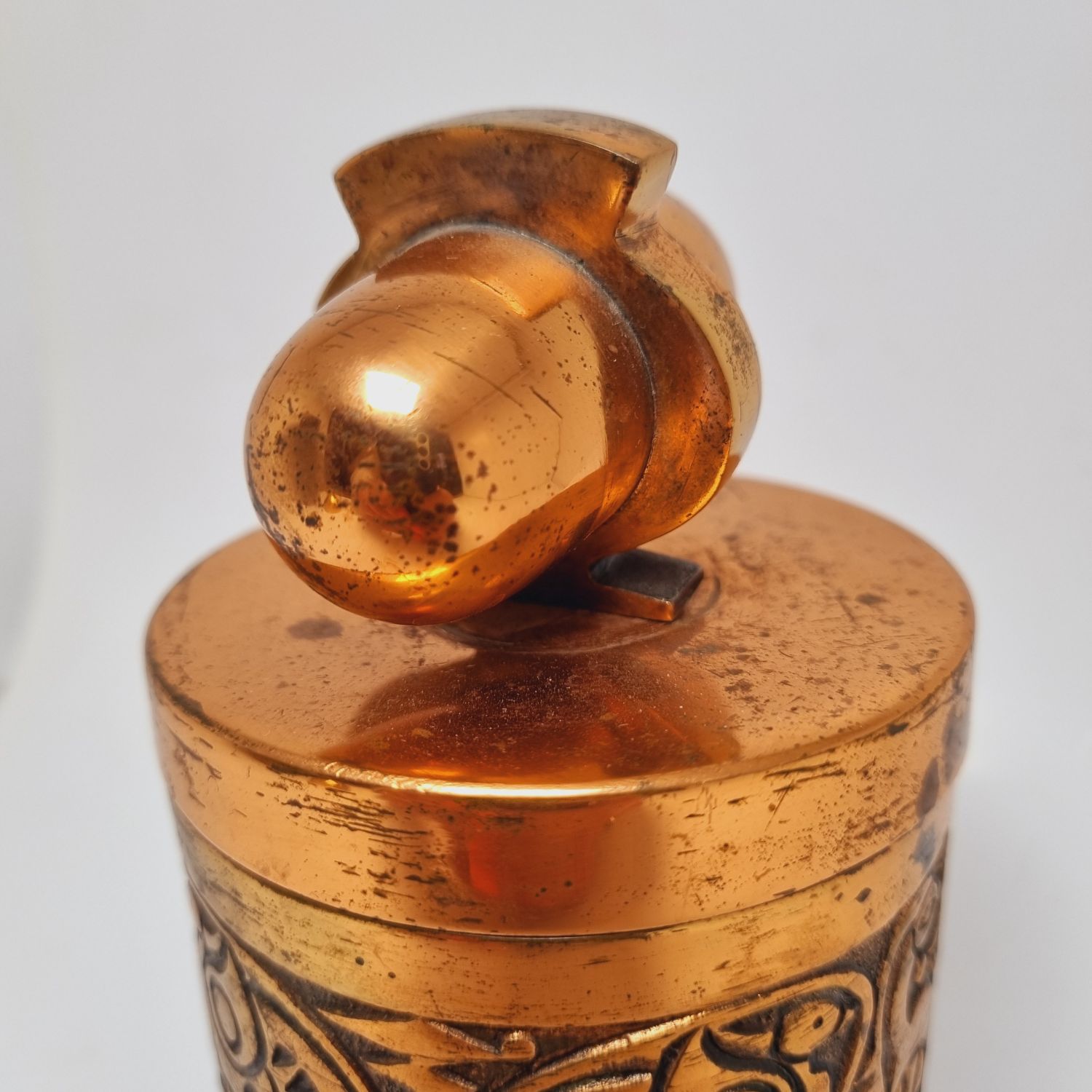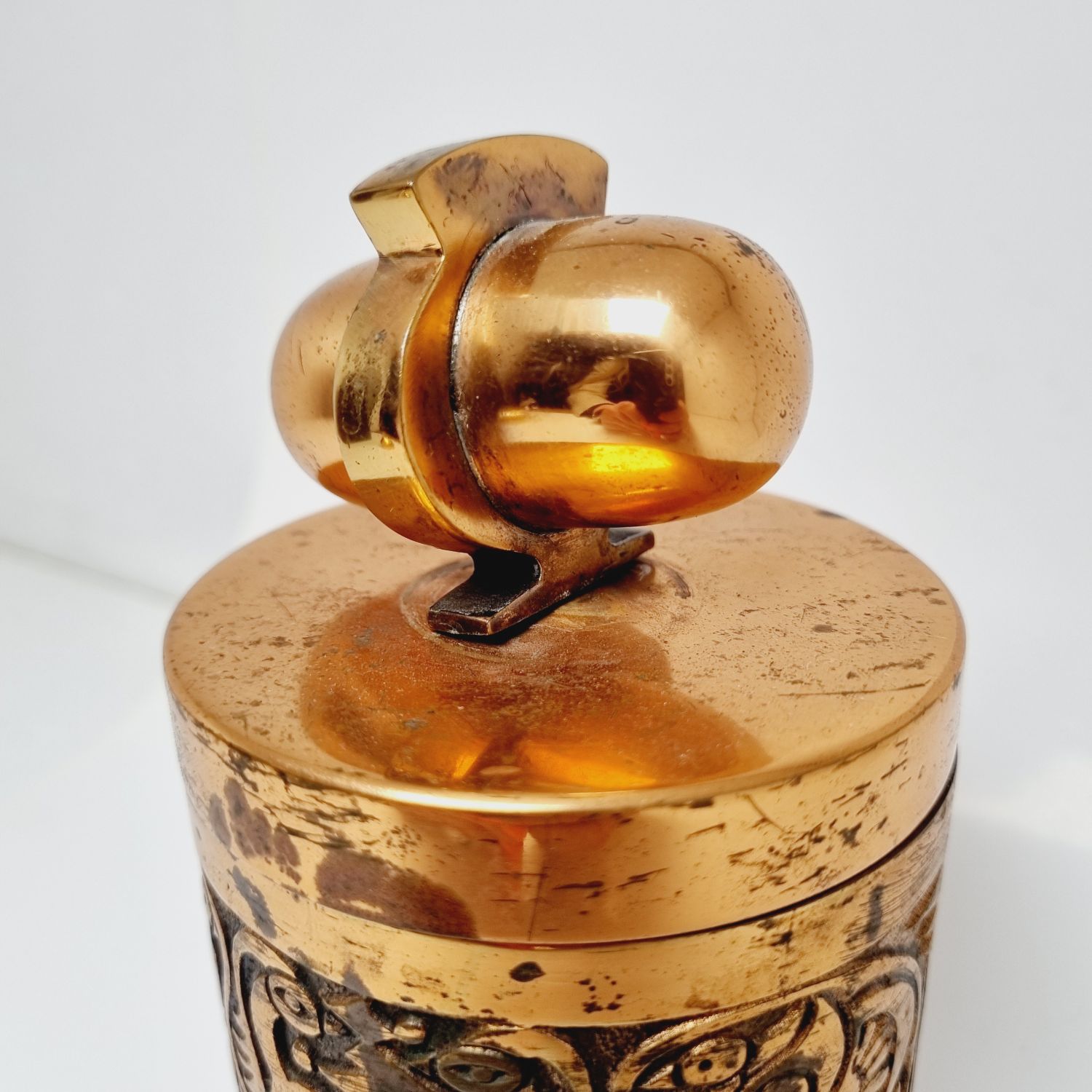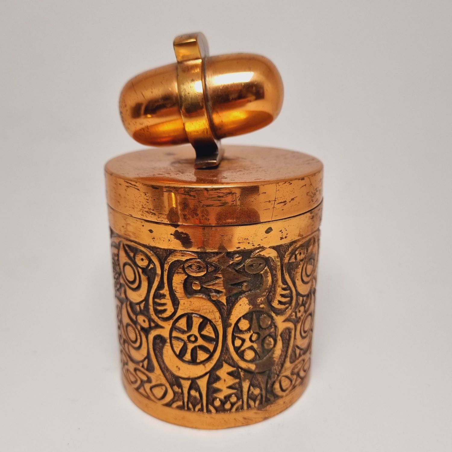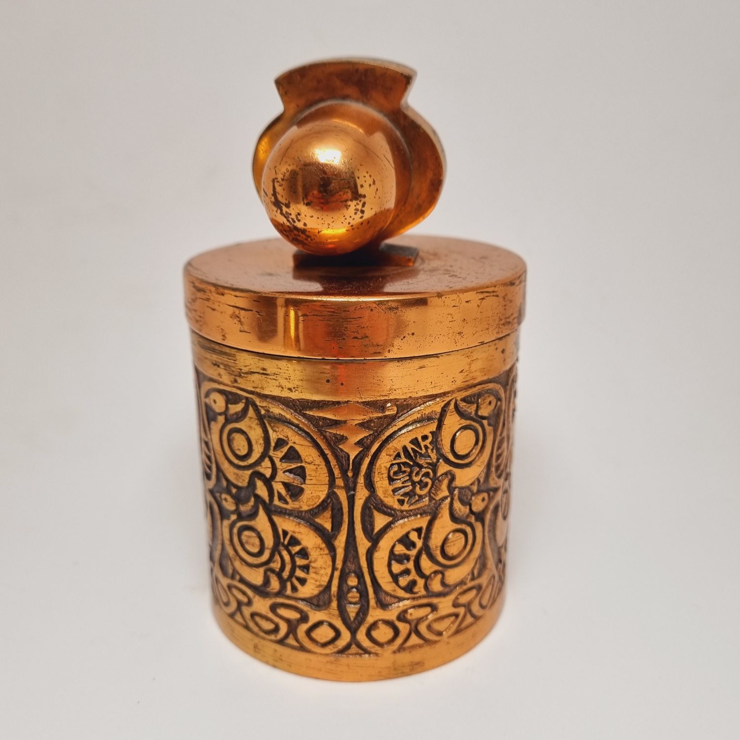 Magyarcsák Mária: Cigarettatartó, amely vörösrézből készült az 1970-es években. Oldalán dombornyomott, stilizált madár vagy sárkányszerü minták láthatók. Fedelén egyedi fogantyú található. Izgalmas egyedi iparművészeti alkotás. Korának megfelelő állapotú. Méretei: 13 x 8 x 7,5 cm.