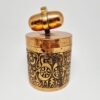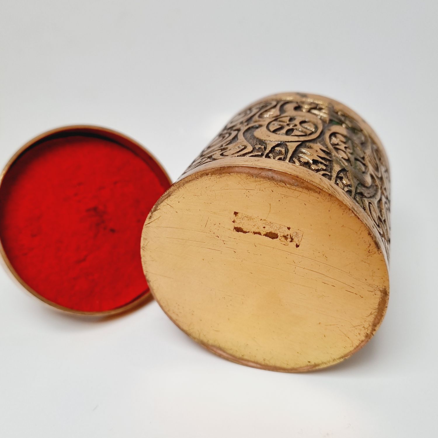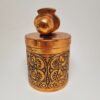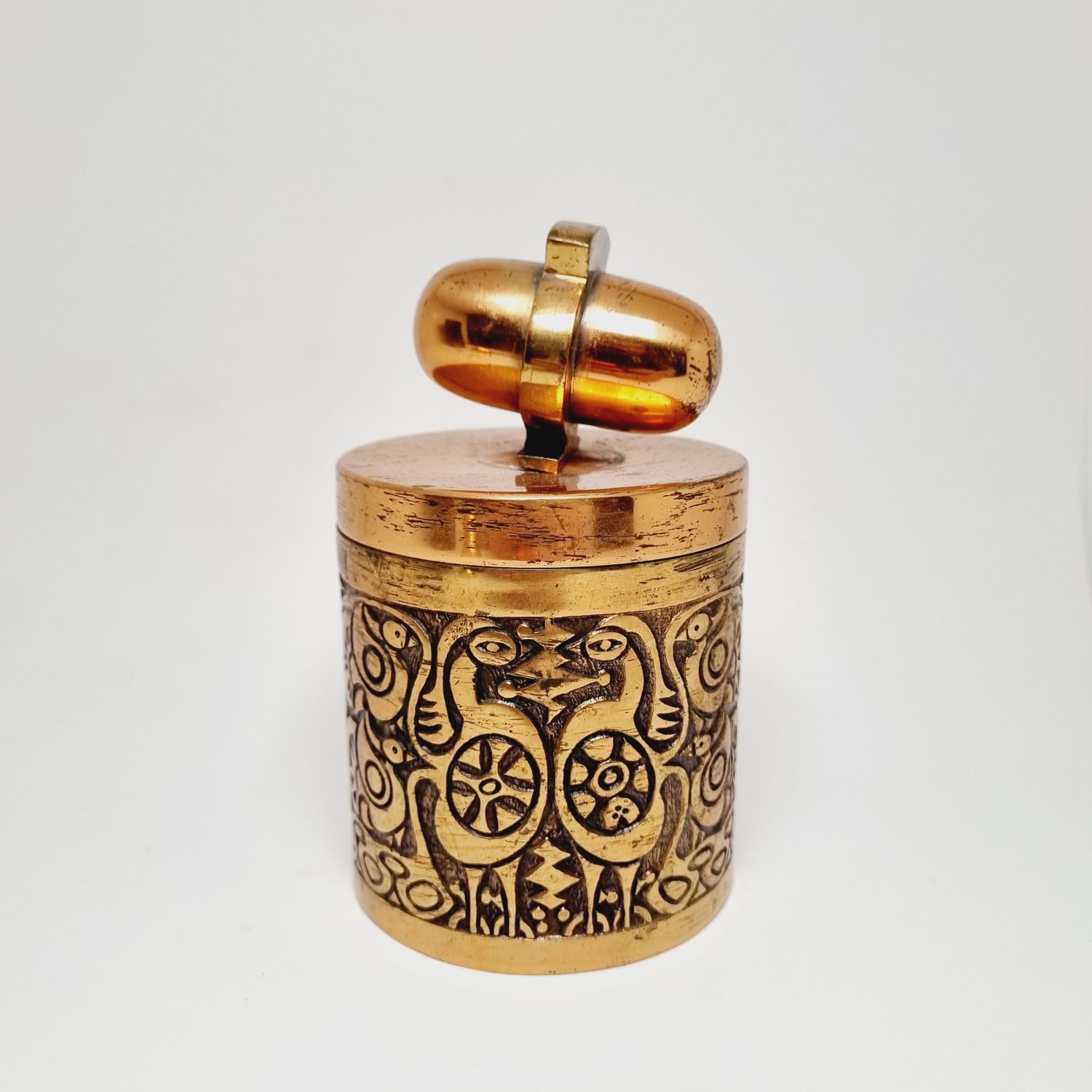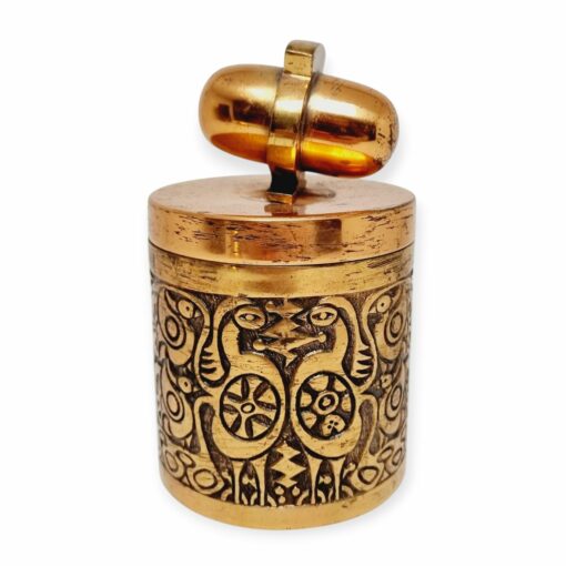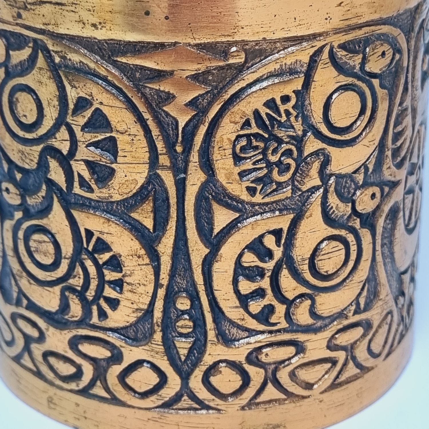Magyarcsák Mária: Cigarettatartó, amely vörösrézből készült az 1970-es években. Oldalán dombornyomott, stilizált madár vagy sárkányszerü minták láthatók. Fedelén egyedi fogantyú található. Izgalmas egyedi iparművészeti alkotás. Korának megfelelő állapotú. Méretei: 13 x 8 x 7,5 cm.
