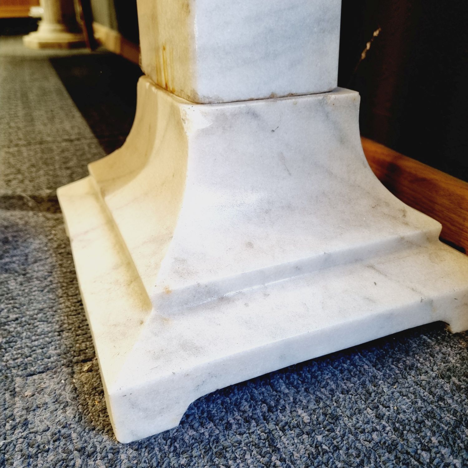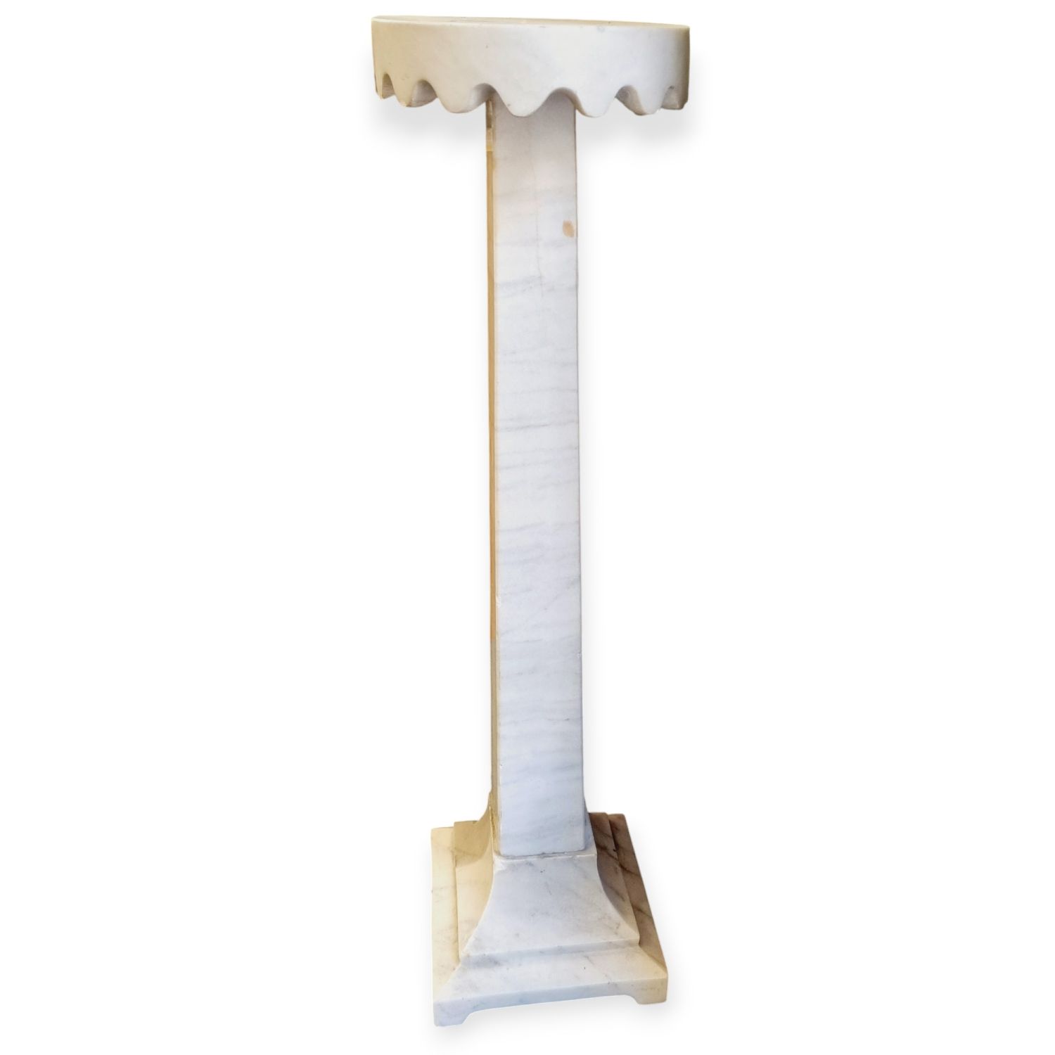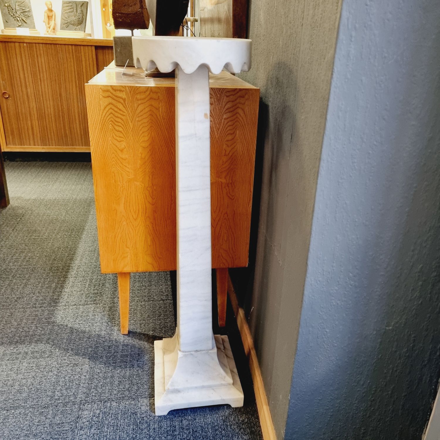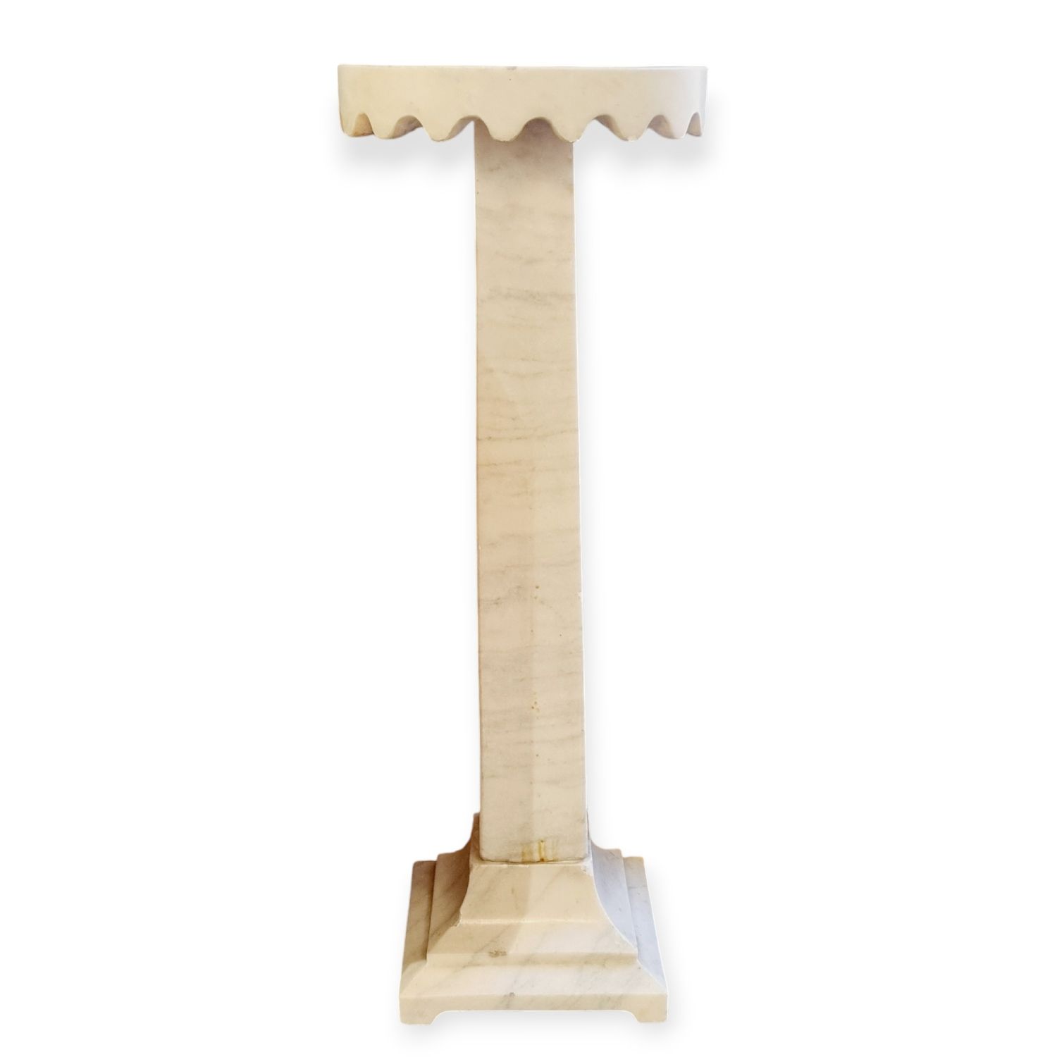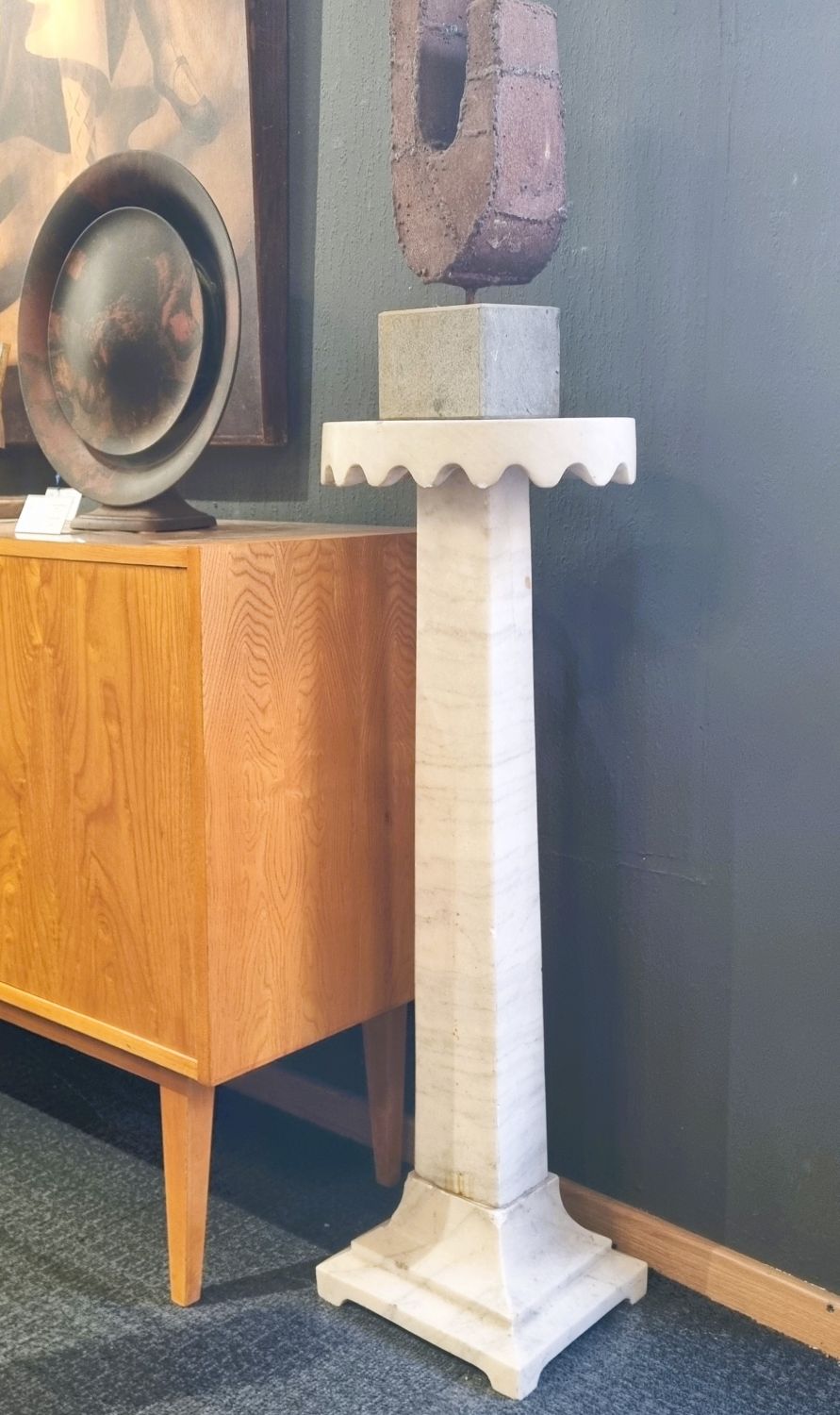 Márvány posztamens az 1920-as évekből. Önálló díszítő funkciót tölt be az enteriőrben de kültéren is használható. Letisztult formavilága miatt antik és modern környezetben is elegánsan mutat . Korának megfelelő állapotú. Méretei: 95 x 34 x 26 cm.