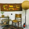 Modern gyapjú faliszőnyeg az 1970-es évekből, mely kávébarna alapon, élénk nonfigartív mintával nagyszerű dekoráció vintage és modern terkhez egyaránt. Szakadás,- és kopásmentes állapot.
