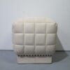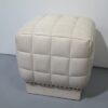 Egyszerű, de látványosan varrott (mű)bőrből készült, törtfehér színű, szegecsekkel díszített, kubista stílusú modern puff. Praktikus ülőhely, de a kanapé vagy hálószoba kiegészítőjeként lábtartónak is jól használható. Egyedi kialakítású, valószínűleg a 60-as vagy 70-es években készült, korához képest feltűnően jó újszerű állapotban van.