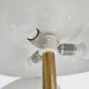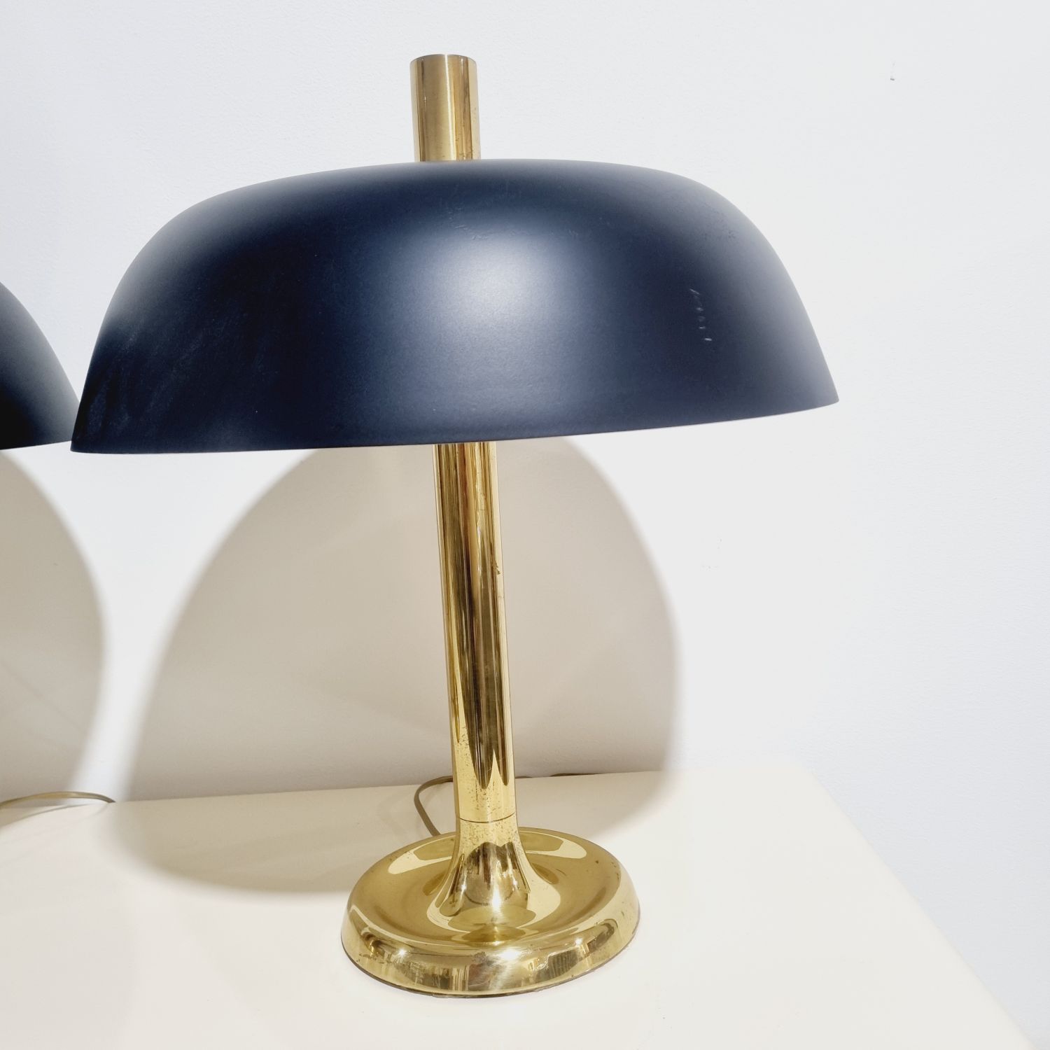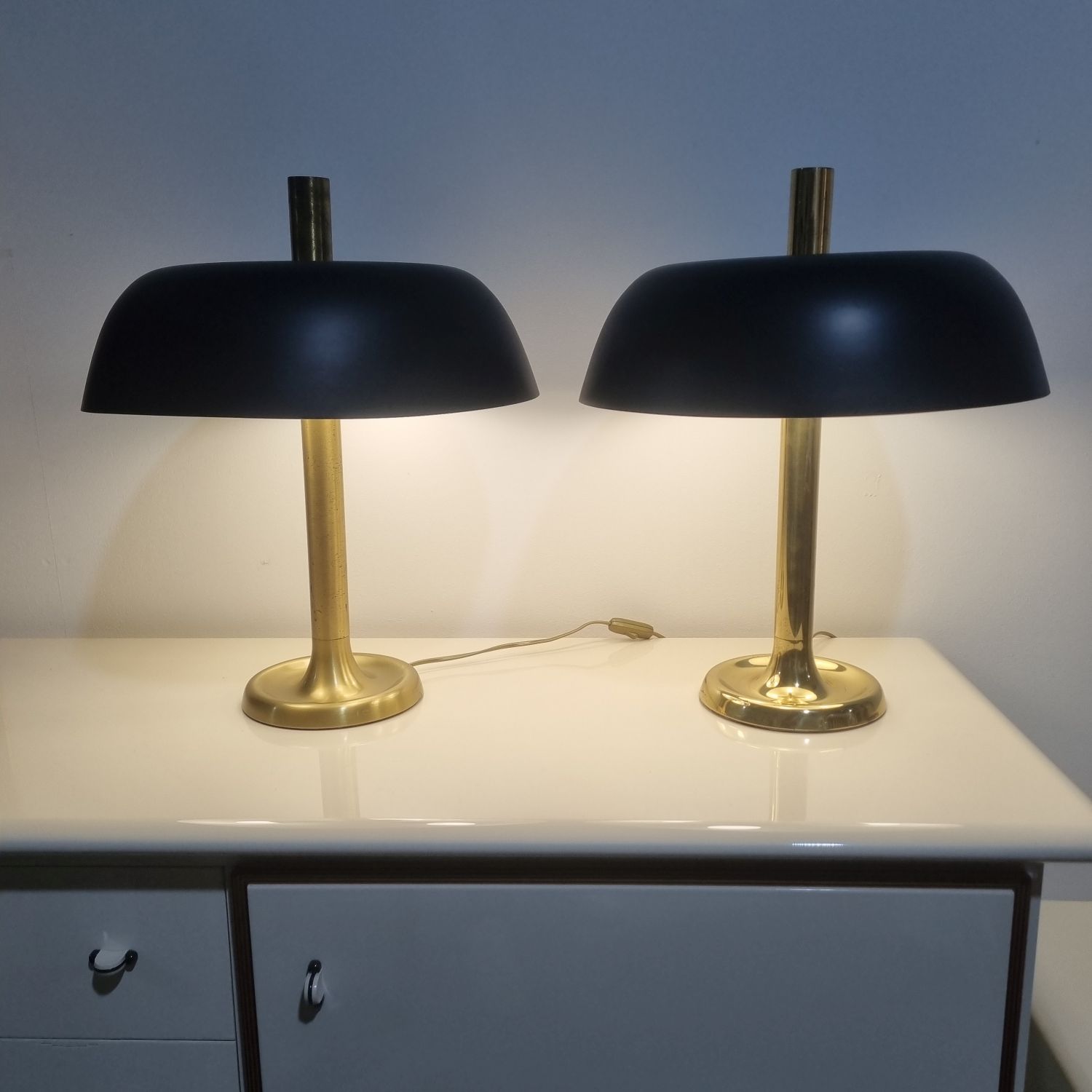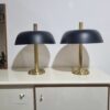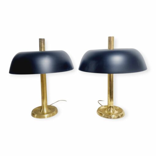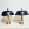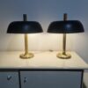 Vintage midcentury modern design gomba alakú asztali lámpa, 7377-es modell, Egon Hillebrand. Németországban készült az 1970-es években. Sárgaréz talp, a búra matt fekete fém. A lámpa pár működőképes állapotban van, elektronikusan felújítva. Egyik darab fényes felületű a másik matt színű réz. Méretek: 55cm magas x 45cm x 45cm.