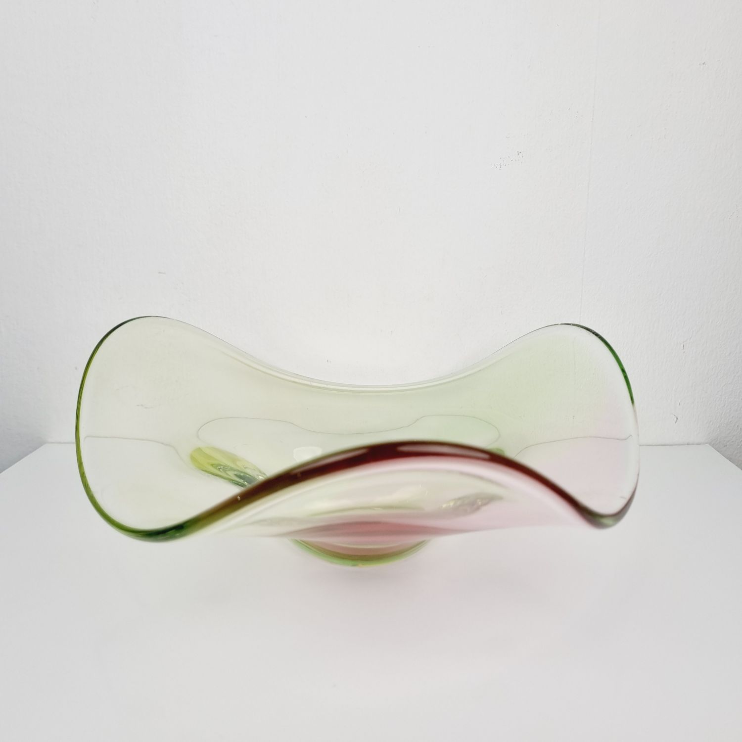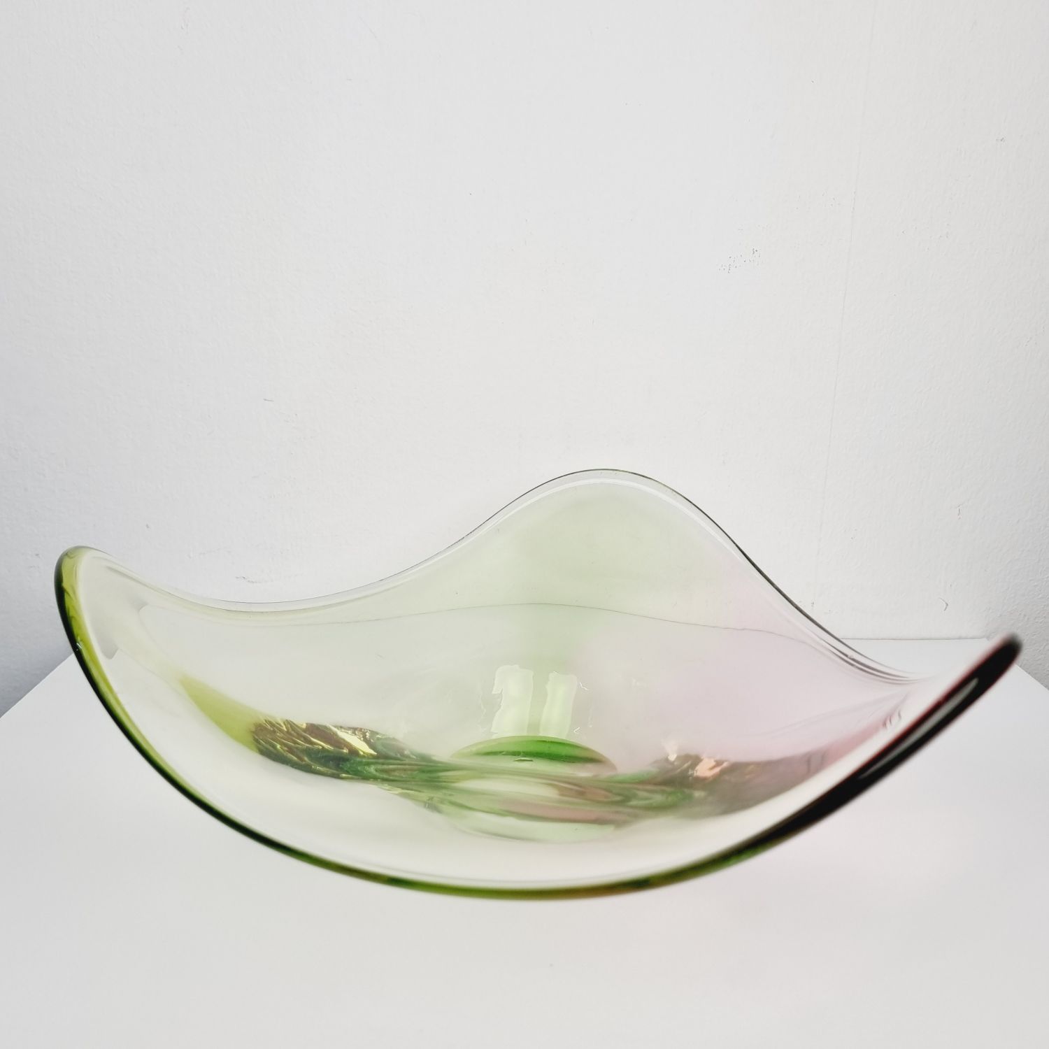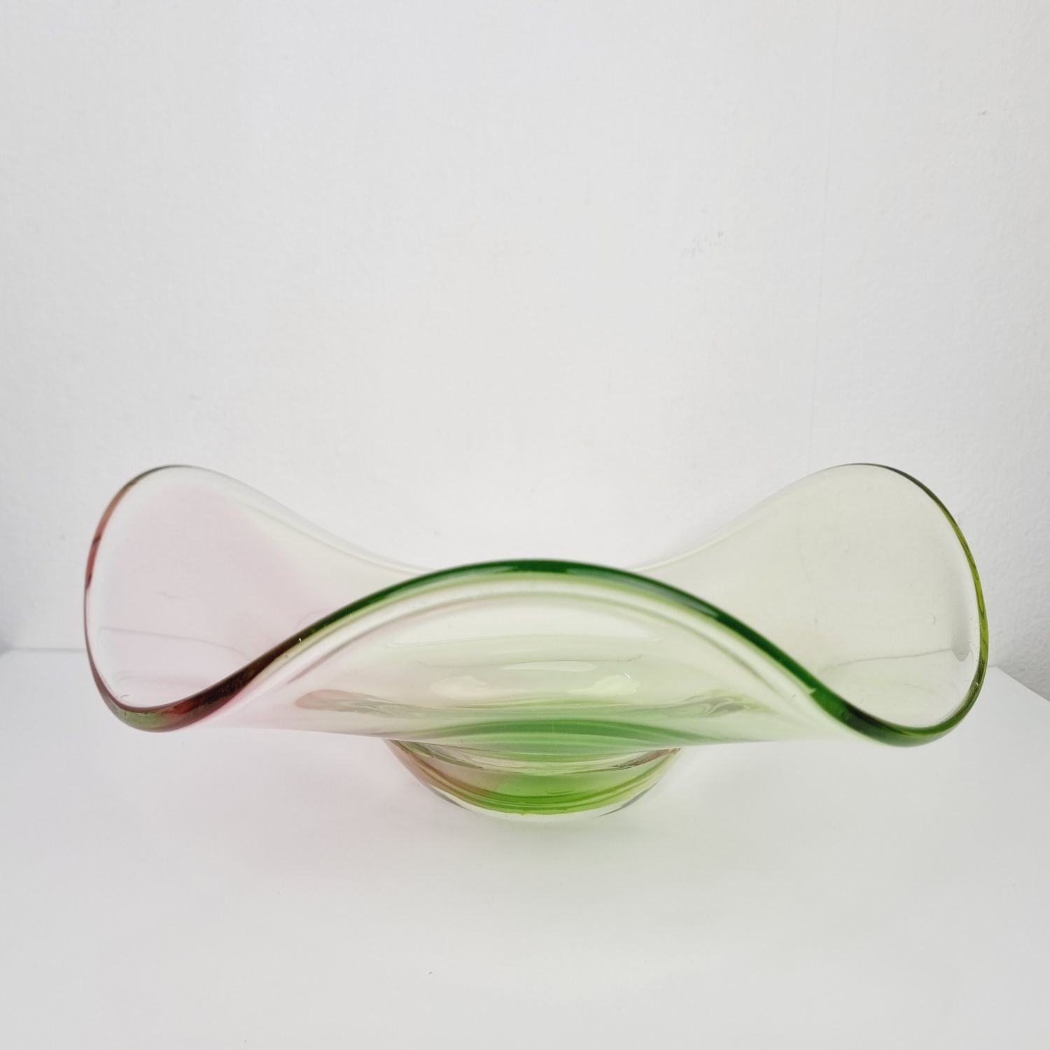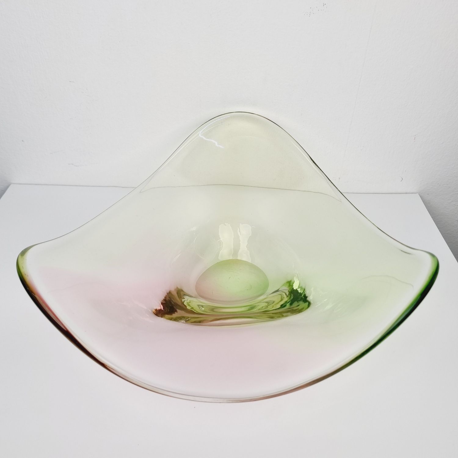 Muranói uránüveg asztalközép az 1970-es 80-as évekből. Gazdag, élénk színvilág, mesteri kivitelezés, exkluzív megjelenés jellemzi. Korának megfelelő állapotú. Méretei: 9 x 28 x 27 cm. Elegáns lakberendezési kiegészítő.