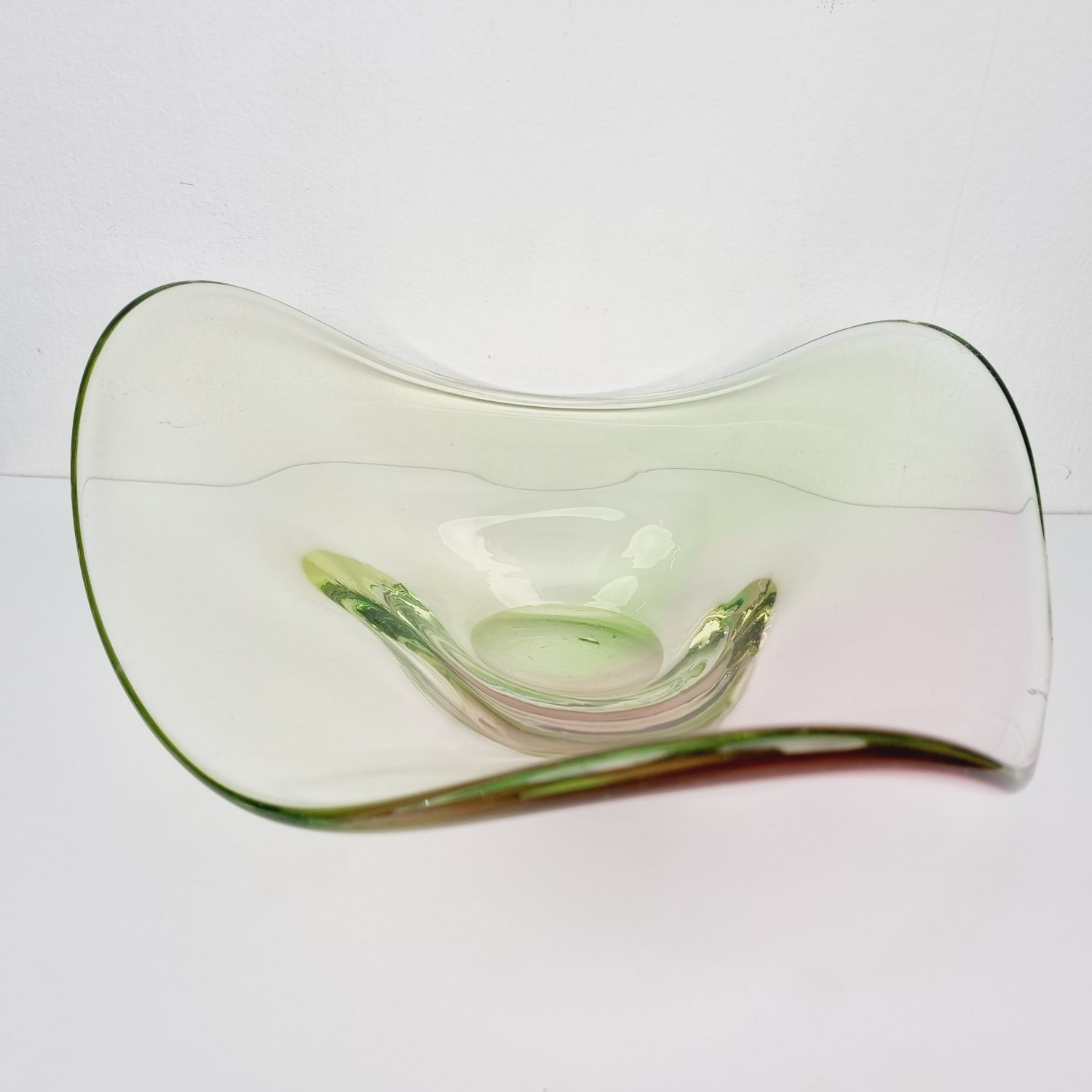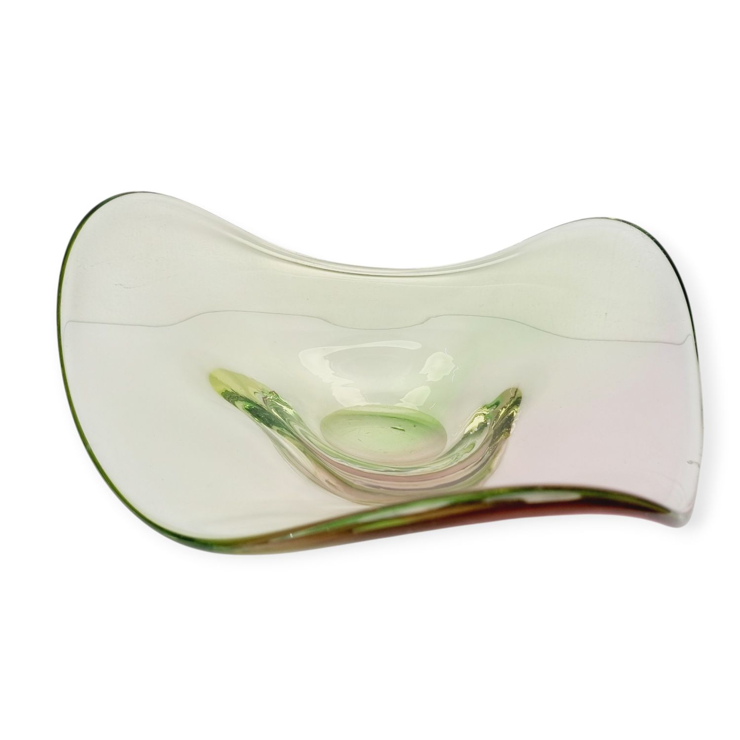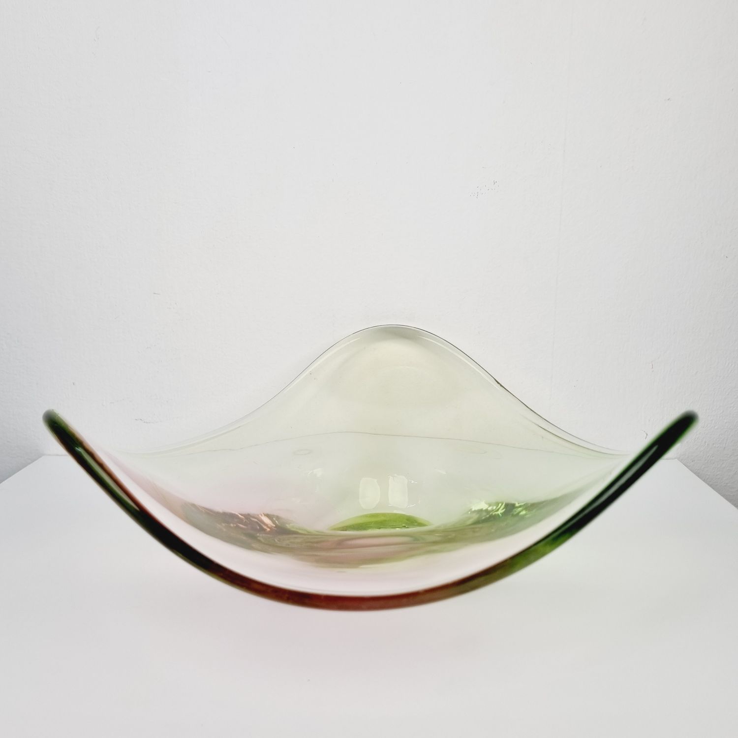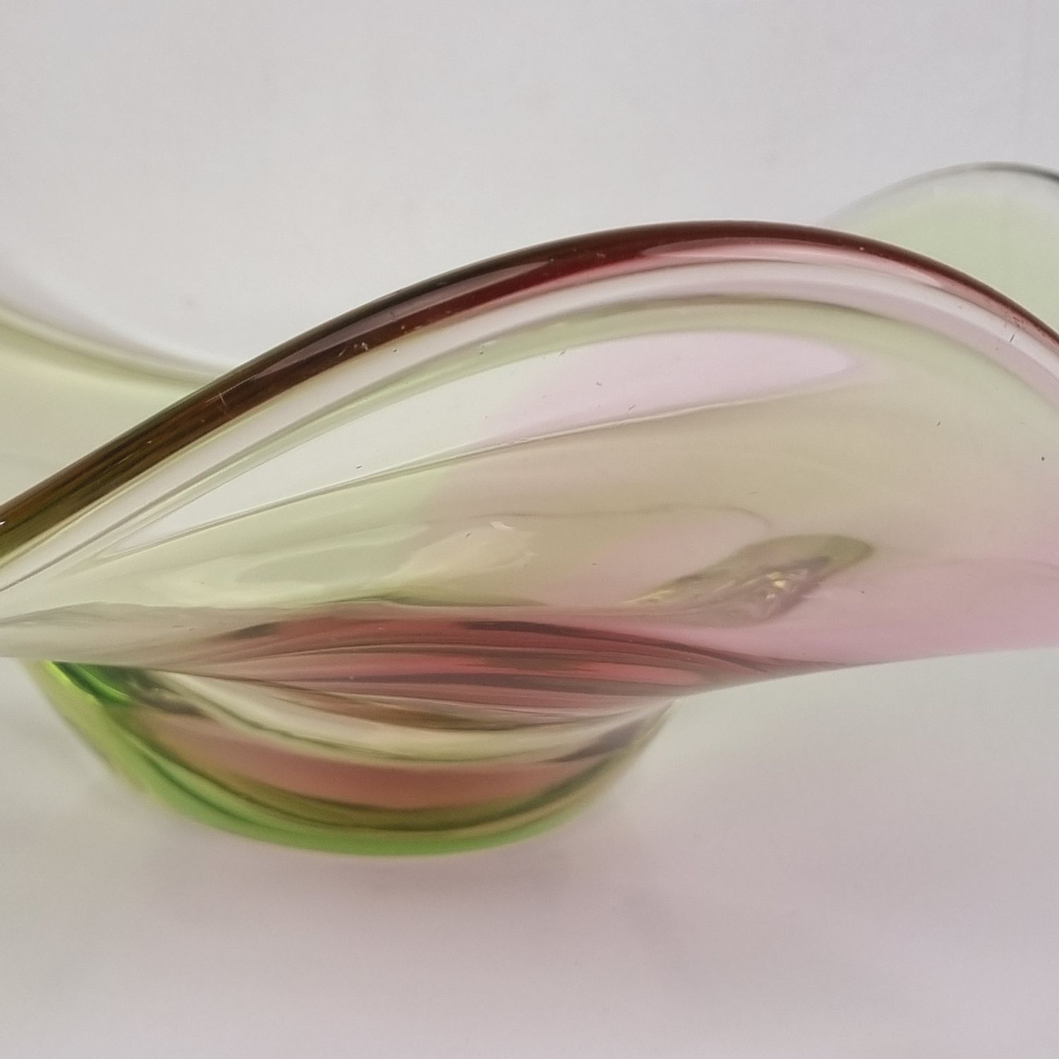 Muranói uránüveg asztalközép az 1970-es 80-as évekből. Gazdag, élénk színvilág, mesteri kivitelezés, exkluzív megjelenés jellemzi. Korának megfelelő állapotú. Méretei: 9 x 28 x 27 cm. Elegáns lakberendezési kiegészítő.