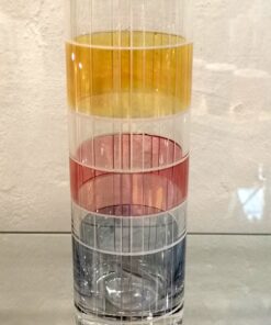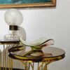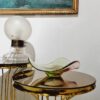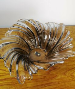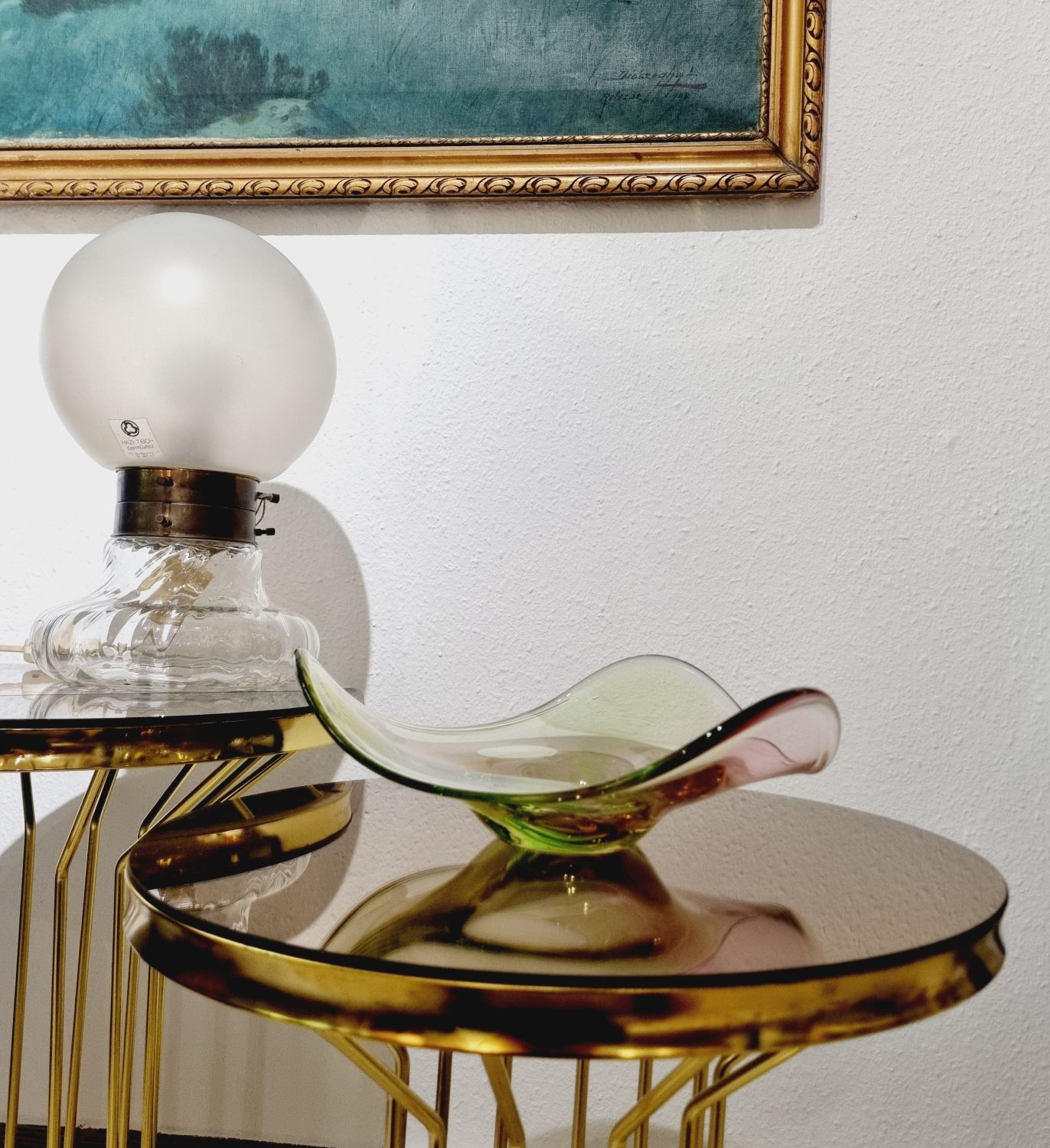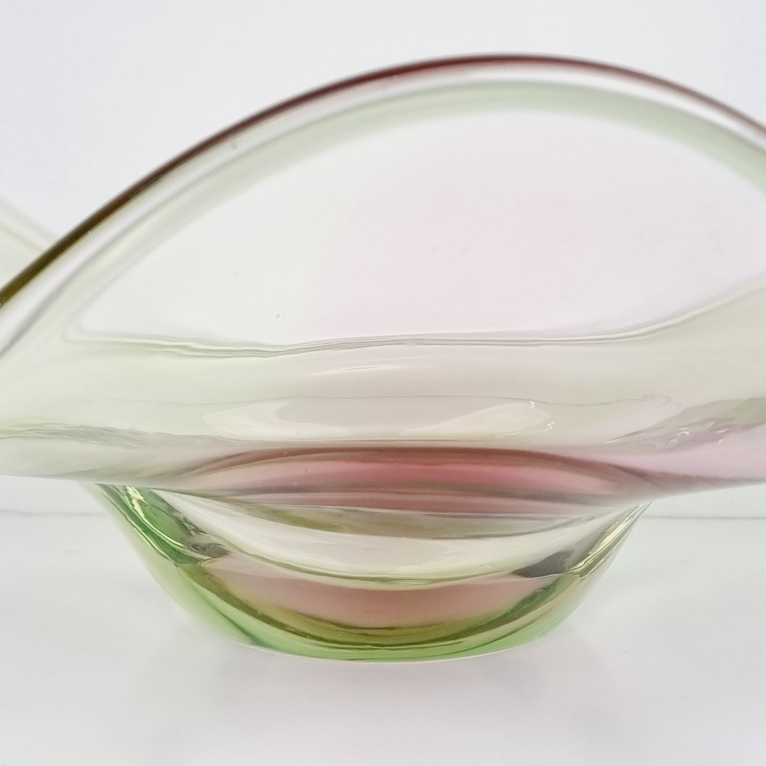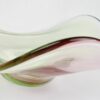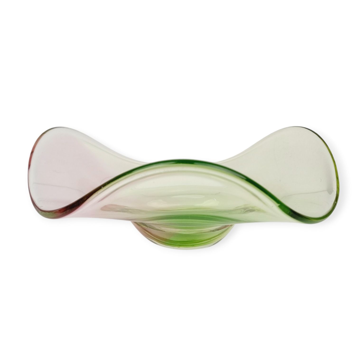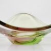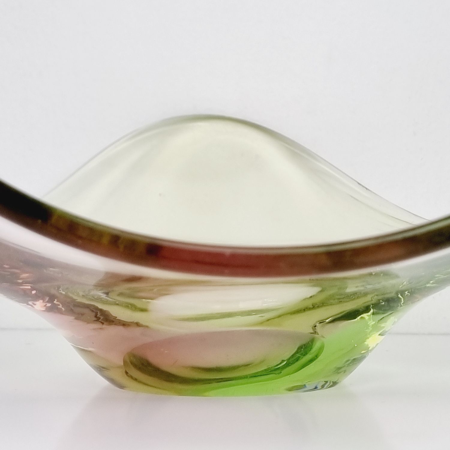 Muranói uránüveg asztalközép az 1970-es 80-as évekből. Gazdag, élénk színvilág, mesteri kivitelezés, exkluzív megjelenés jellemzi. Korának megfelelő állapotú. Méretei: 9 x 28 x 27 cm. Elegáns lakberendezési kiegészítő.