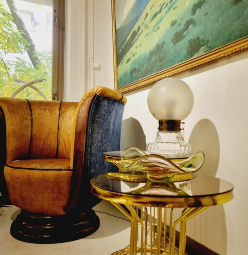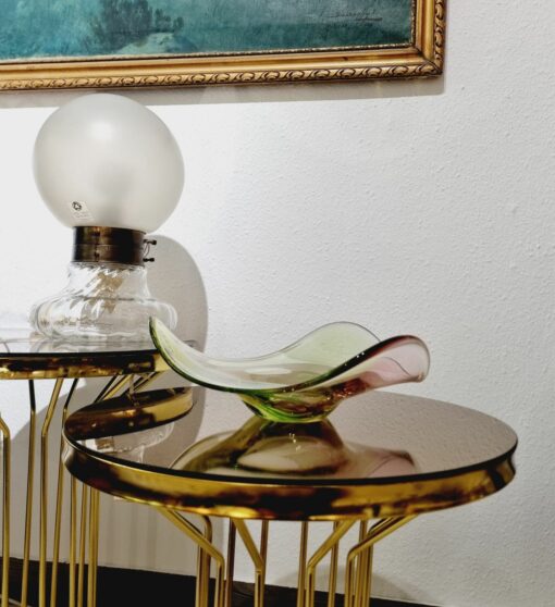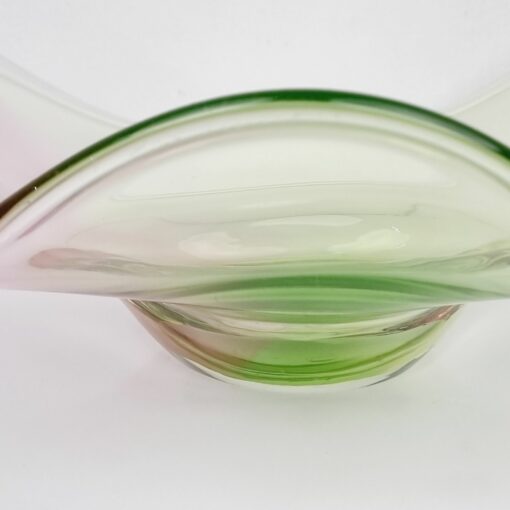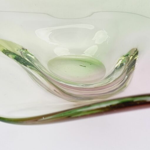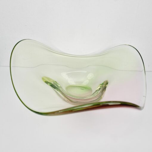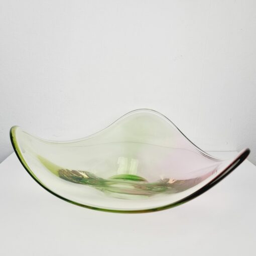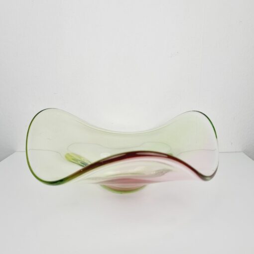 Muranói uránüveg asztalközép az 1970-es 80-as évekből. Gazdag, élénk színvilág, mesteri kivitelezés, exkluzív megjelenés jellemzi. Korának megfelelő állapotú. Méretei: 9 x 28 x 27 cm. Elegáns lakberendezési kiegészítő.