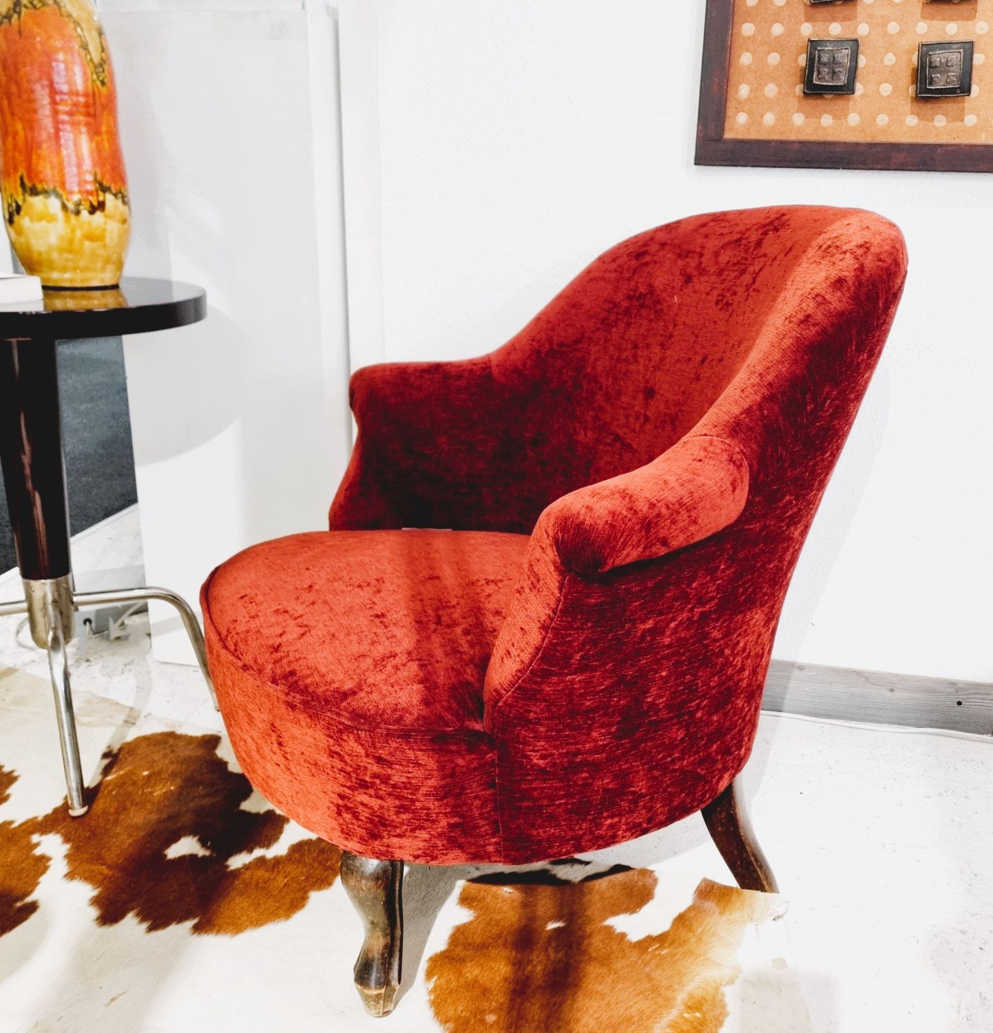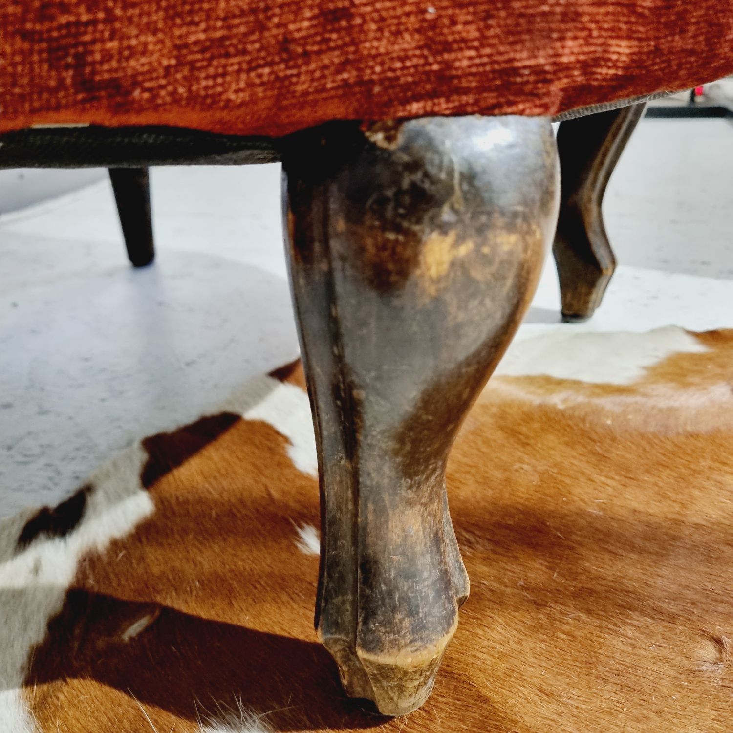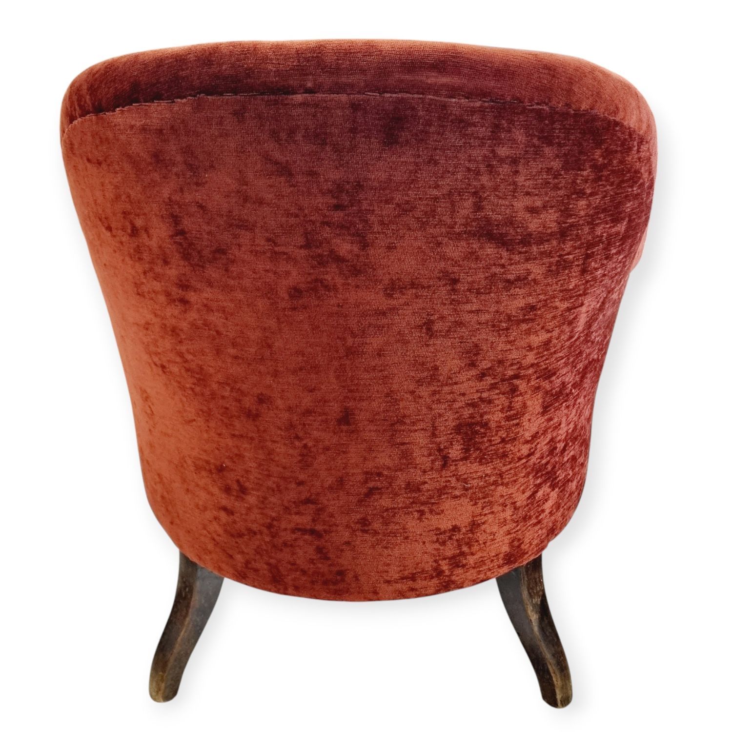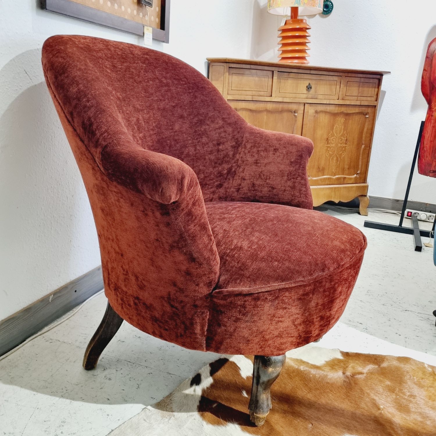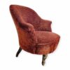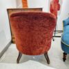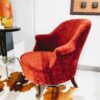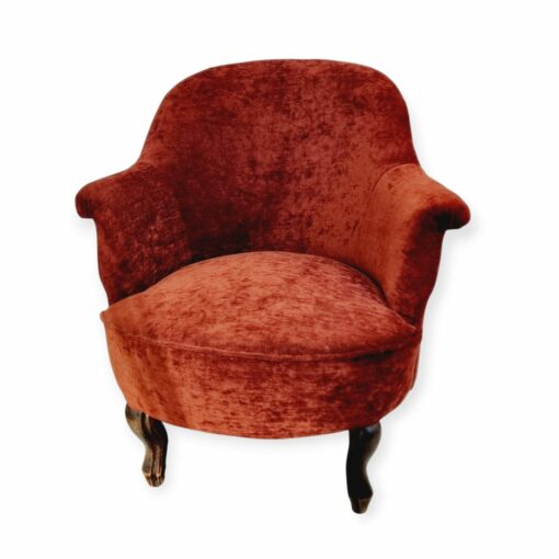 Fotel, vagy hálószobai karszék. Viktóriánus stílusú nőies bútordarab, szerkezetileg masszív és elegáns, élénk rozsdaszínű kárpitozással.