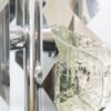 Krómozott csillár üveg búrával, Carlo Nason tervezte a Mazzega számára az 1970-es években. Modern design, letisztult formavilág, igazán különleges fényhatást kelt.