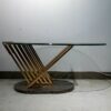 Dekoratív, elegáns márvány hatású kő és sárgaréz design dohányzóasztal ovális üveg lappal az 1980-as évekből. Klasszikus és modern enteriőrbe is beilleszthető.