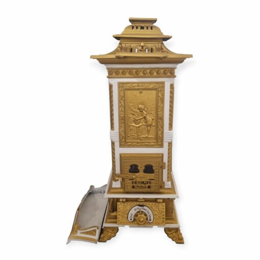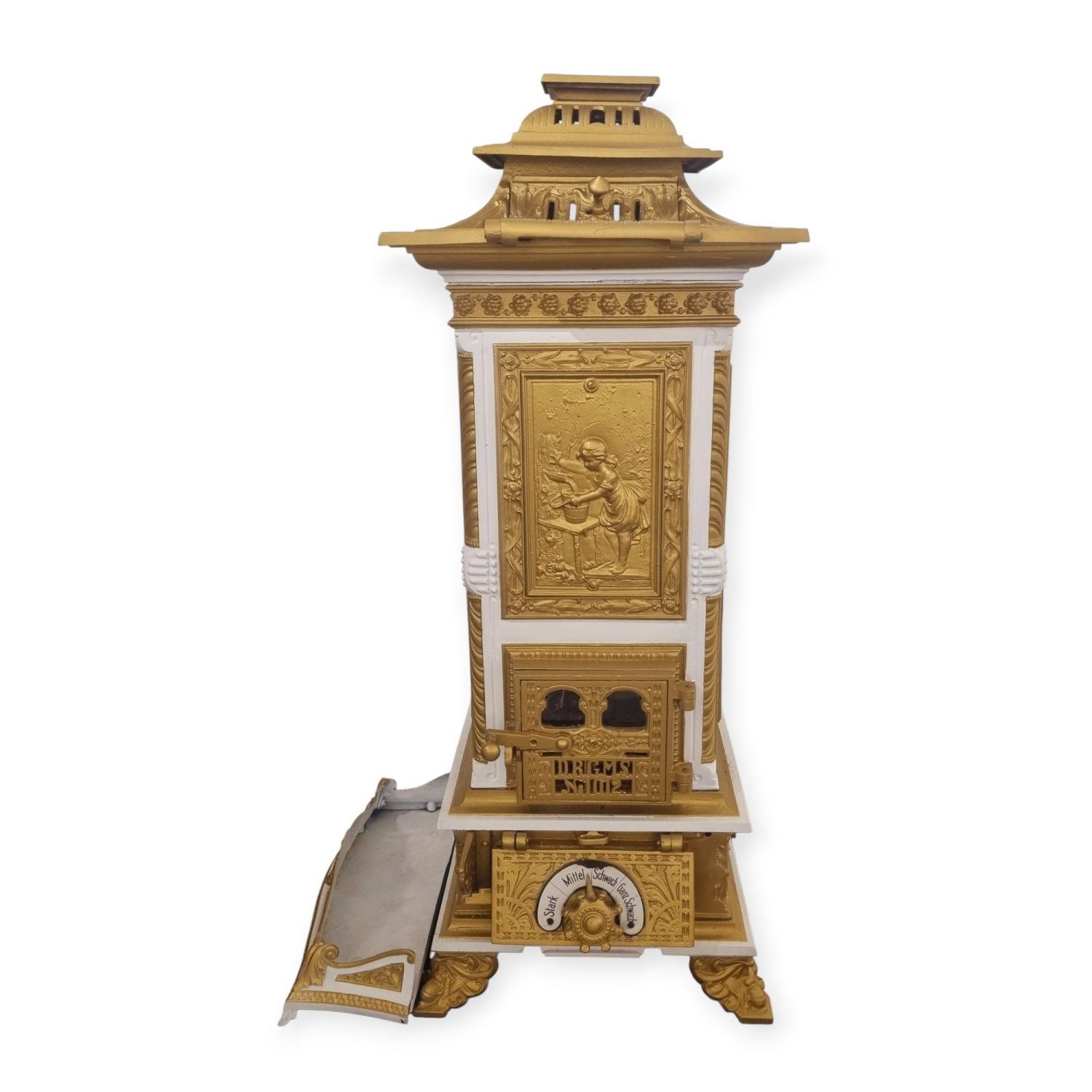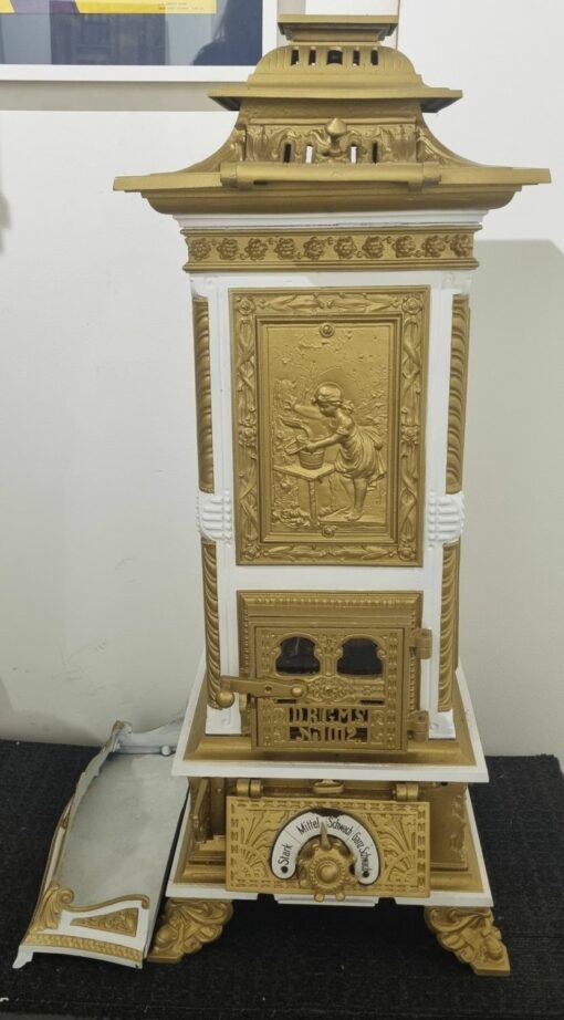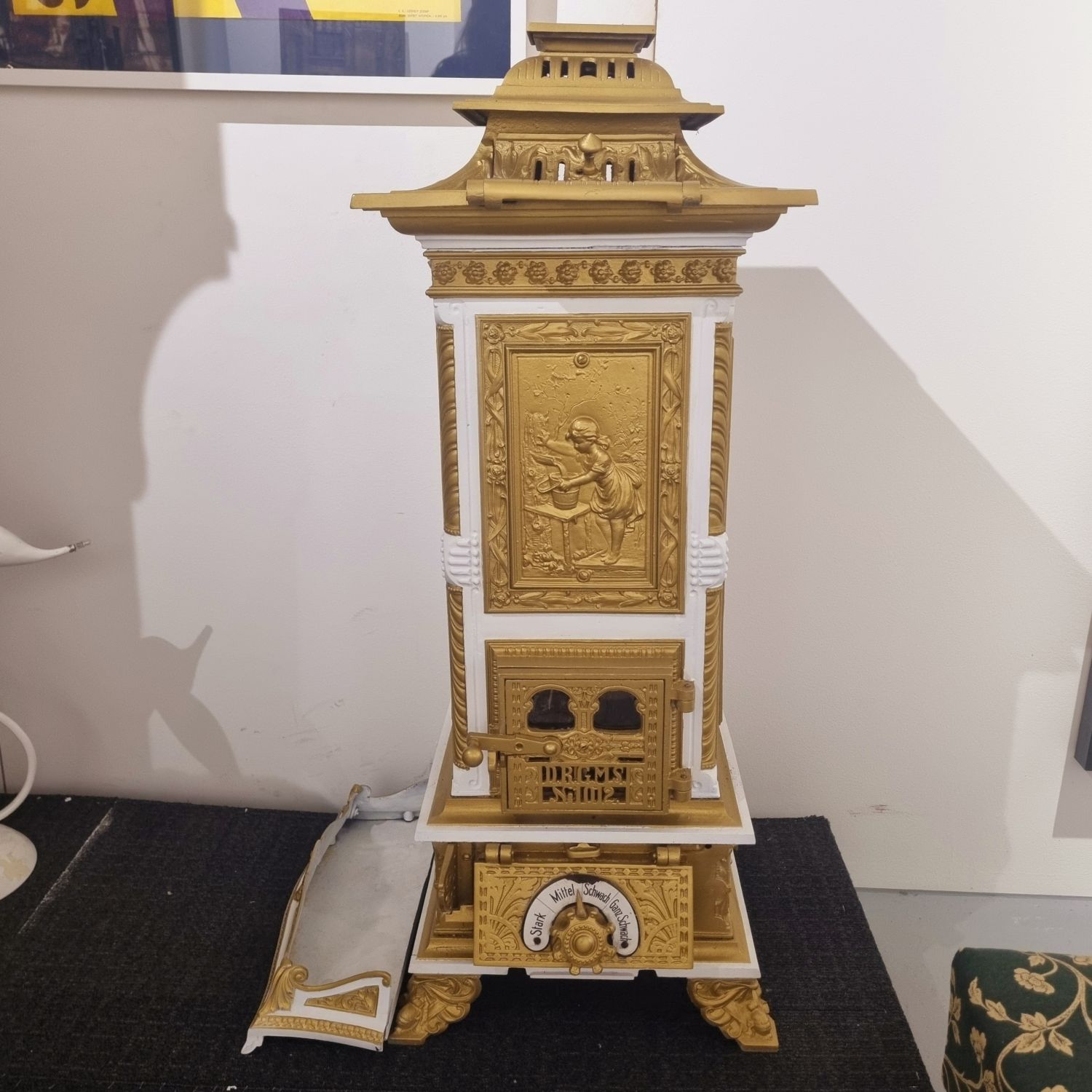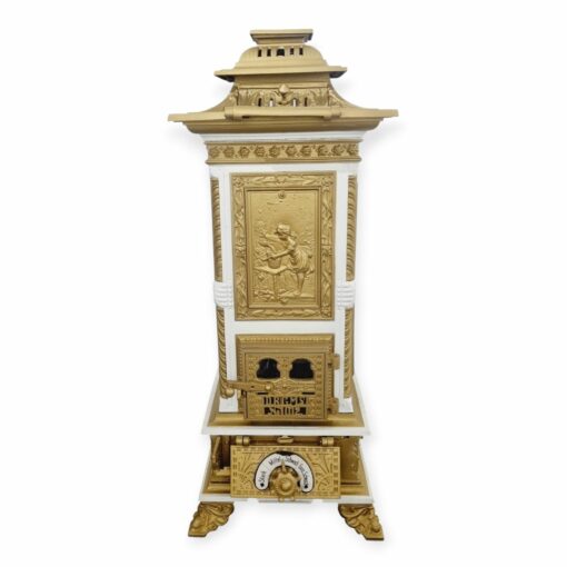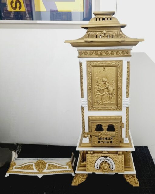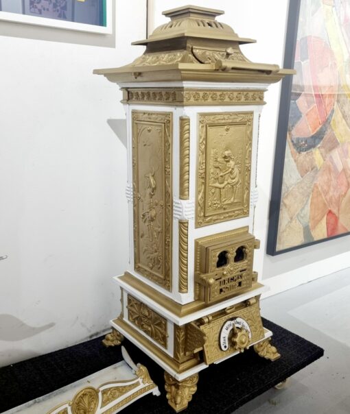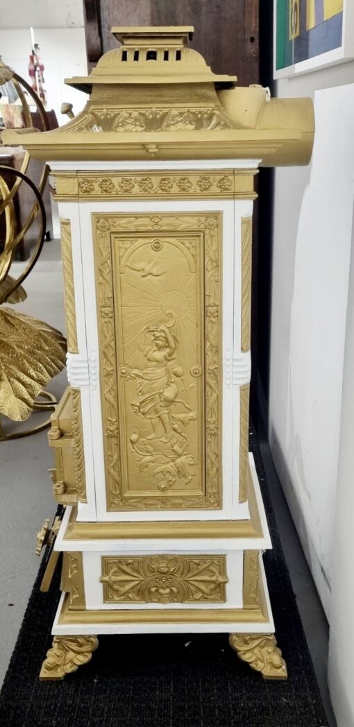 Öntöttvas kályha a XIX. sz. végéről. Gazdagon díszitett arany színű elemekkel, domborművekkel és oszlopszerű részletekkel.Eklektikus stílusú. Korának megfelelő állapotú. Méretei: 112x42x50cm