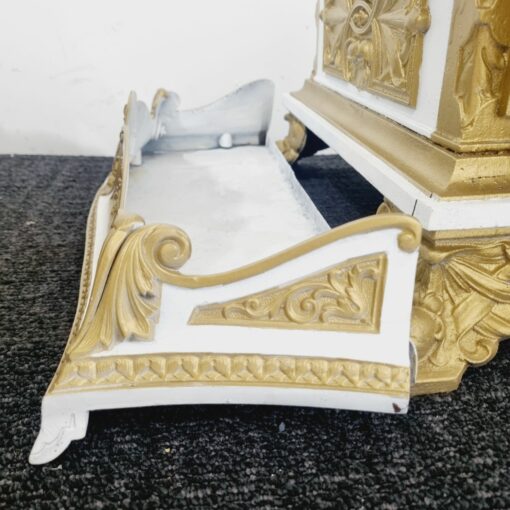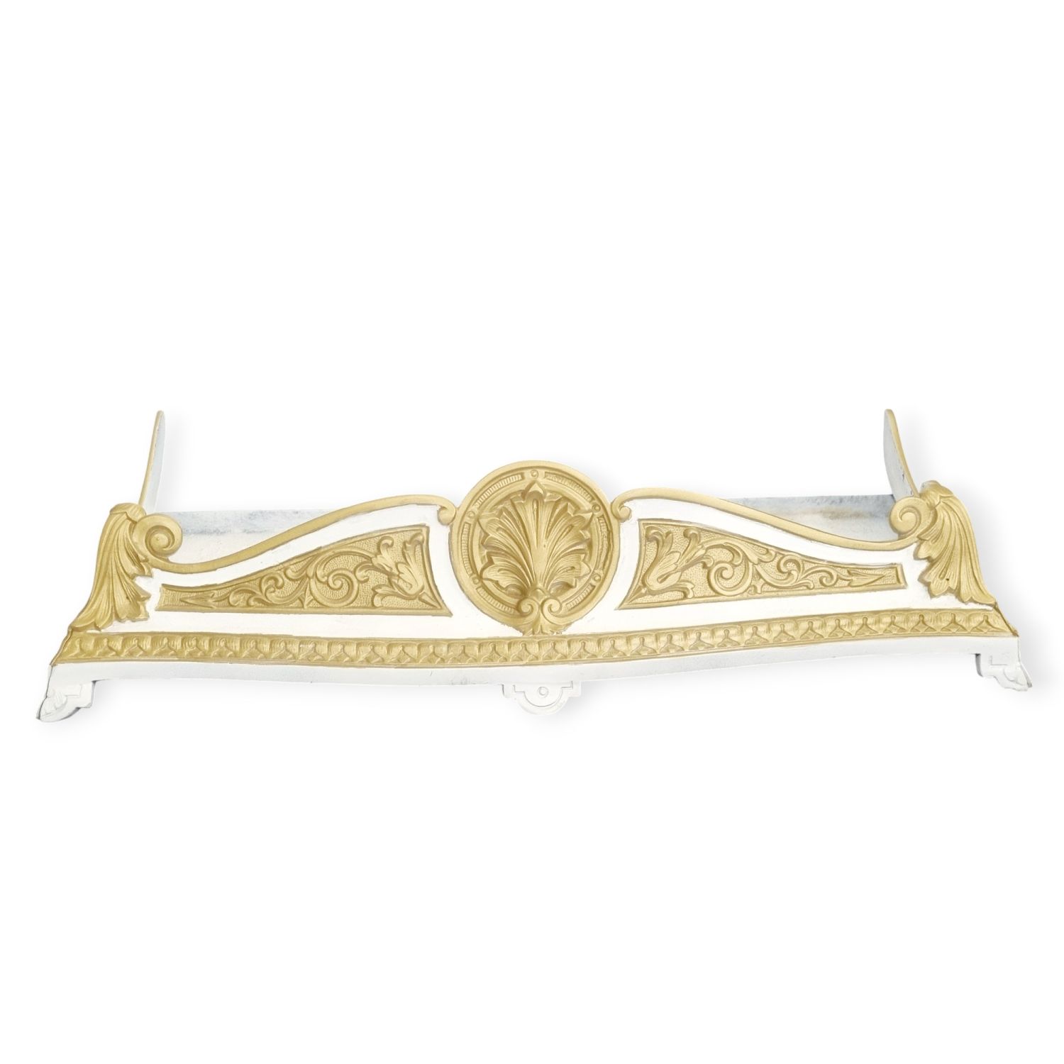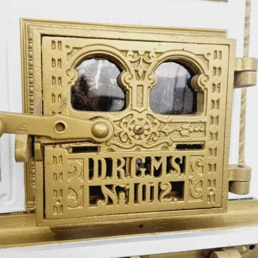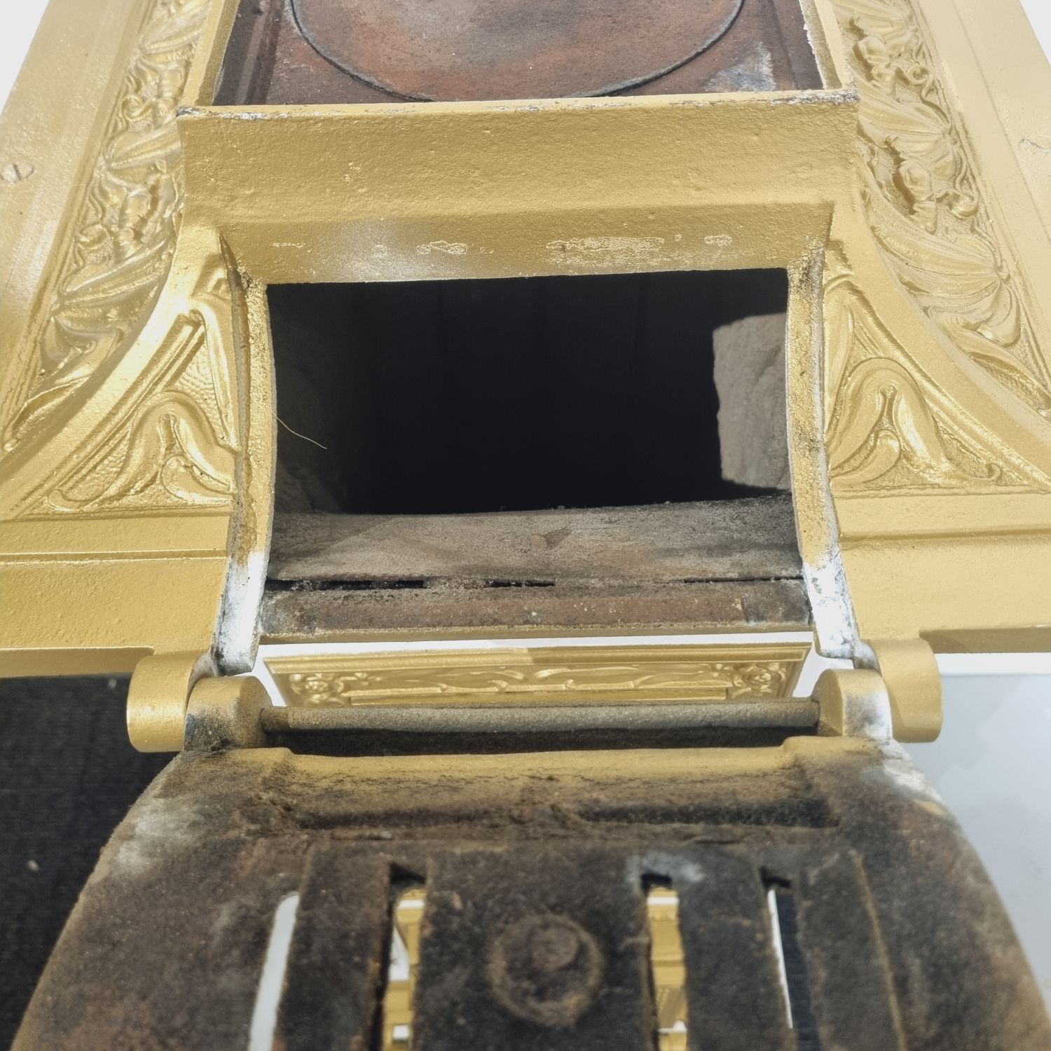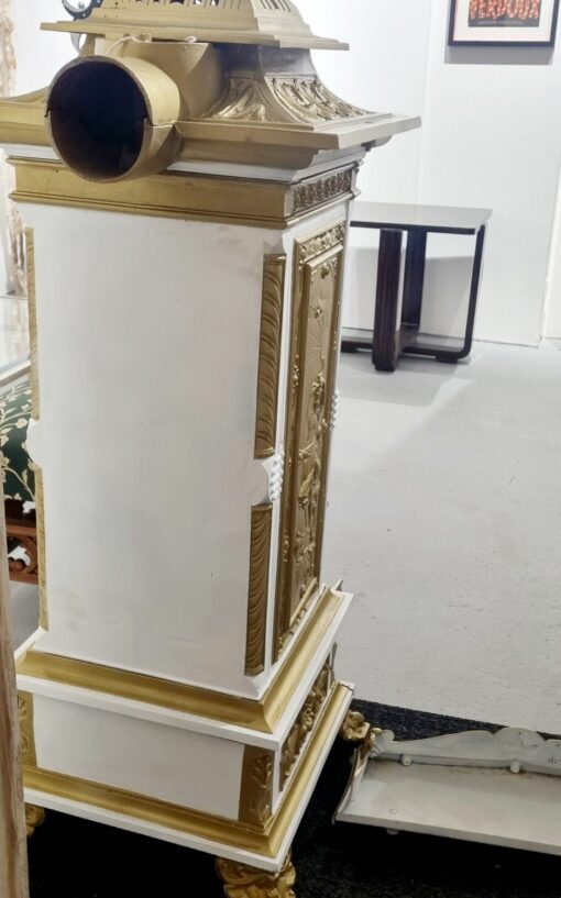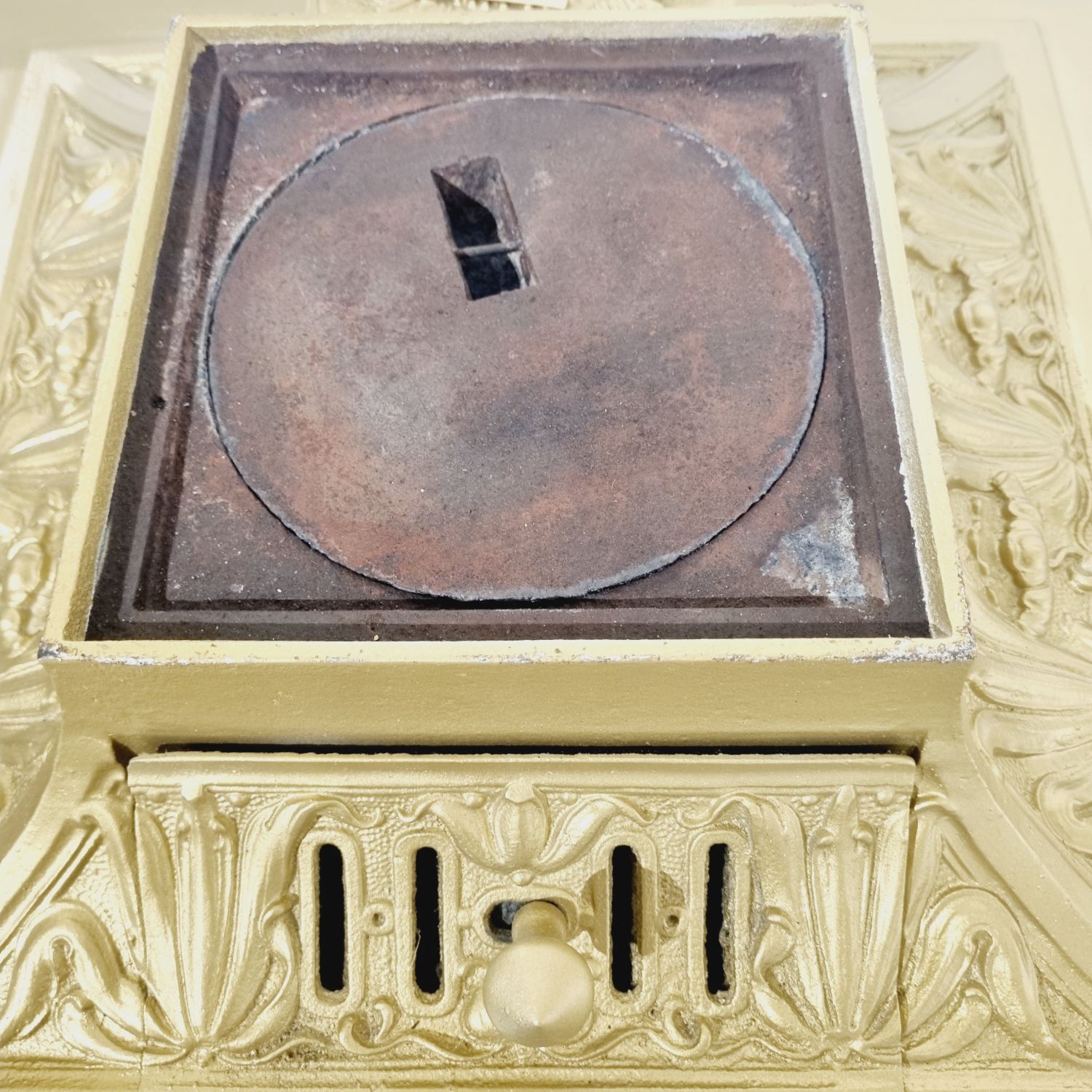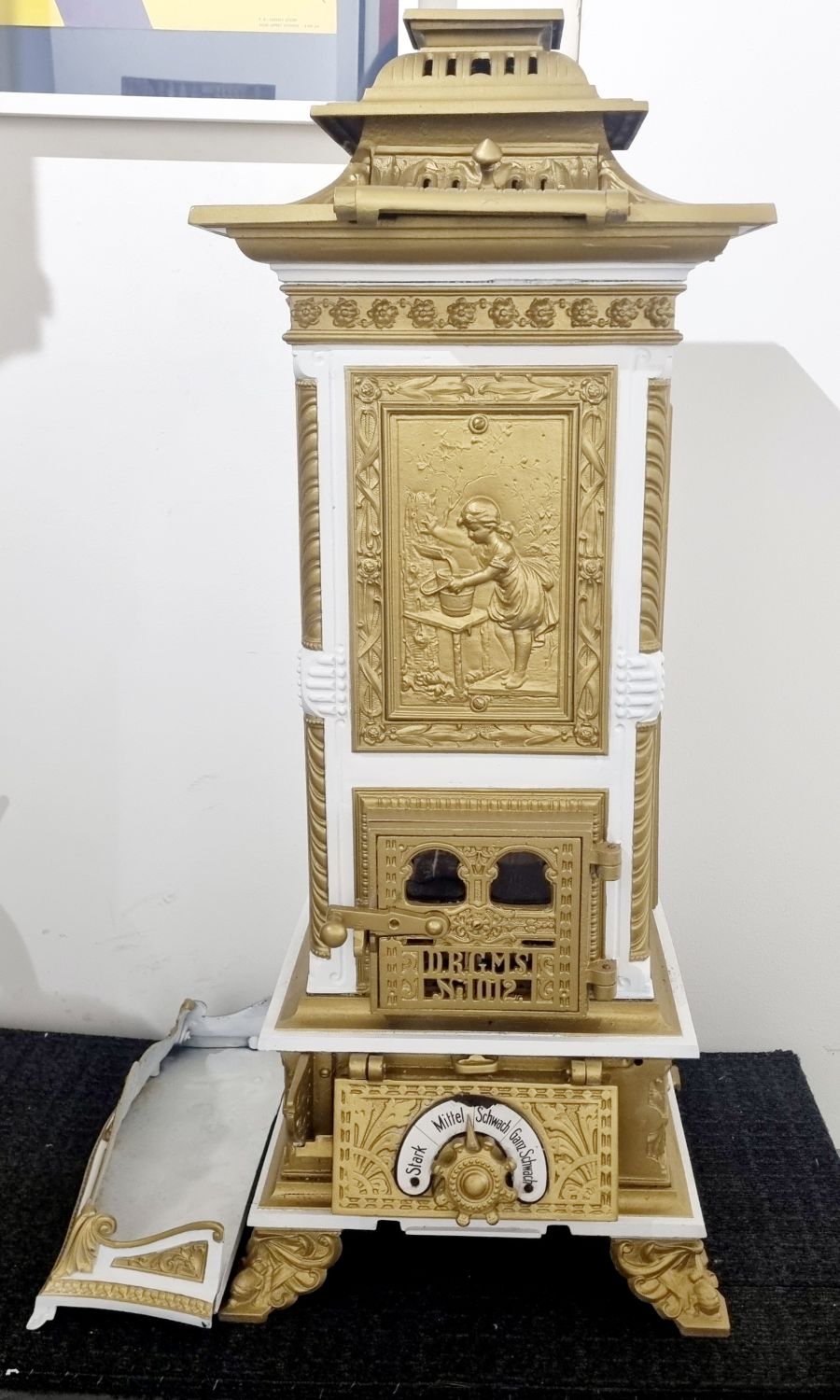 Öntöttvas kályha a XIX. sz. végéről. Gazdagon díszitett arany színű elemekkel, domborművekkel és oszlopszerű részletekkel.Eklektikus stílusú. Korának megfelelő állapotú. Méretei: 112x42x50cm