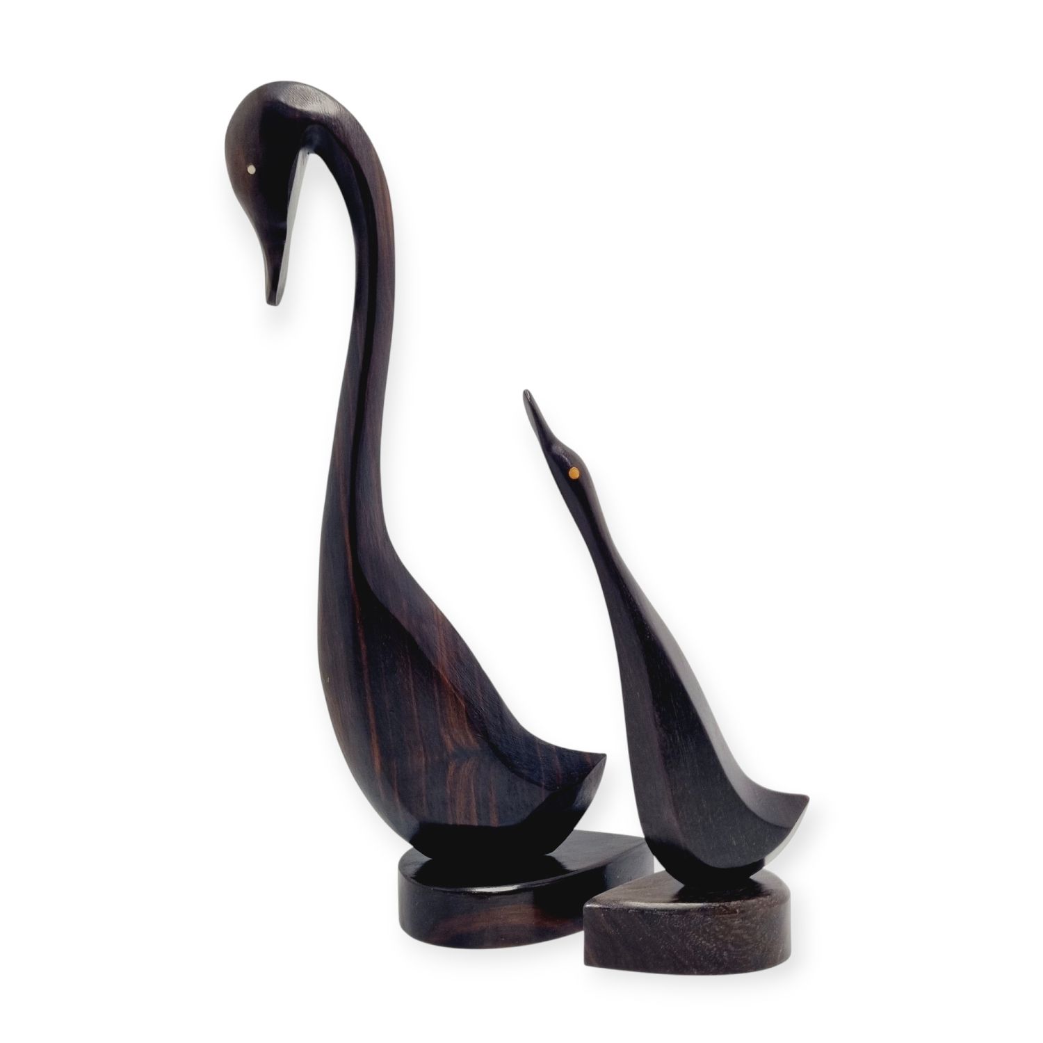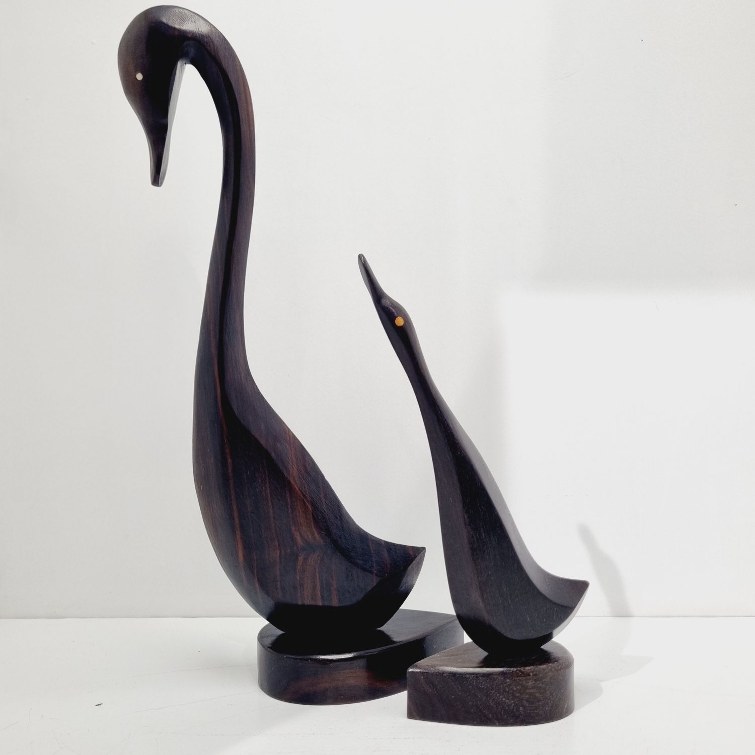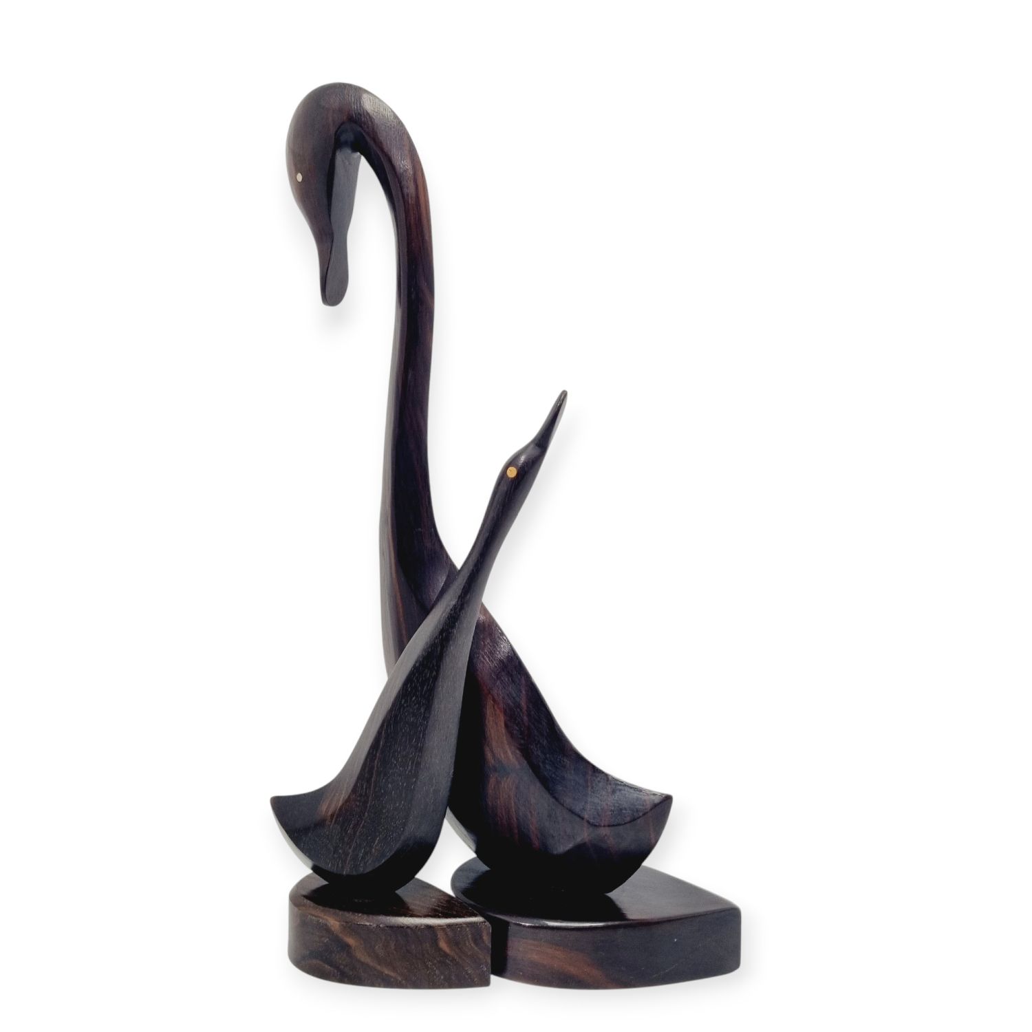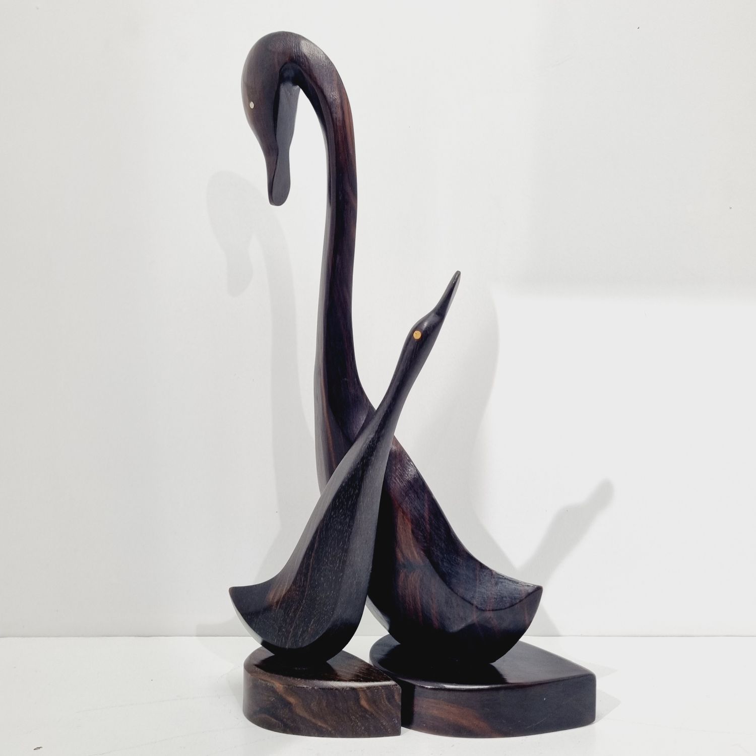 Páros hattyú figura, amely fából készült az 1980-as években. Feltehetőleg afrika eredetű kézzel készült alkotás, amely bájával kecsességével elegáns dísze rusztikus stílusú otthonunknak. Jó állapotú. Méretei: 35 x 25 x 10 cm.