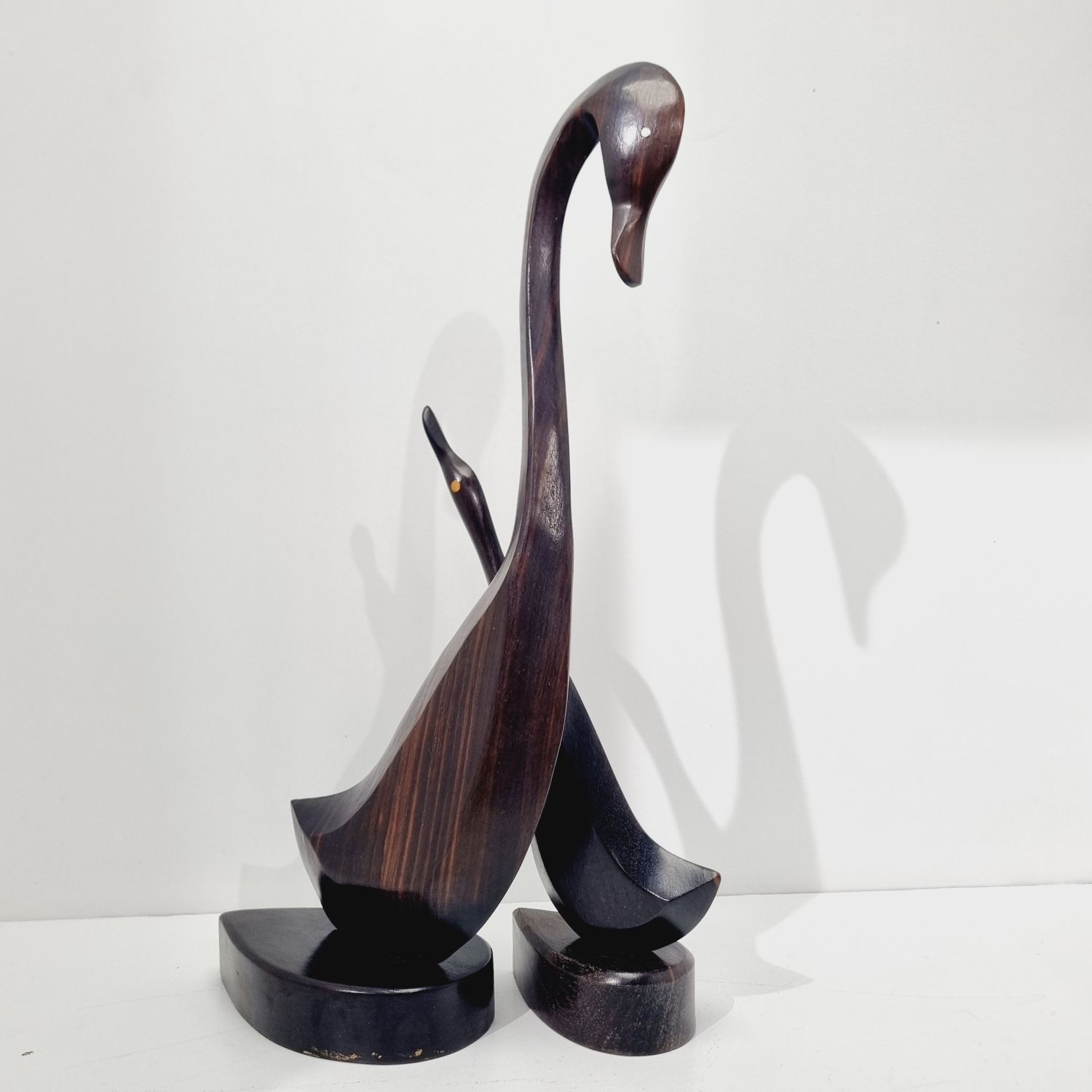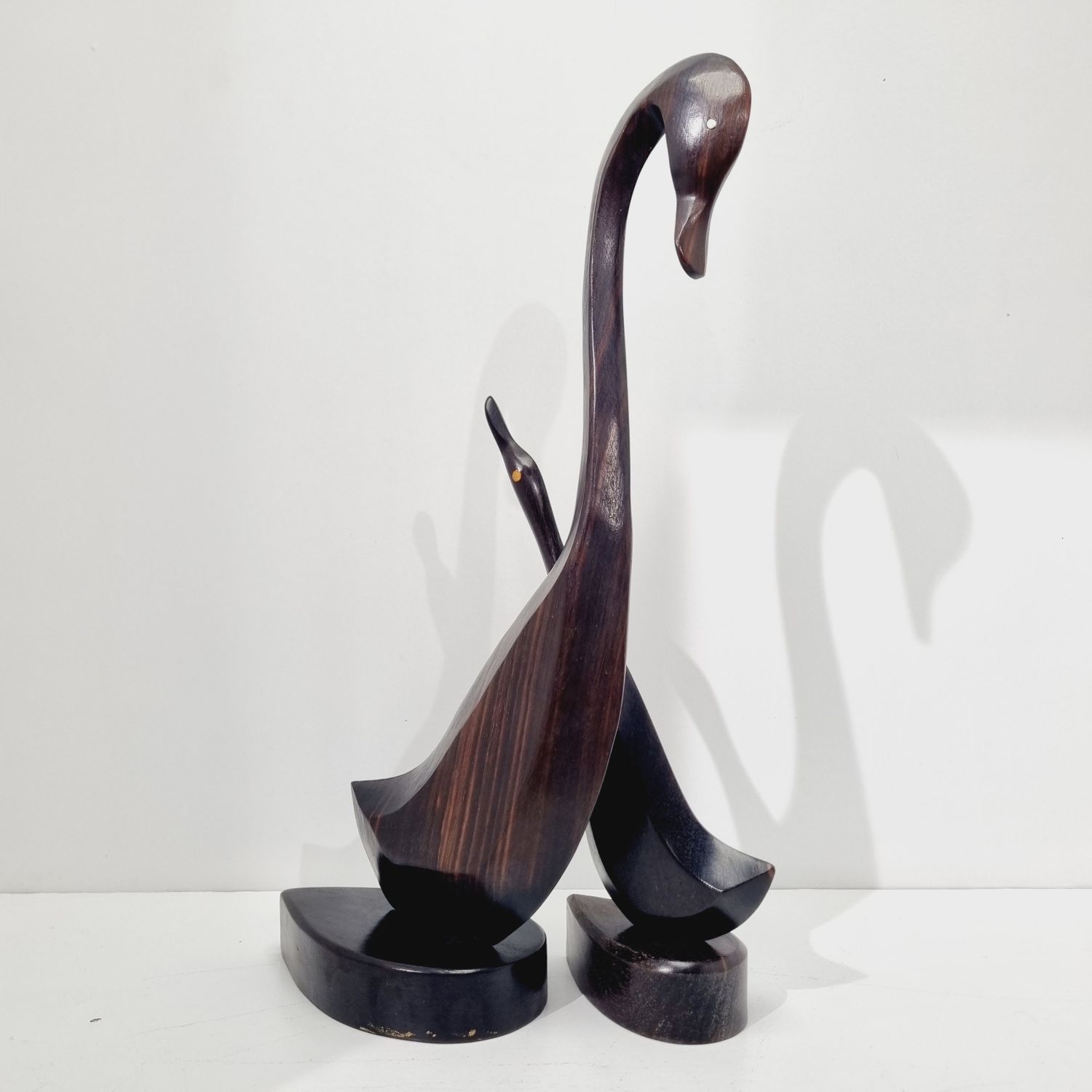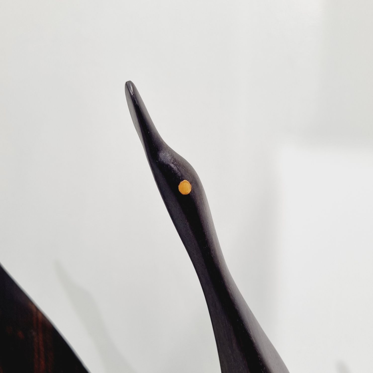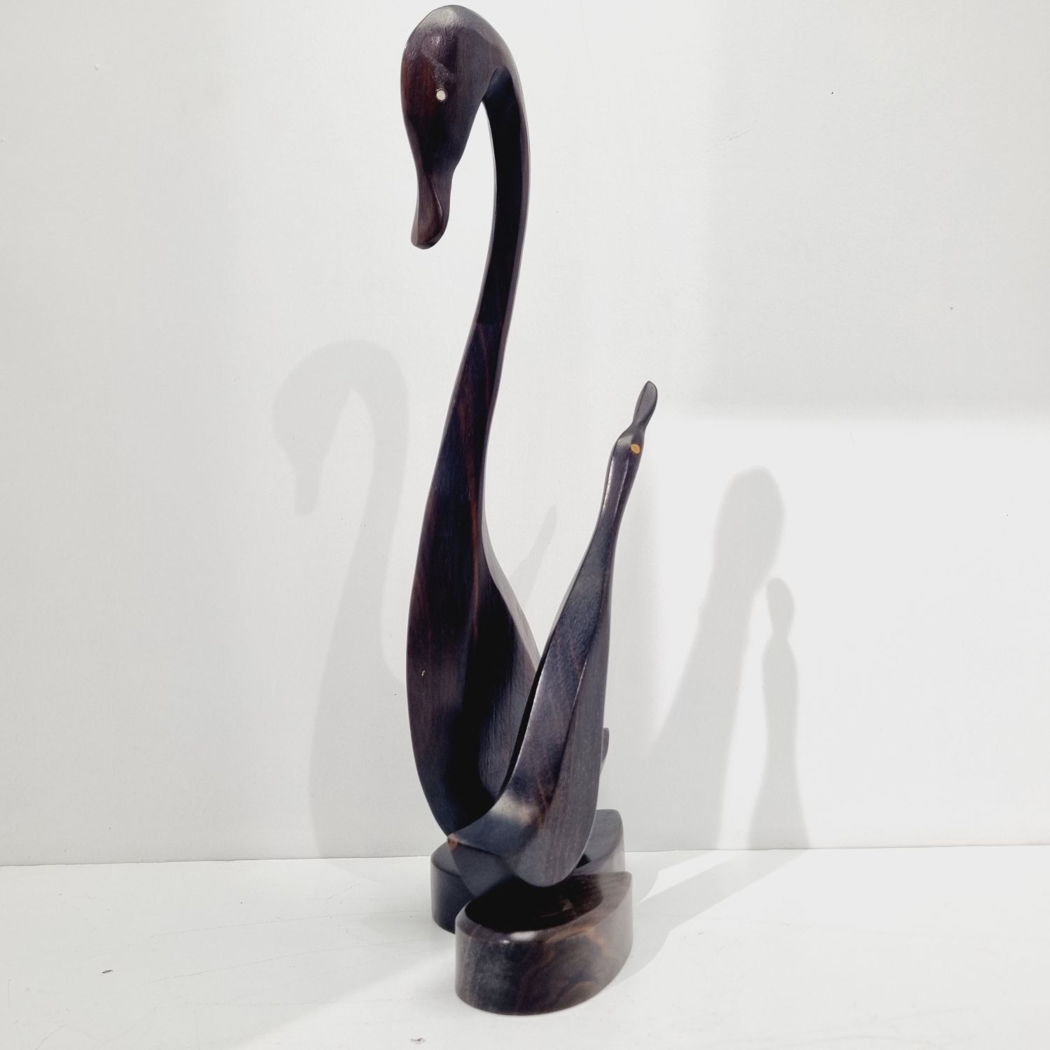 Páros hattyú figura, amely fából készült az 1980-as években. Feltehetőleg afrika eredetű kézzel készült alkotás, amely bájával kecsességével elegáns dísze rusztikus stílusú otthonunknak. Jó állapotú. Méretei: 35 x 25 x 10 cm.