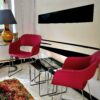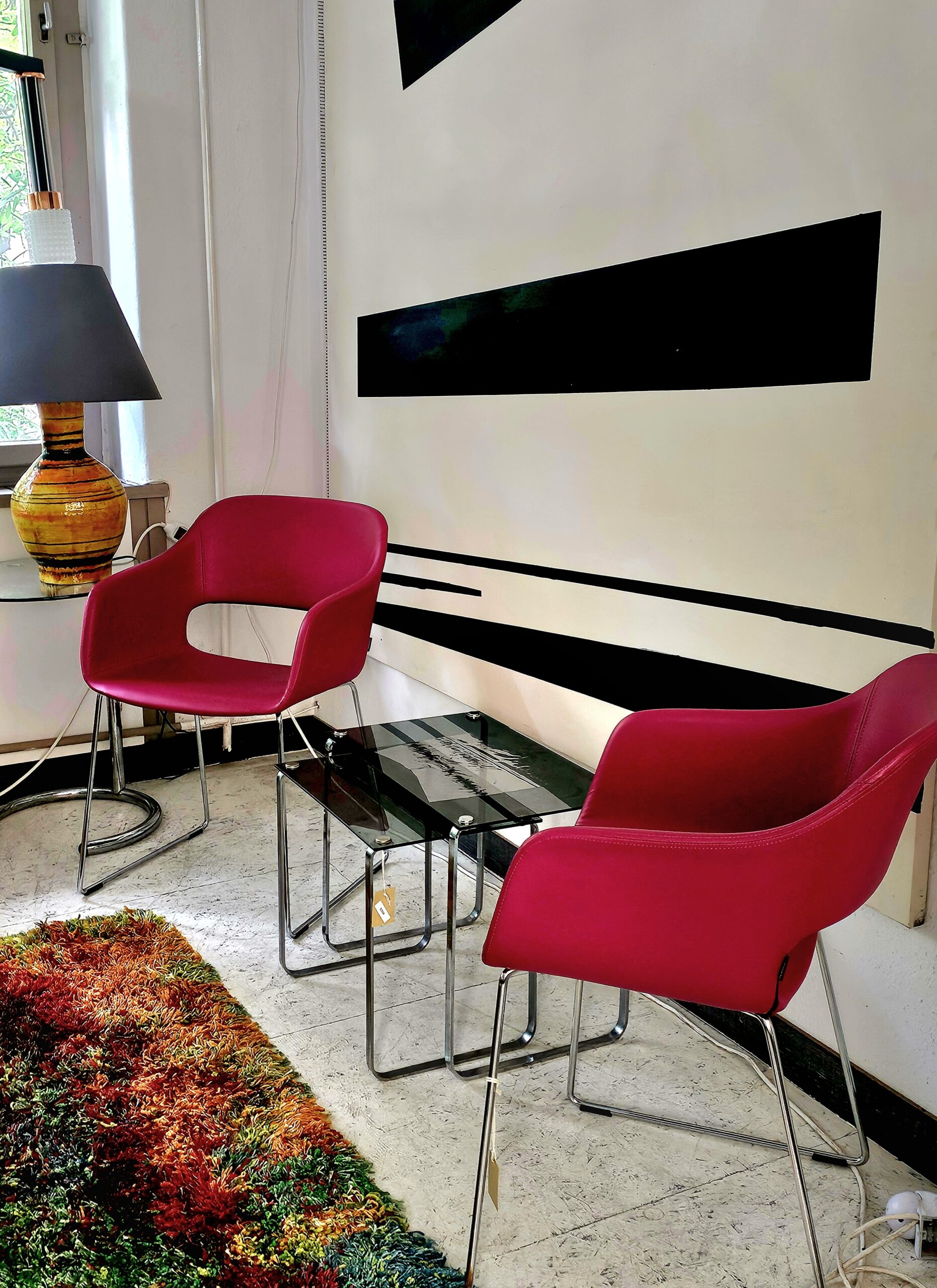 Klasszikus részletekkel rendelkező, maximális kényelmet nyújtó, egyéni tervezésű székek. Alkalmas beltéri környezetbe, dolgozószobába,váróterembe, irodába nappaliba is. Szánkótalpas, rozsdamentes acélszerkezetű könnyed stílusú lakberendezési darabok.Jó állapotú. Méretei: 78 x 53 x 53 cm.
