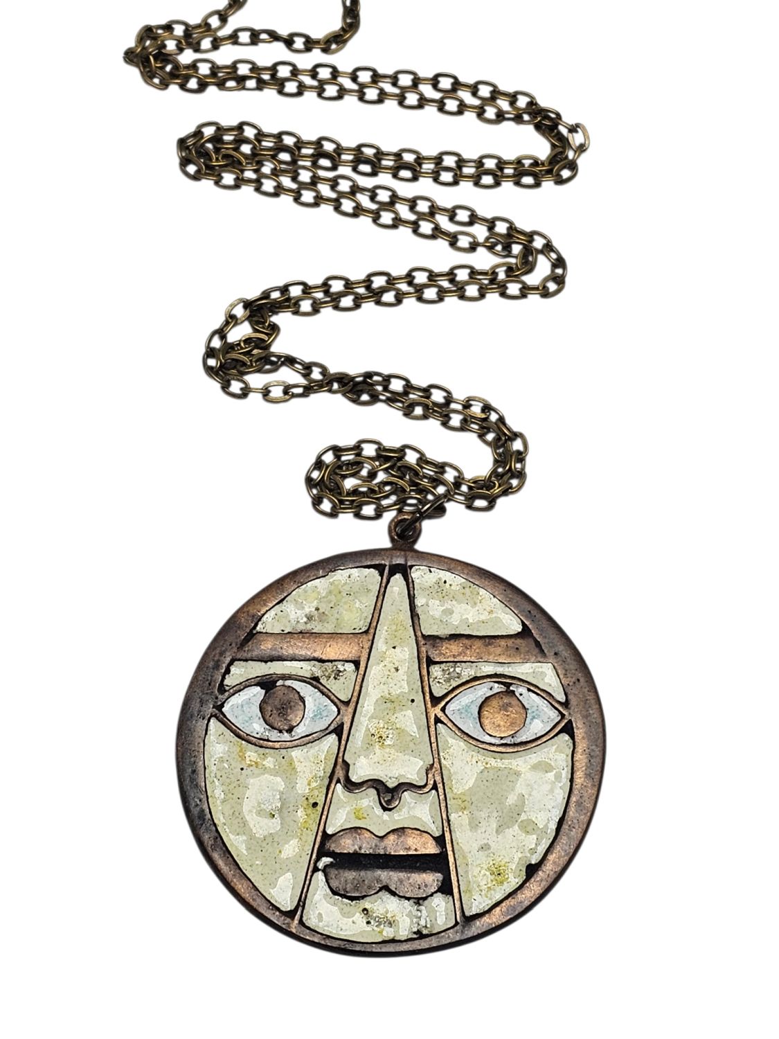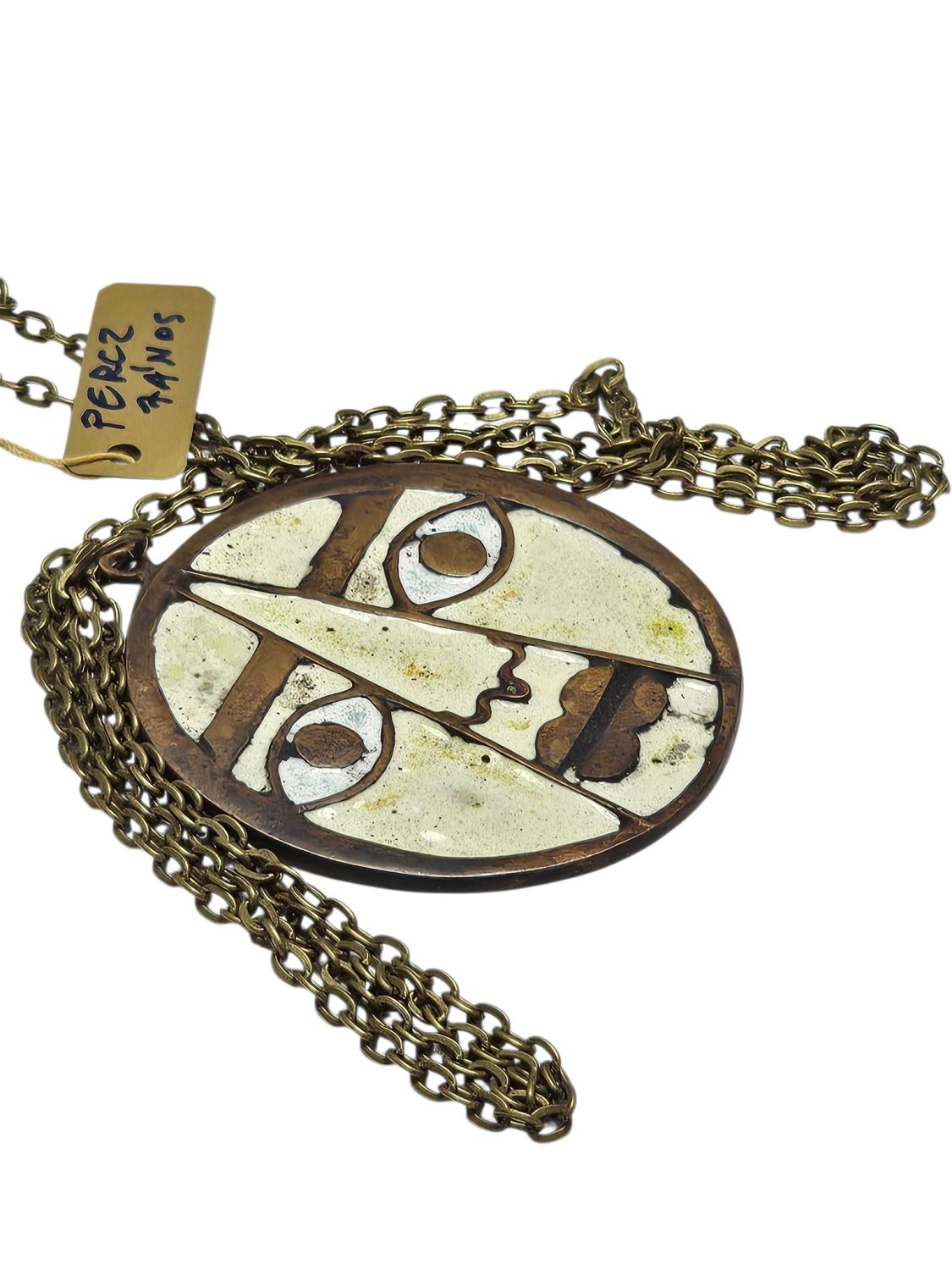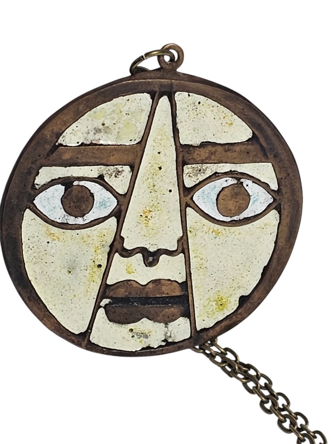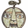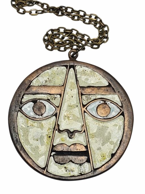Percz János tervezőművész alkotása a face-medál. Antik stílusú divatékszer amely fém és fehér zománcal van kitöltve.1970s évek. Jelzés nélküli.