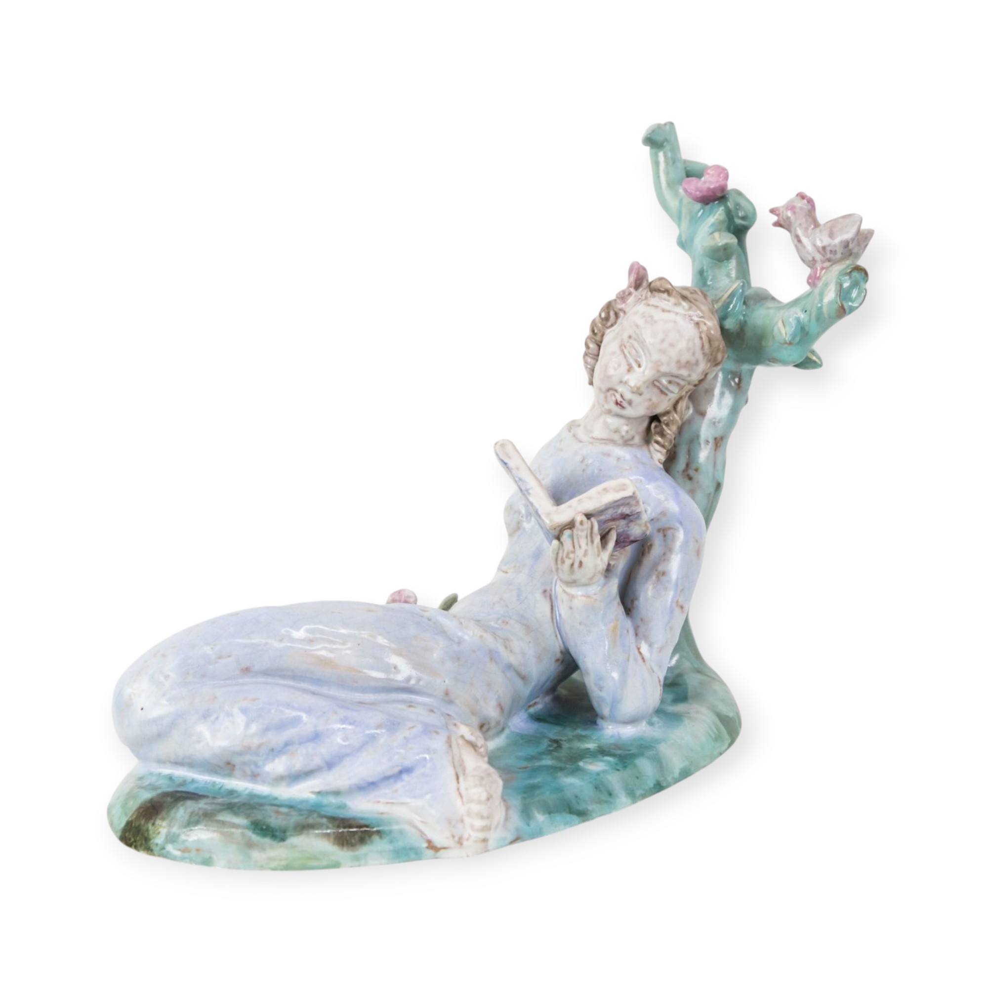 Rahmer Mária (H. Rahmer) alkotása, a címe Pihenés a szabadban (vagy egyes forrásokban “Olvasó lány”). A művészre jellemző art deco stílusú, festett mázas kerámia, amely az 1930-as években készült.