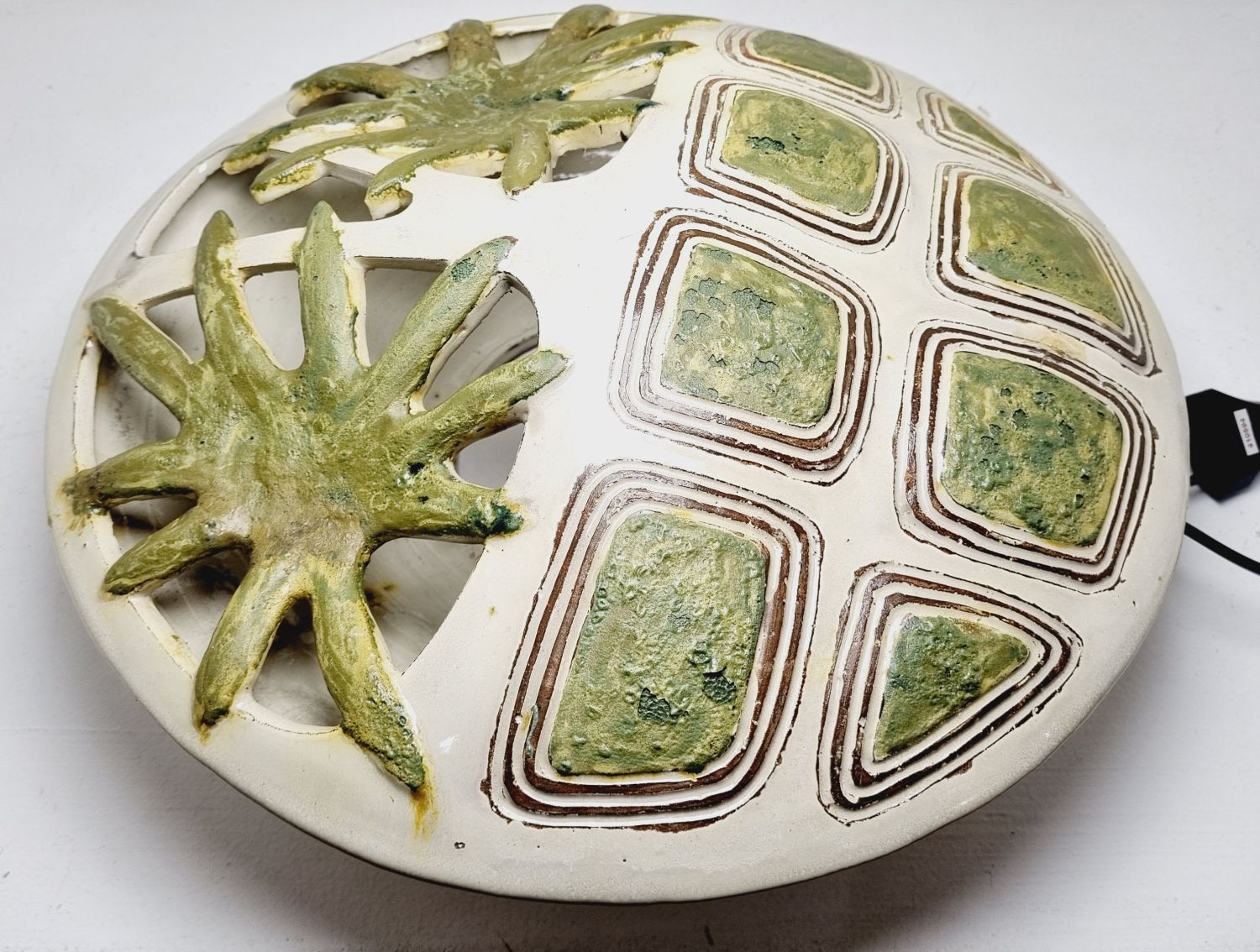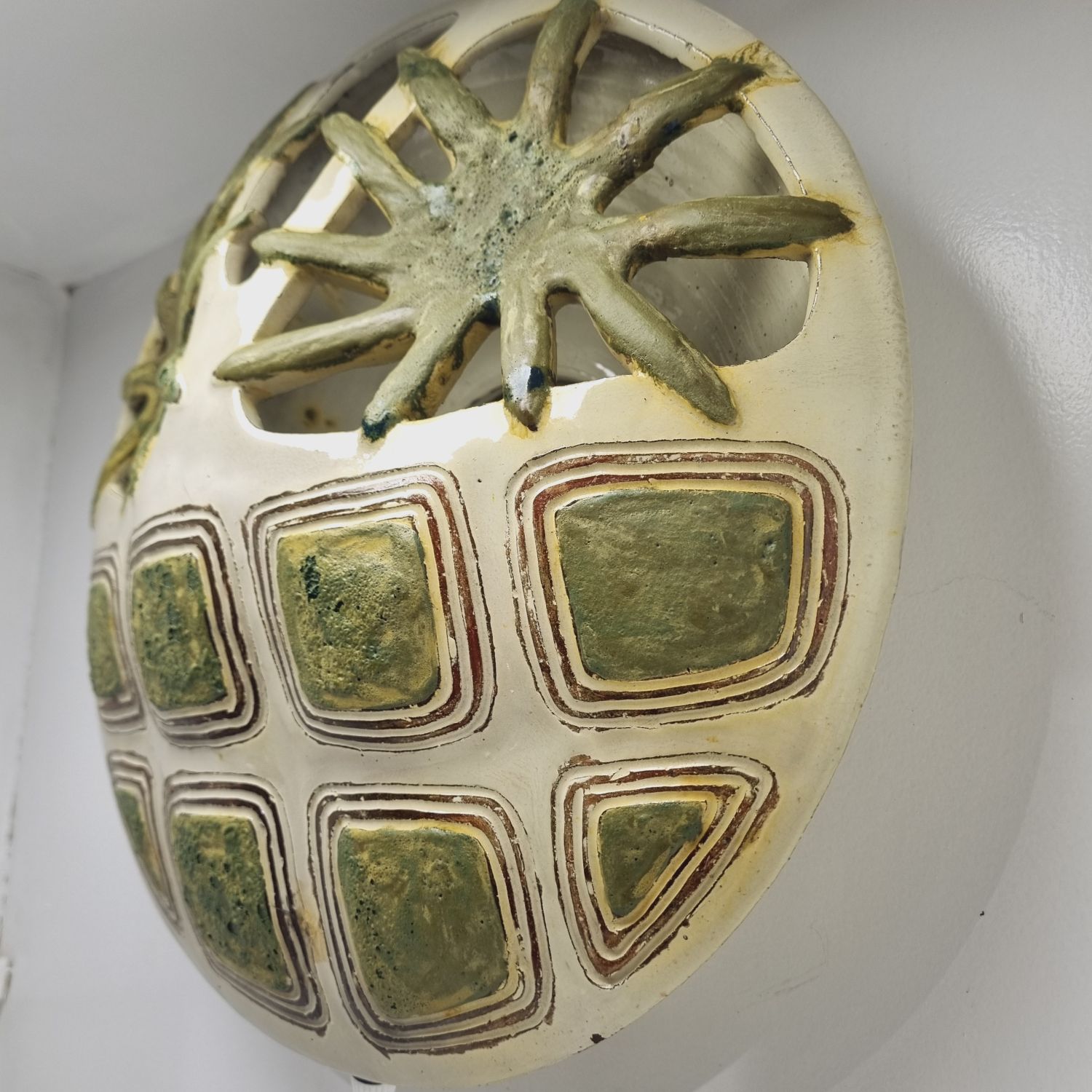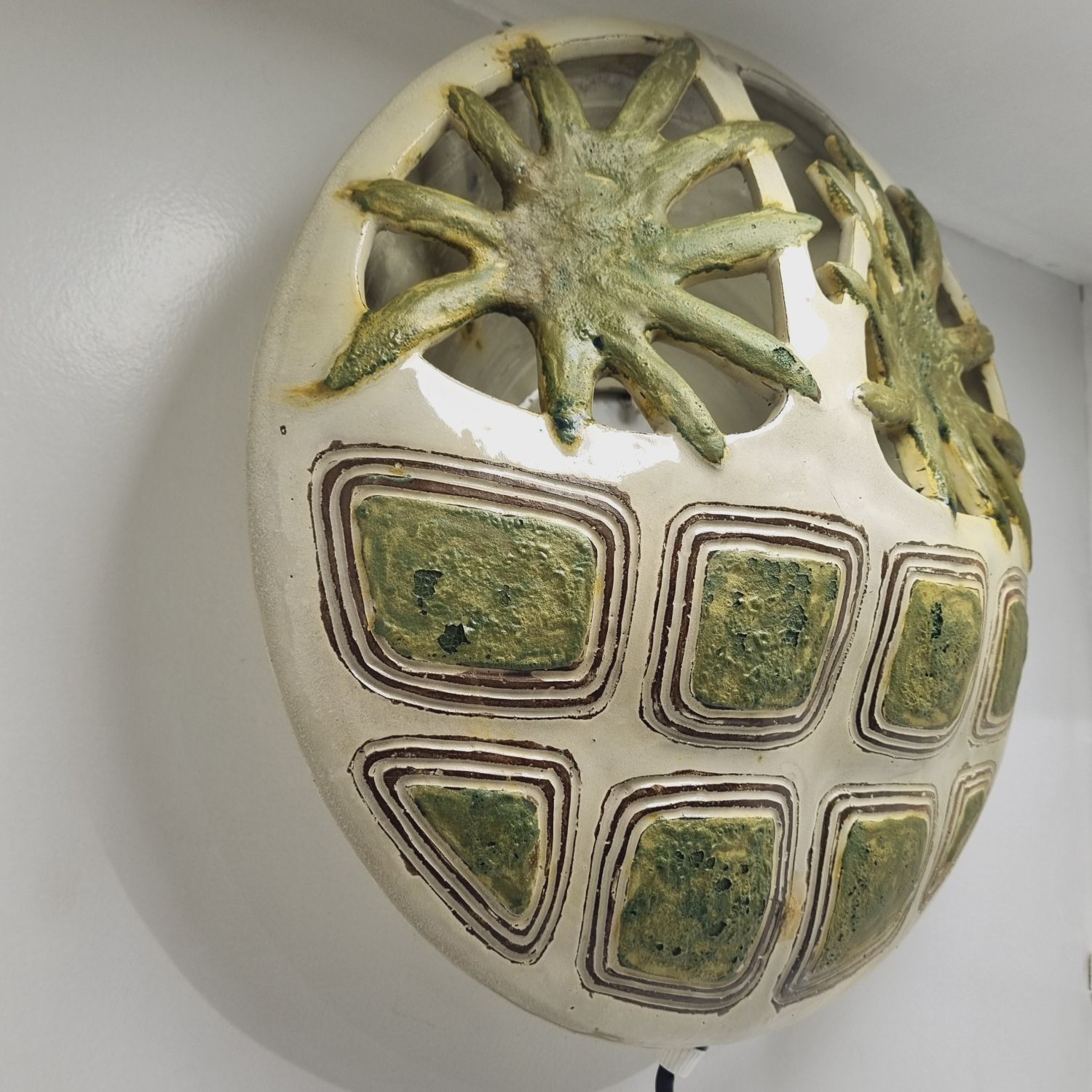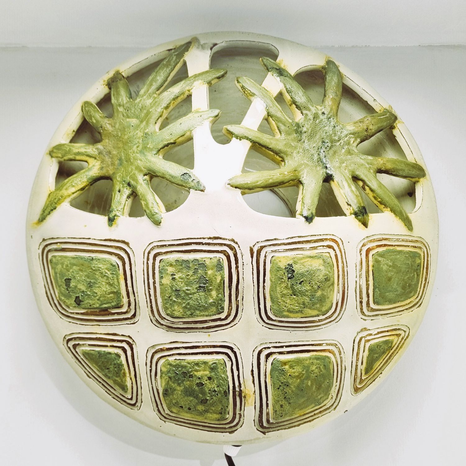 Fehér alapon zöld virágokkal dekorált kerámia falilámpa, az 1960-es évekből. Egyedi tervezésű, kézzel készített. Szép állapotban elérhető.