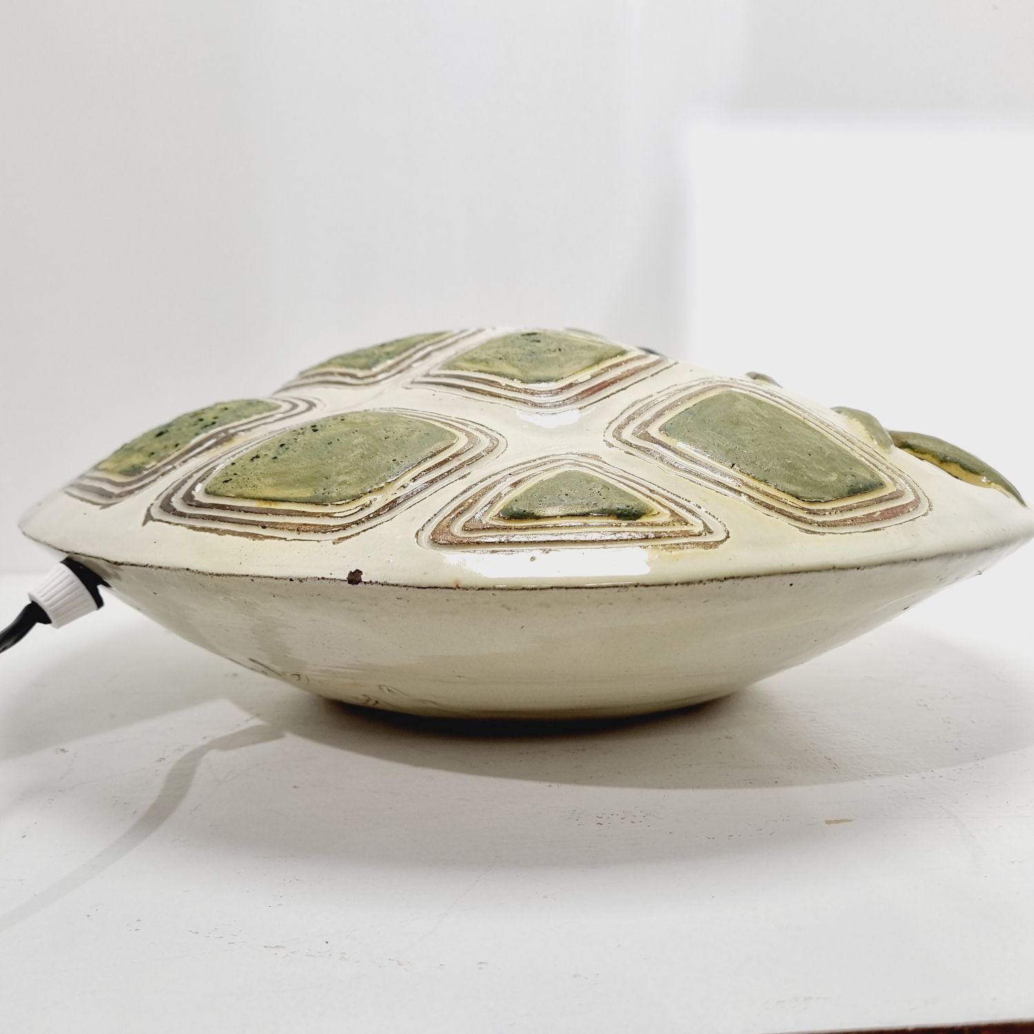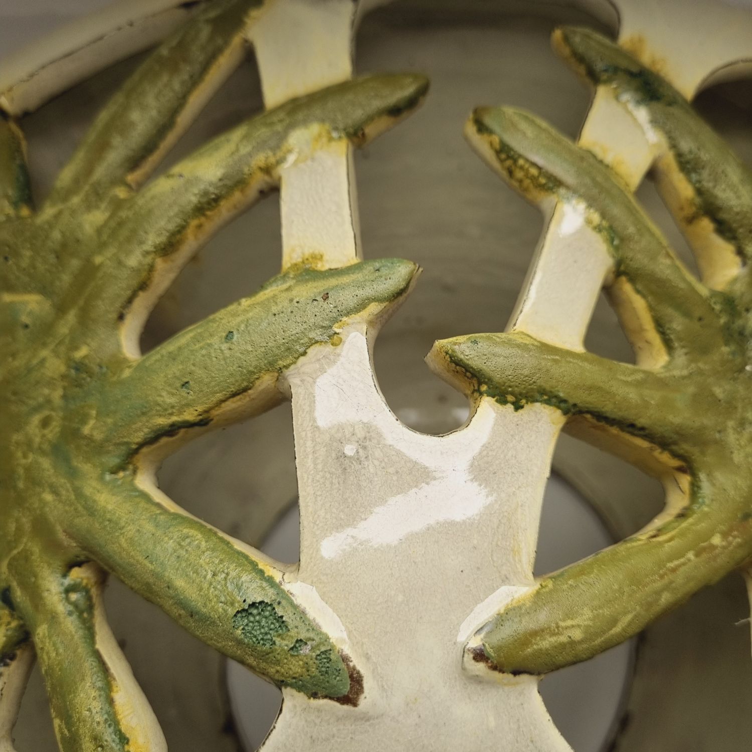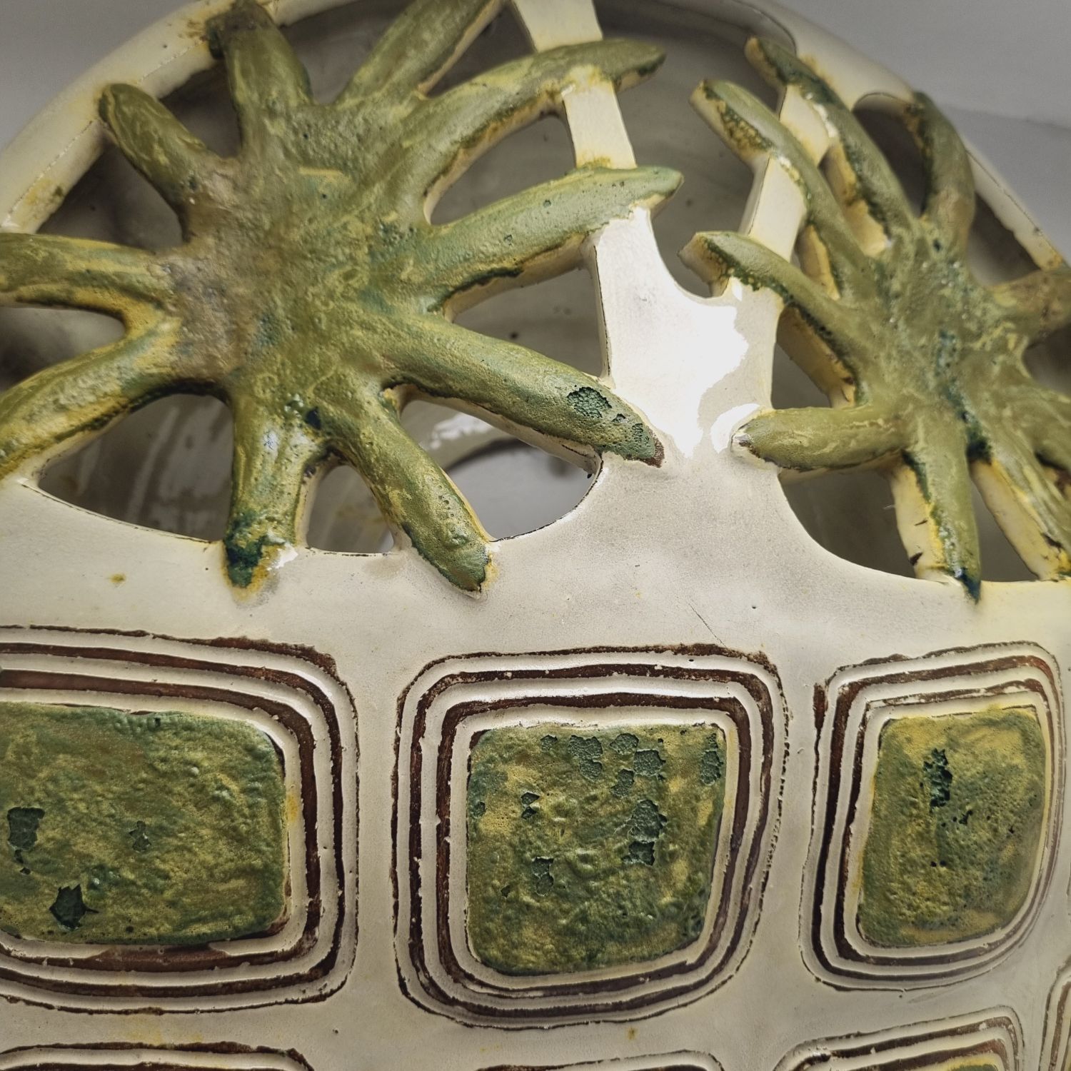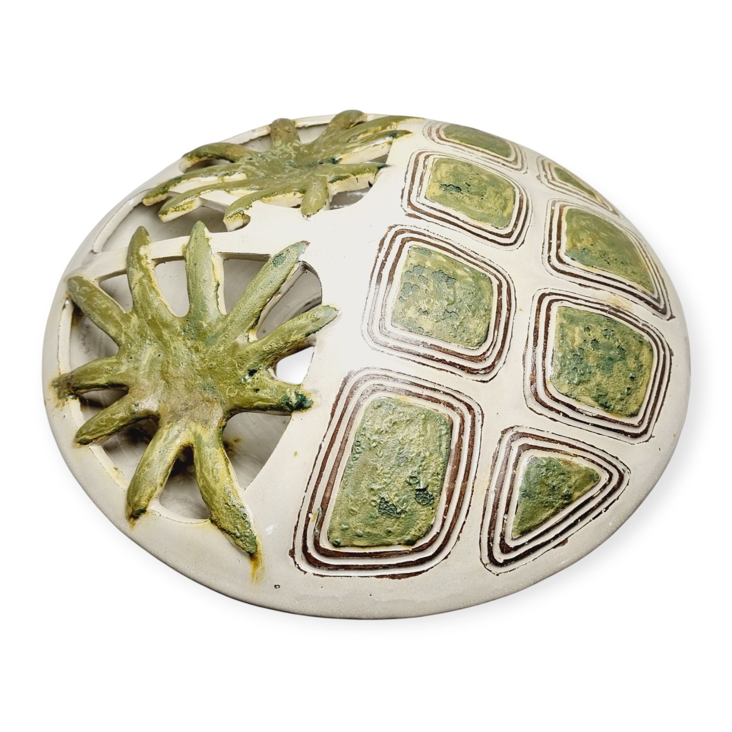 Fehér alapon zöld virágokkal dekorált kerámia falilámpa, az 1960-es évekből. Egyedi tervezésű, kézzel készített. Szép állapotban elérhető.