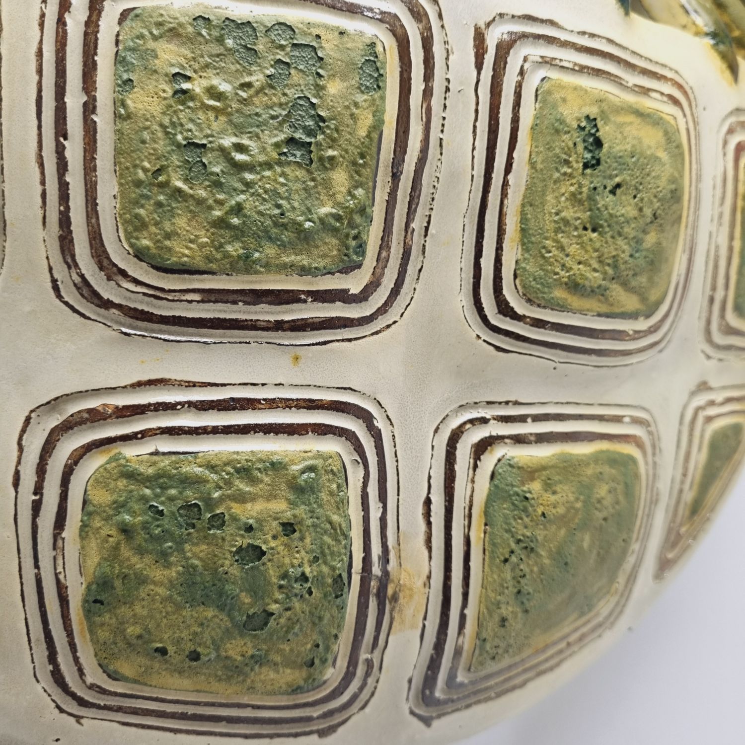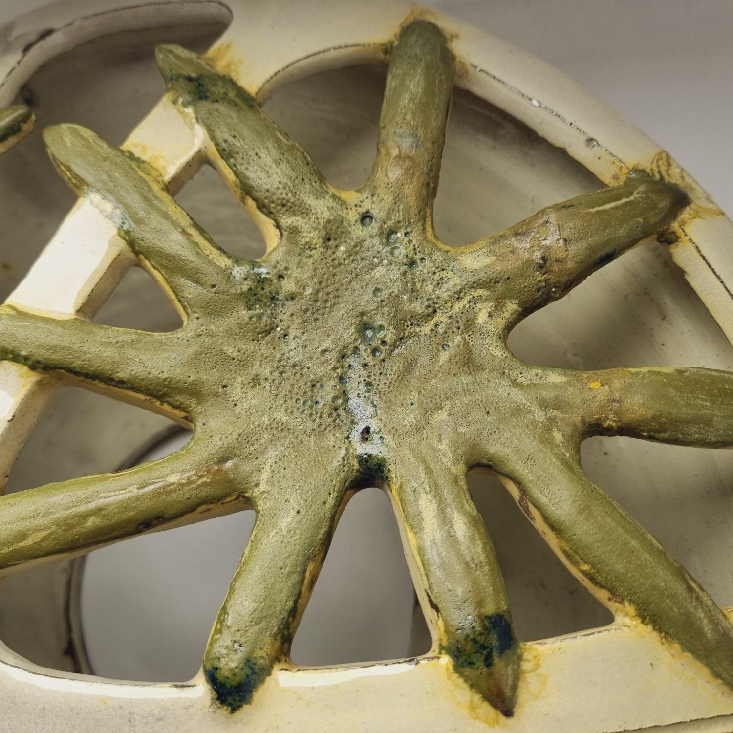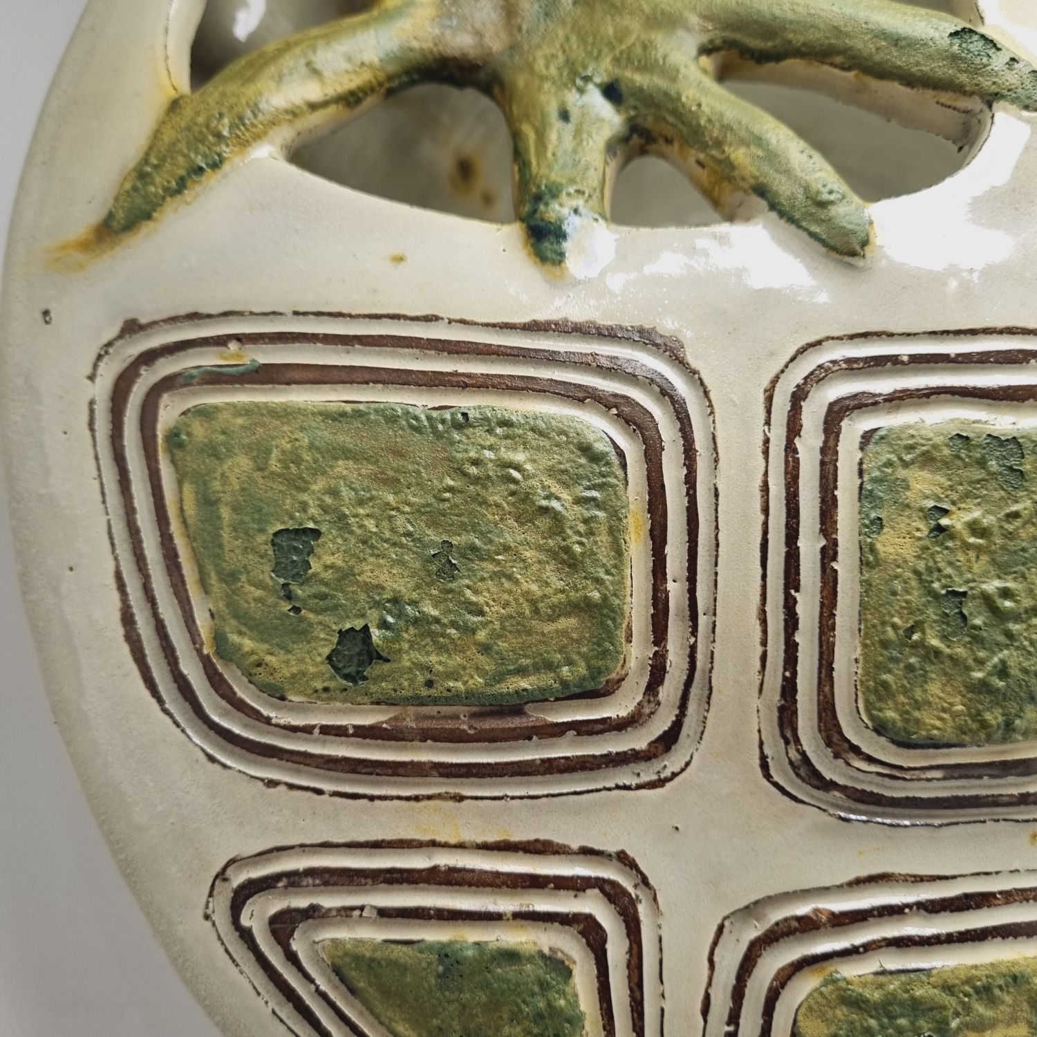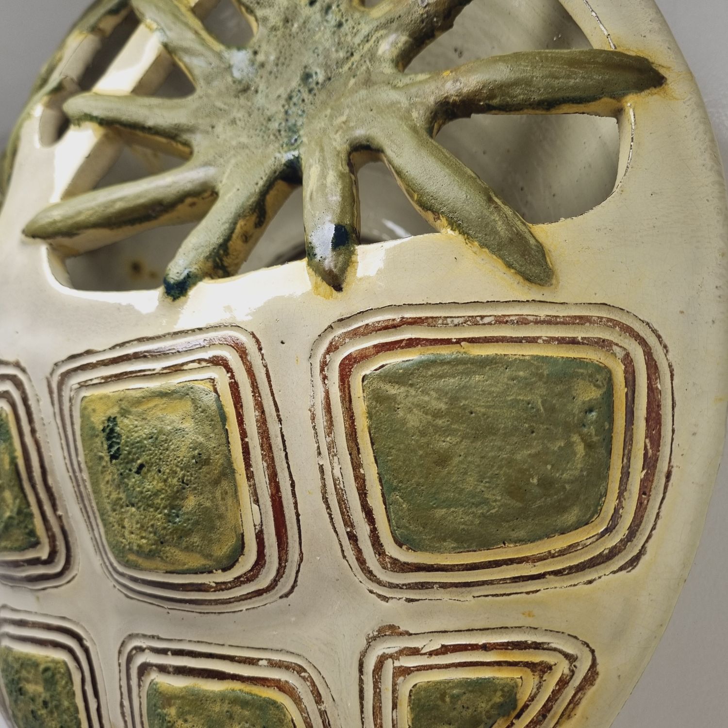 Fehér alapon zöld virágokkal dekorált kerámia falilámpa, az 1960-es évekből. Egyedi tervezésű, kézzel készített. Szép állapotban elérhető.