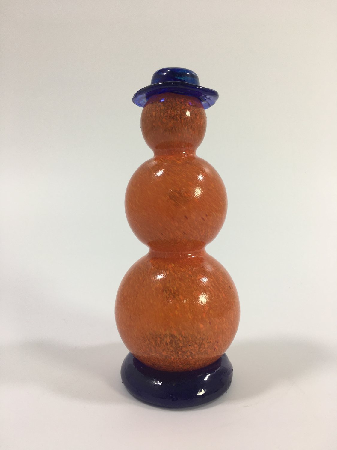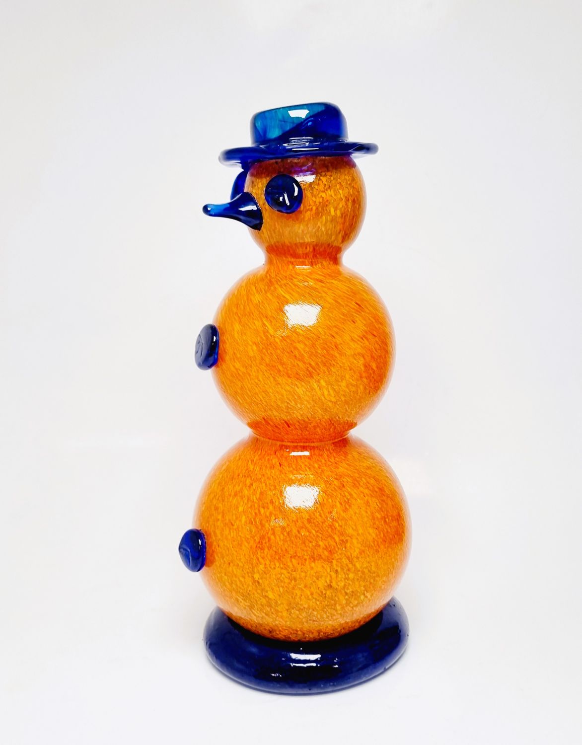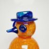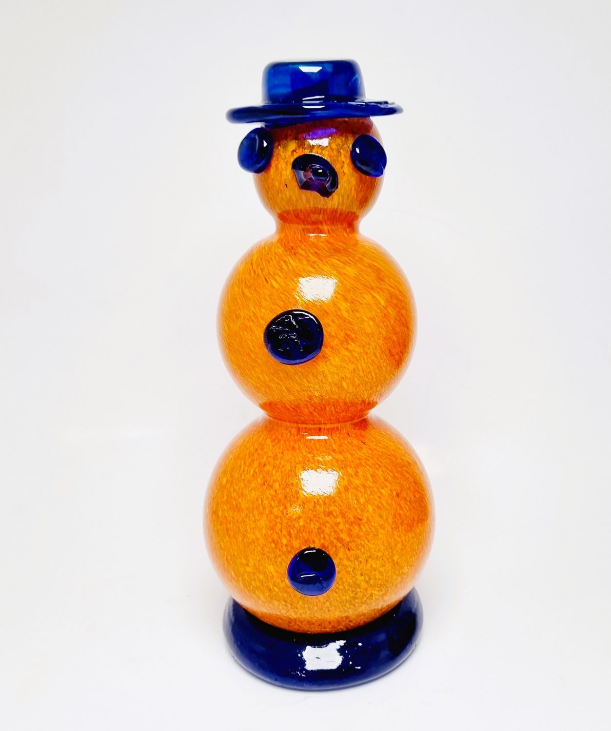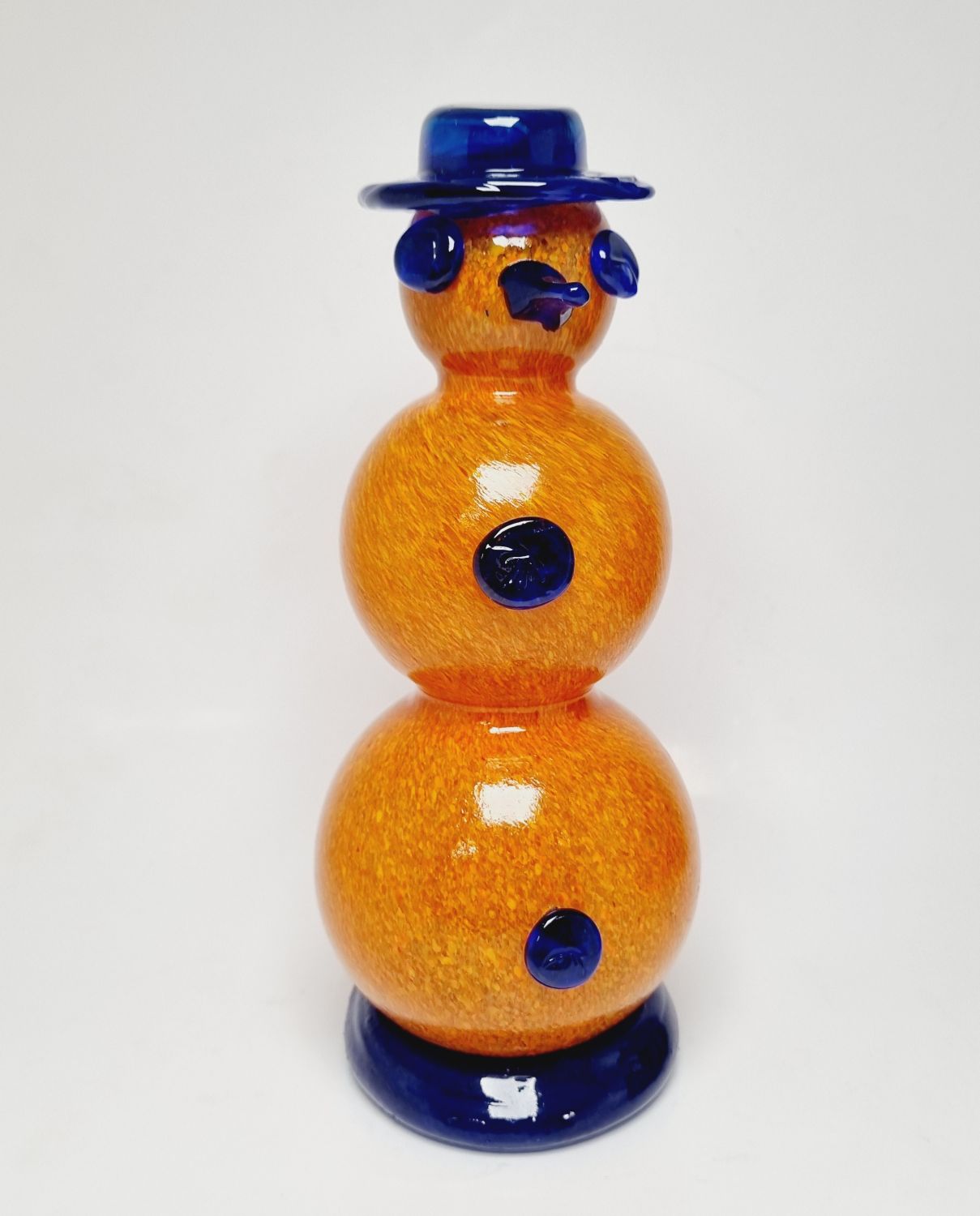 Üveg hóember figura, kék és narancssárga színben, az 1970-es évekből. Izgalmas iparművészeti tárgy, hibátlan állapotban.