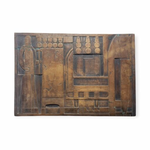 Schéner Mihály kisplasztikája az 1960-as évekből. Modernista stílusú műalkotás. Stilizált, absztrakt formákat és figurákat ábrázol, amely egyfajta narrativát vagy szimbolikus jelentést hordoz, jellemzően Schéner művészetére. Méretei: 54x37x1cm