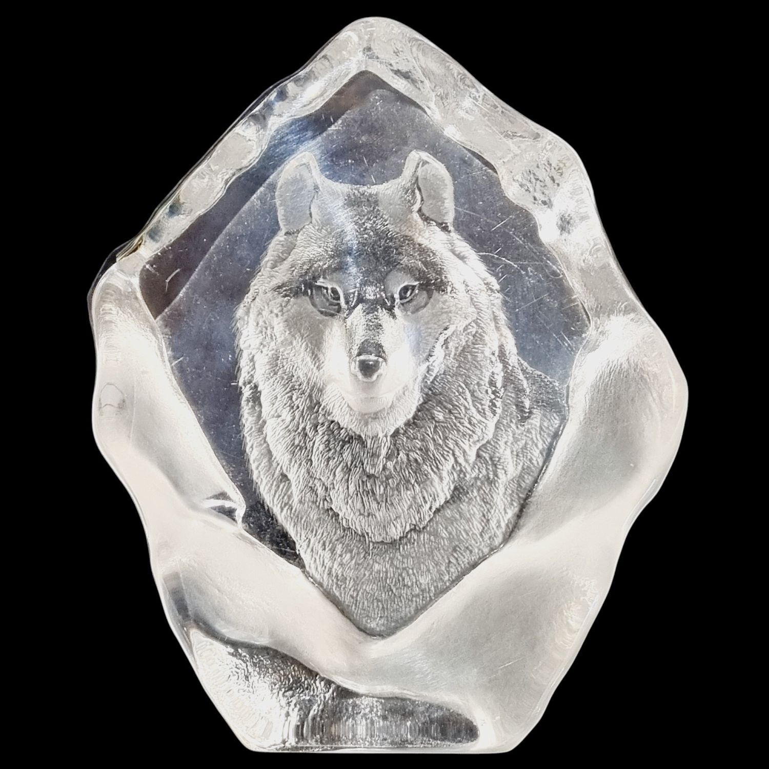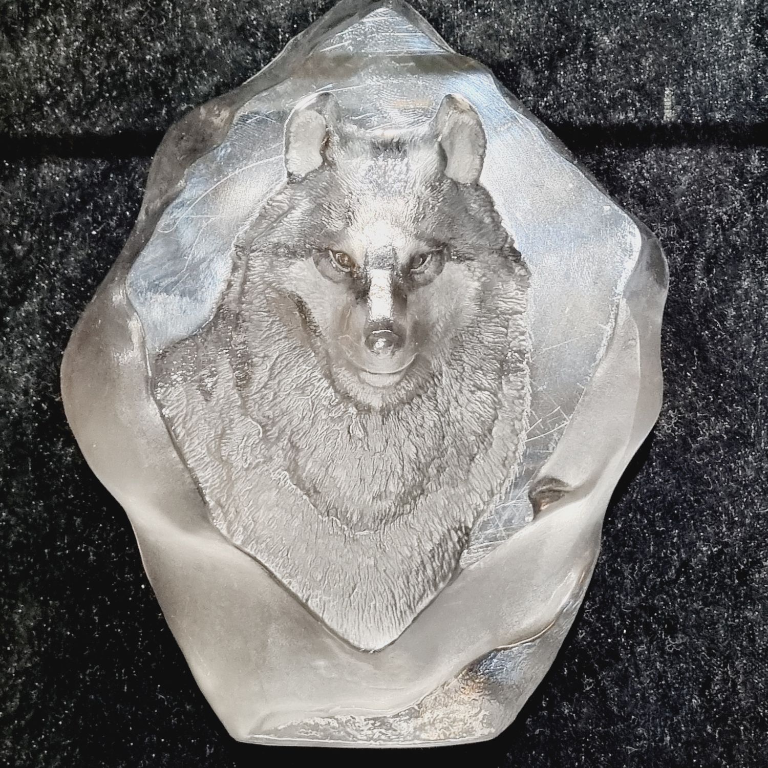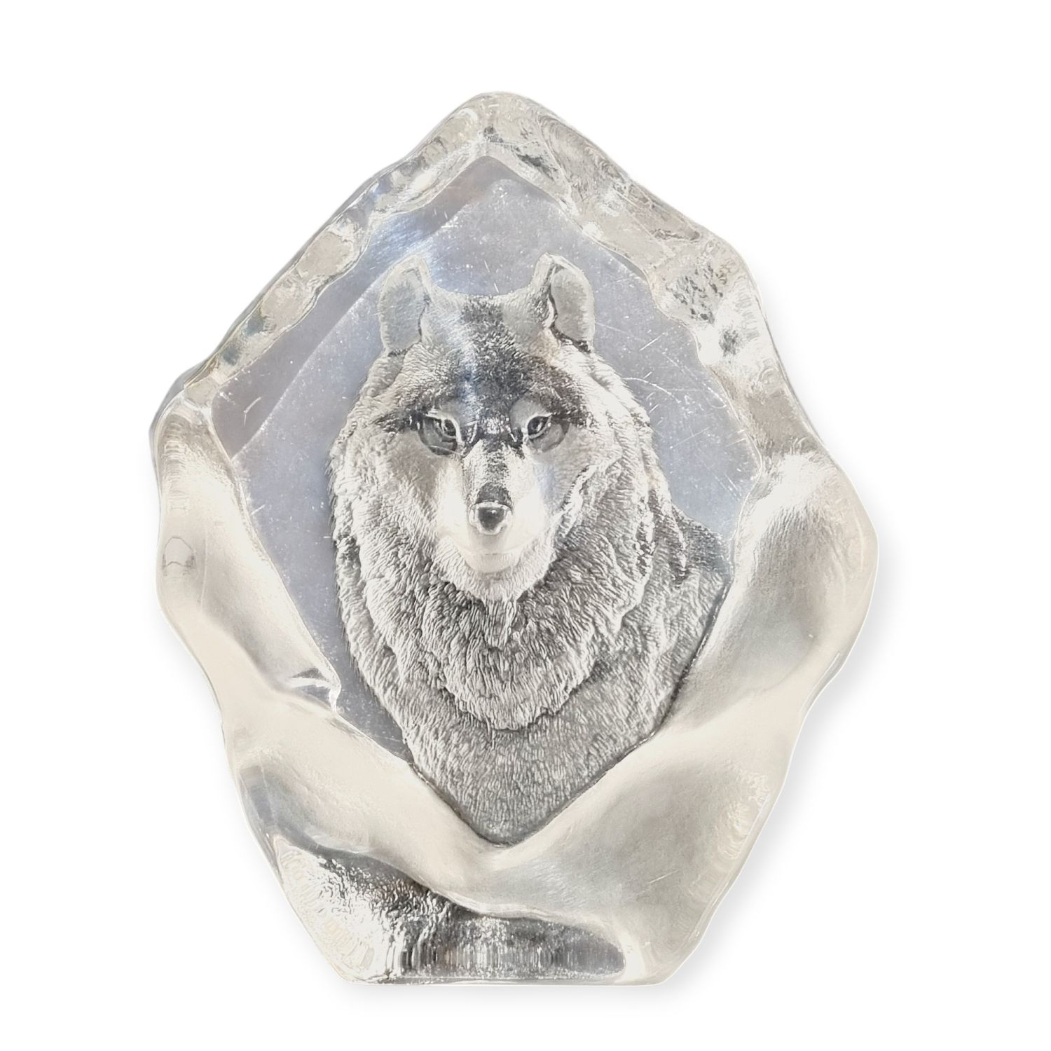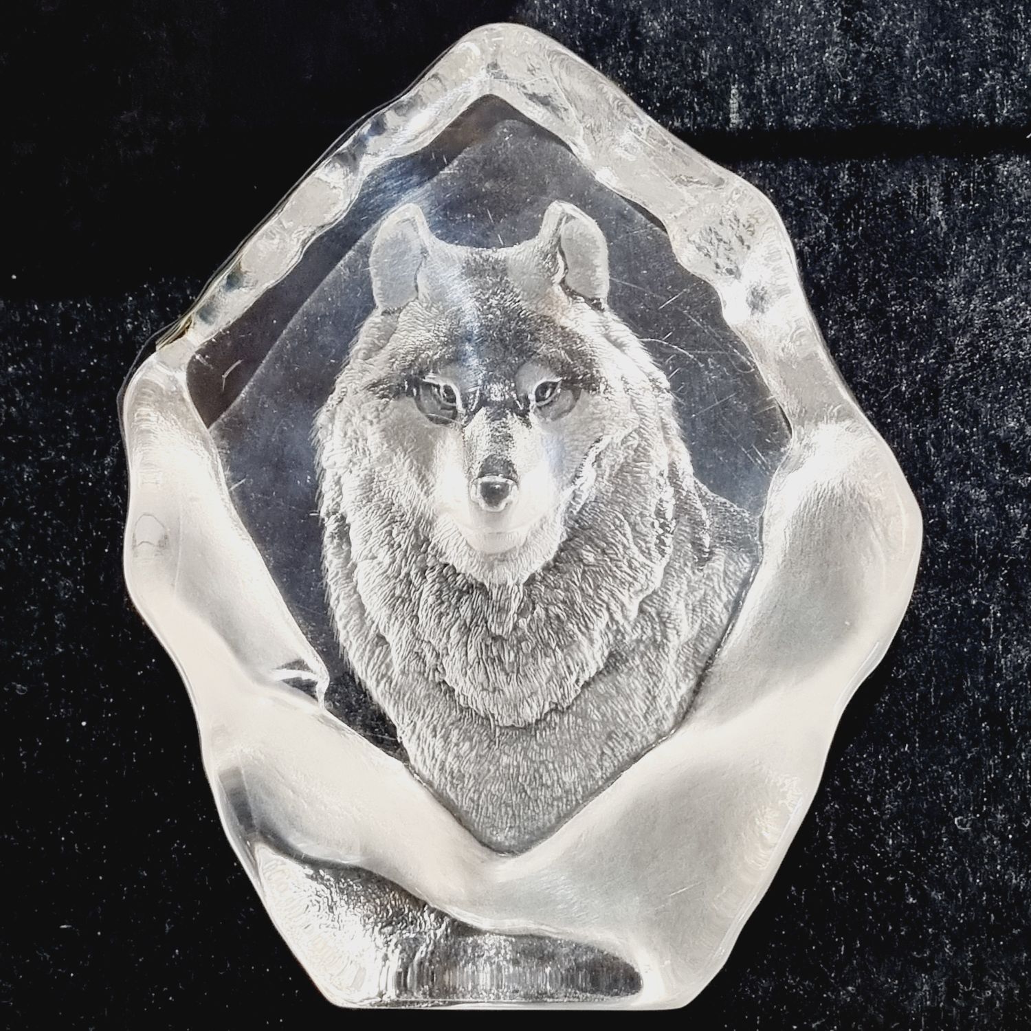 Levélnehezék az 1980-as évekből. Skandináv tervező munkája, üvegből készült rusztikus stílusban. Tükrében szépen csiszolt/ totem állat, a Germánoknál a győzelem szimboluma/ farkas figura látható. Íróasztalra téve funkcionális szerepe is lehet mint levélnehezék.
