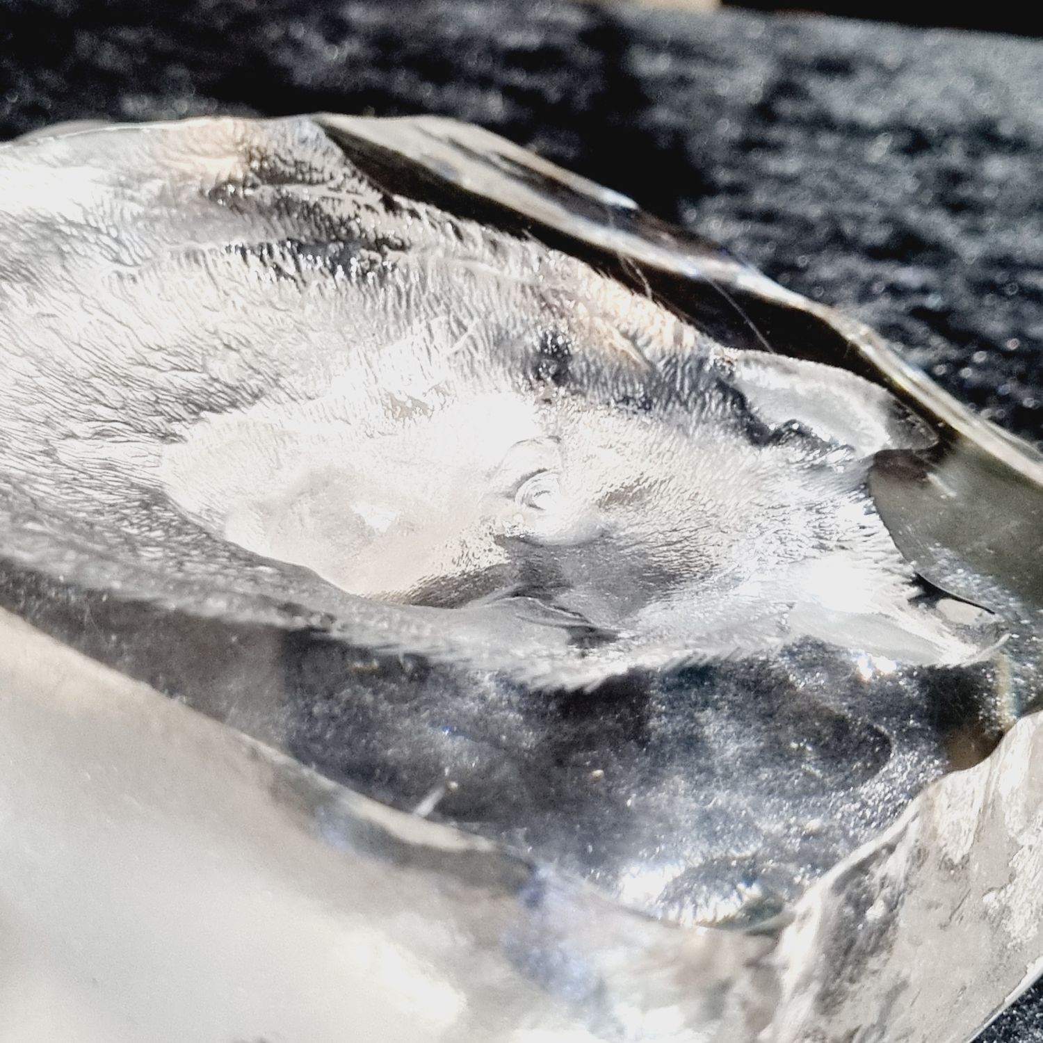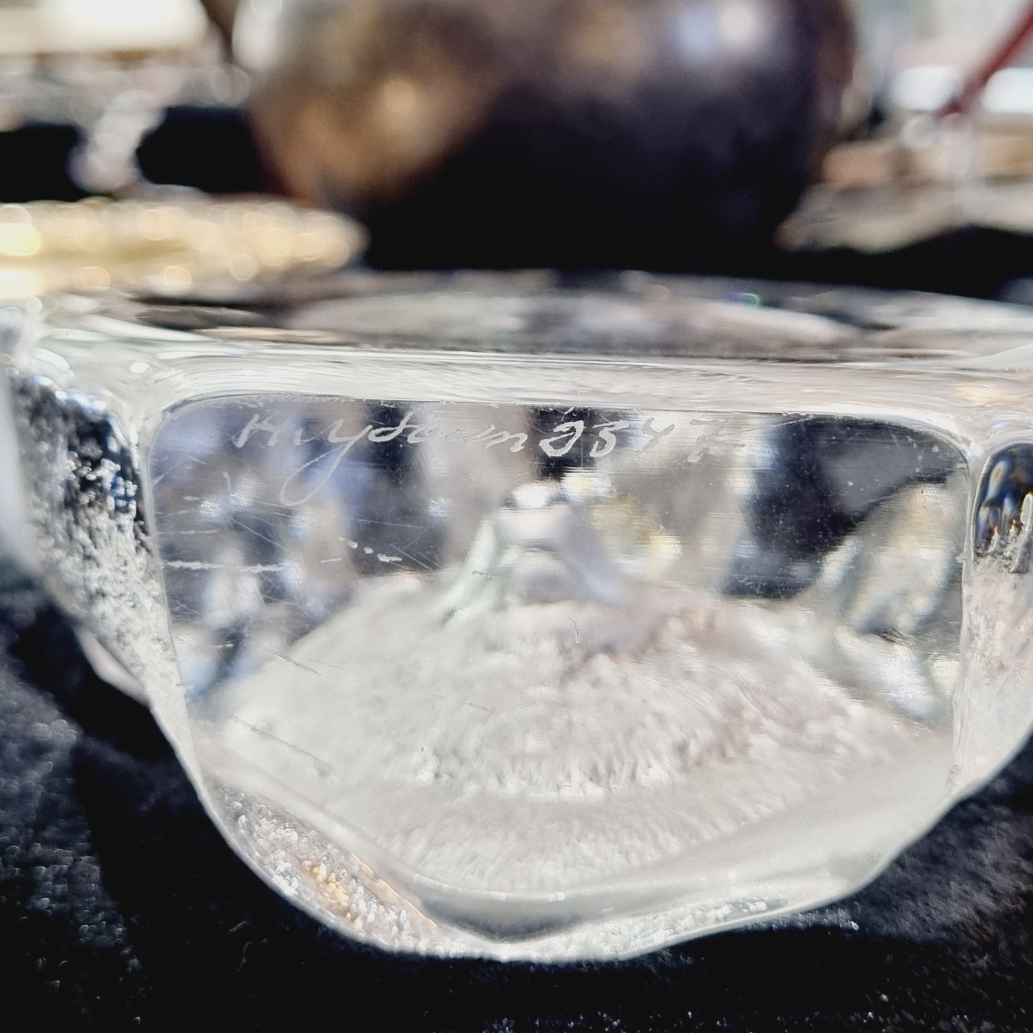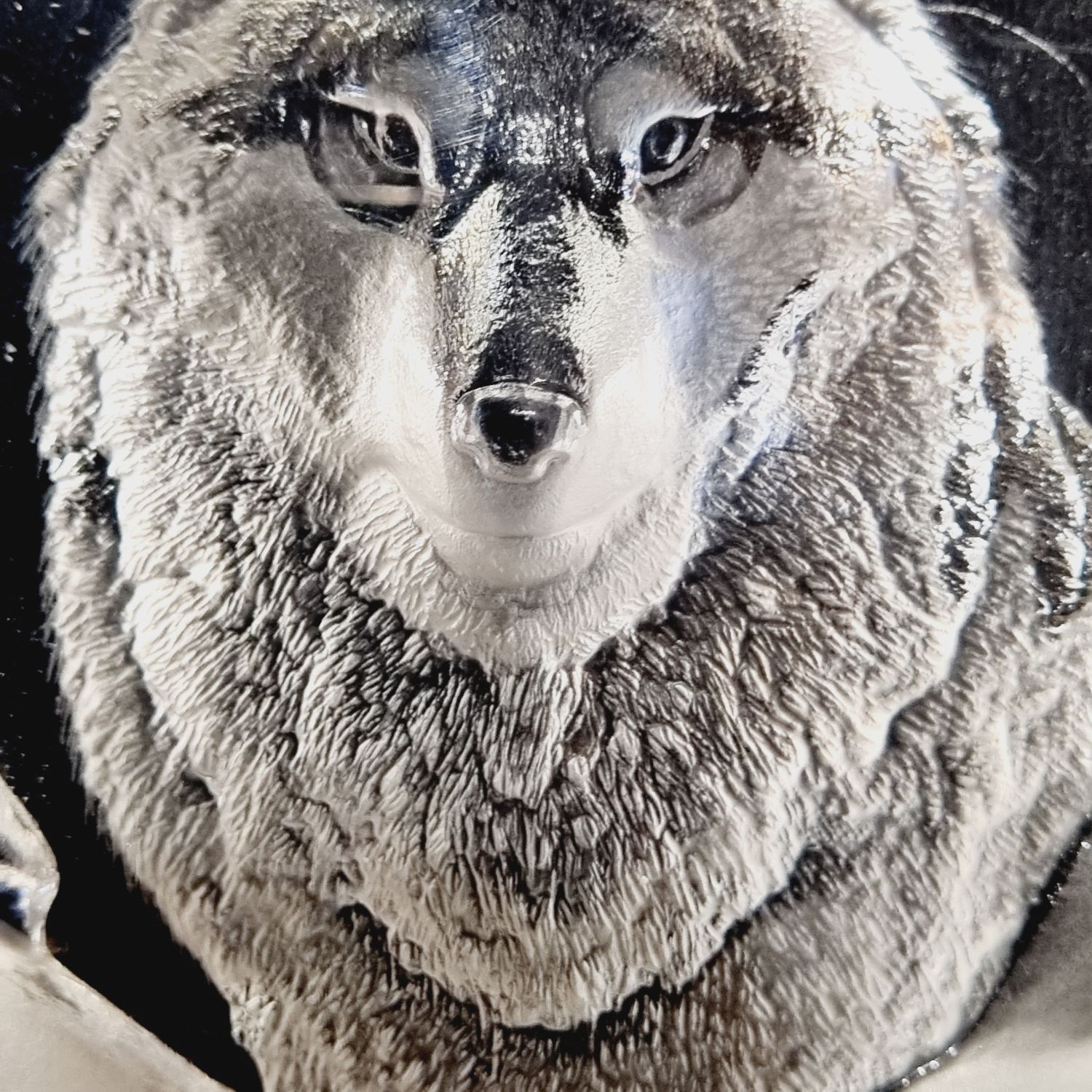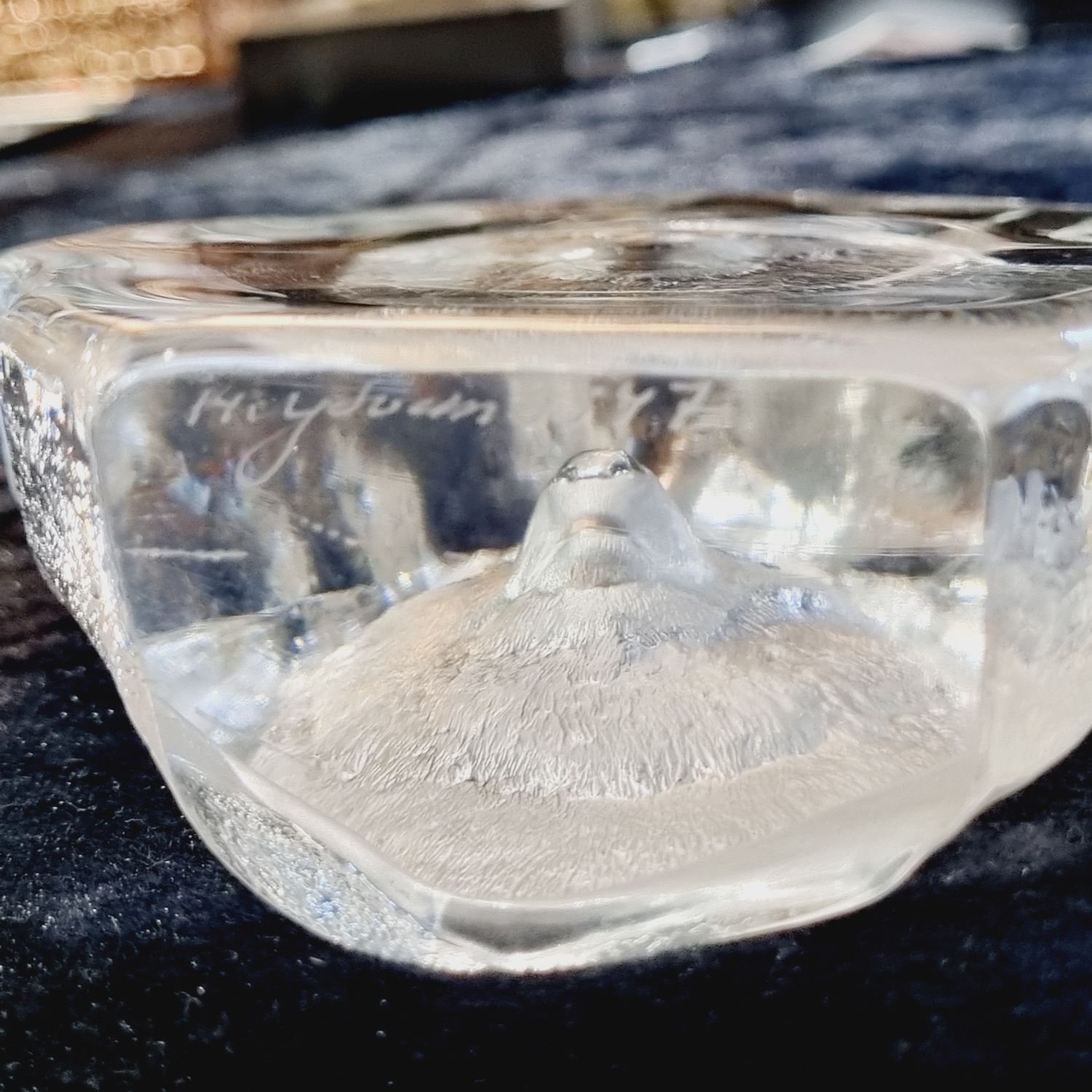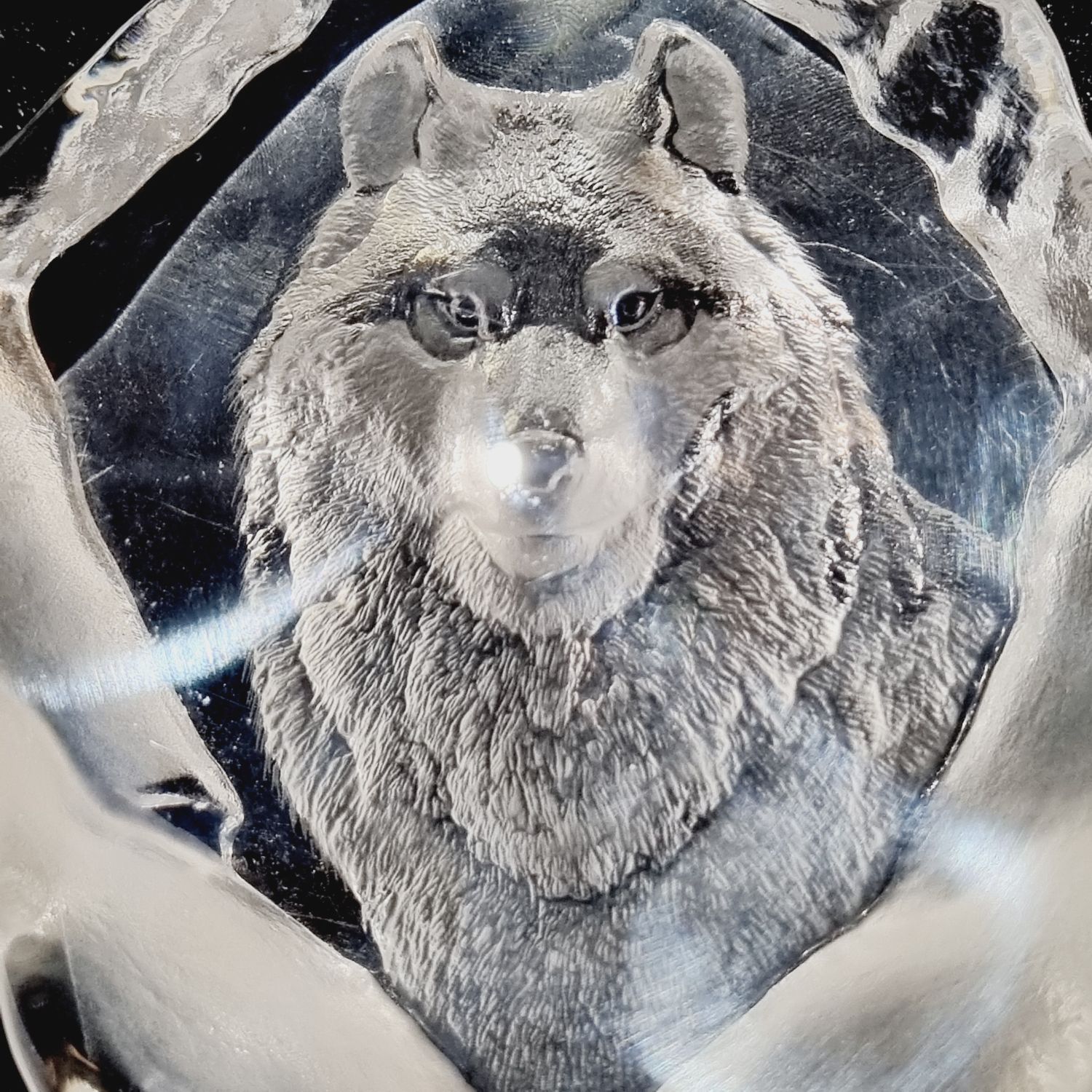 Levélnehezék az 1980-as évekből. Skandináv tervező munkája, üvegből készült rusztikus stílusban. Tükrében szépen csiszolt/ totem állat, a Germánoknál a győzelem szimboluma/ farkas figura látható. Íróasztalra téve funkcionális szerepe is lehet mint levélnehezék.