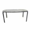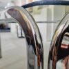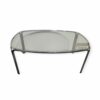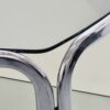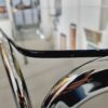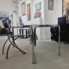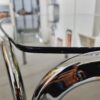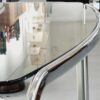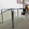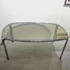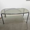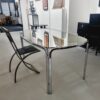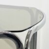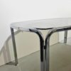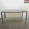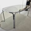 Space age stílusú étkező asztal az 1970-es évekből. Teteje füst üveg, szerkezete krómozott fém. Korának megfelelő állapotú. Szolidan elegáns minőségi darab. Méretei: 71 x 161 x 91 cm.