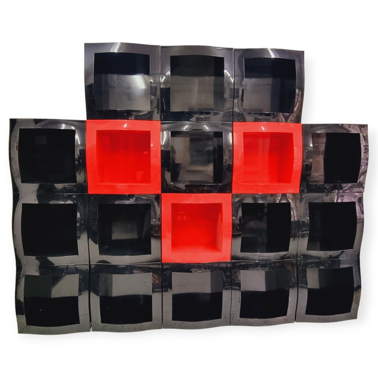 Boogie-woogie polcrendszer, amely 18 elemből áll. Absztrakt formavilágú, kontrasztos piros és fekete négyzetekkel. Jelzett, Magis – Stefano Giovannoni olasz formatervező alkotása. Elemenként is megvásárolható. Egyedi stílus, minőség, funkcionalitás jellemzi, jó teherbírású, masszív, könyvespolcnak is ideális. 15db fekete és 3db piros elem elérhető. Ár/db