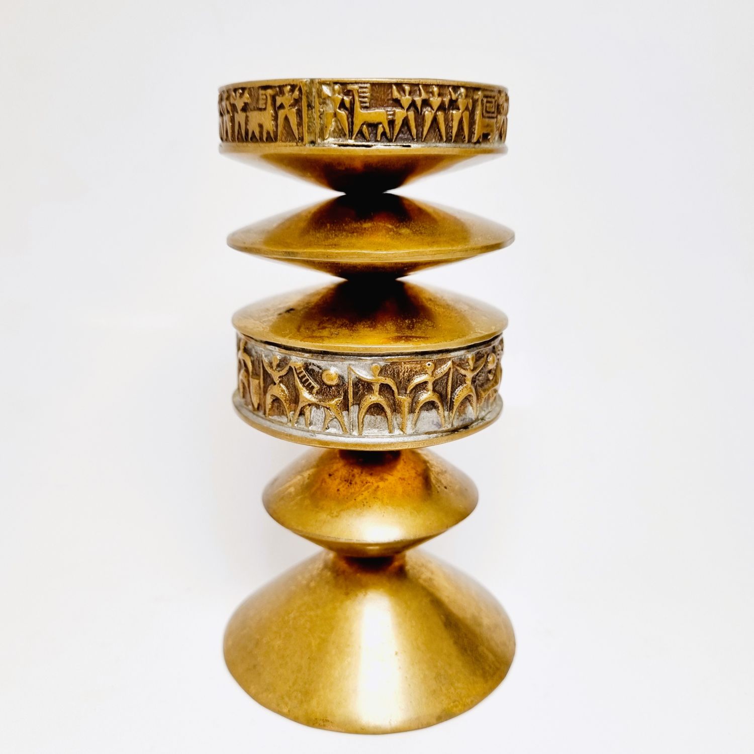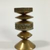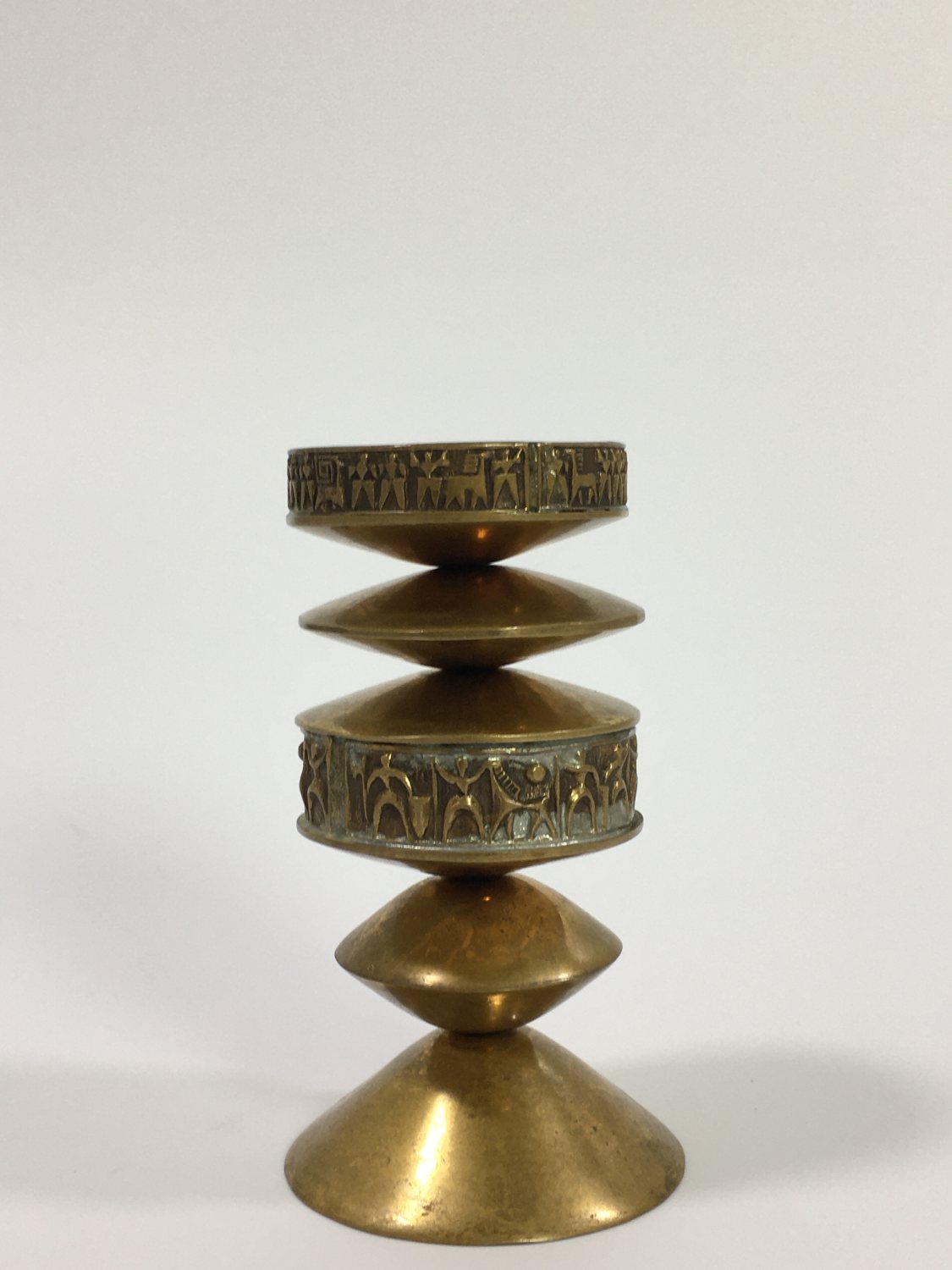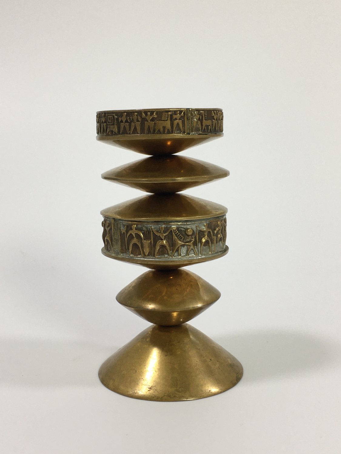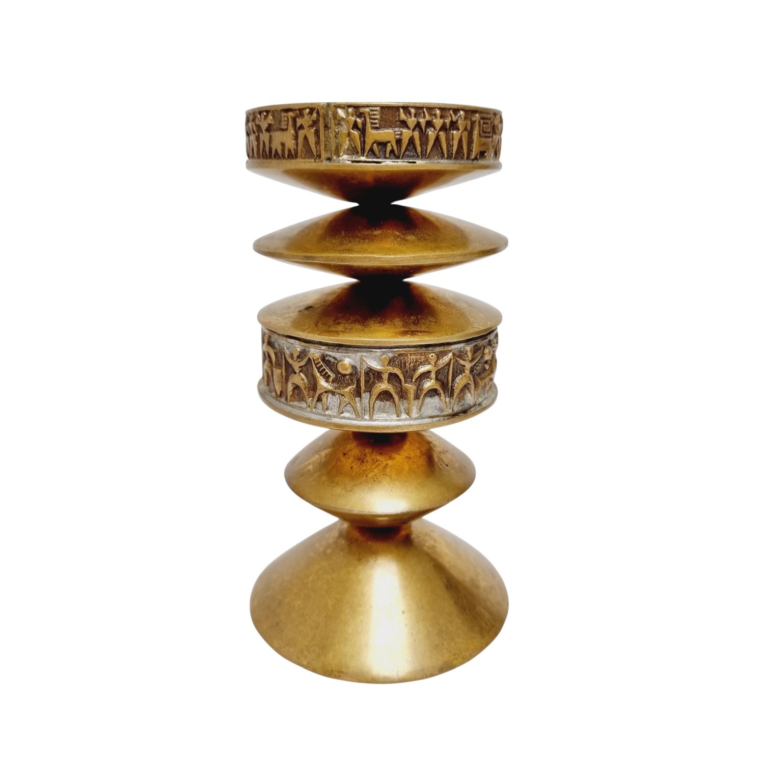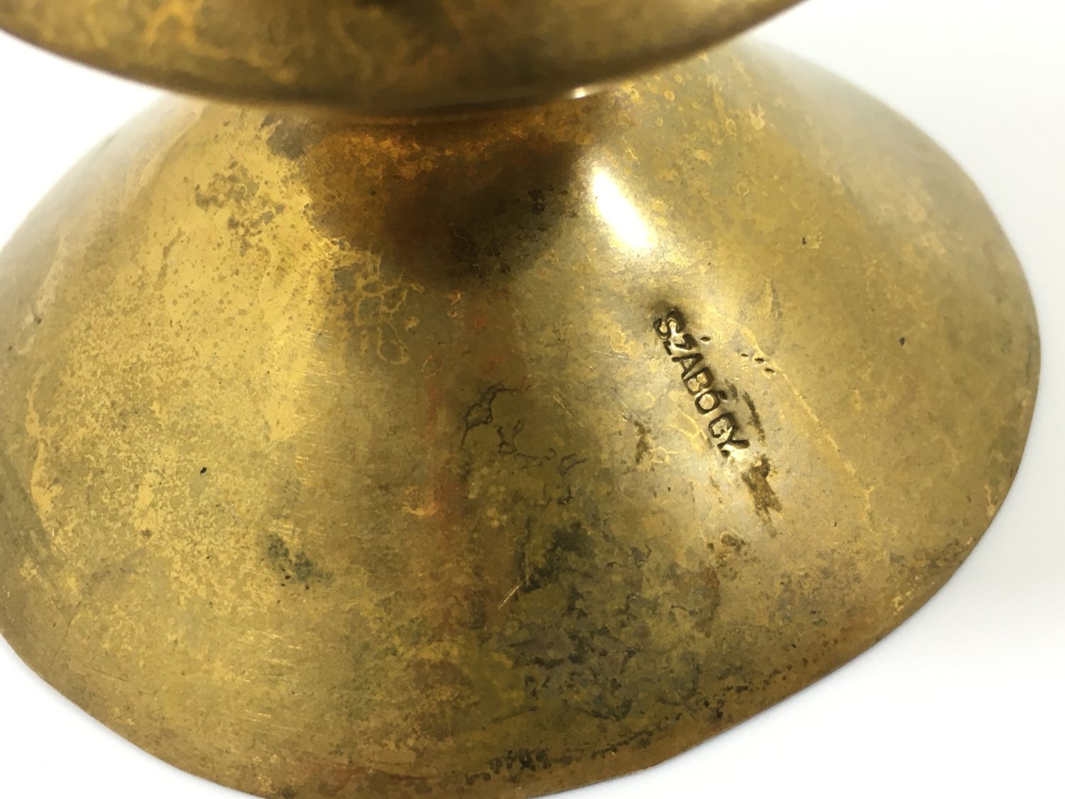 Szabó Gyula által az 1970-es években tervezett réz gyertyatartó lenyűgöző geometriai formával és domborműves felülettel büszkélkedhet. Egyedi kialakítása és gyönyörű állapota miatt a vintage tárgyak gyűjtői számára kötelező darab.