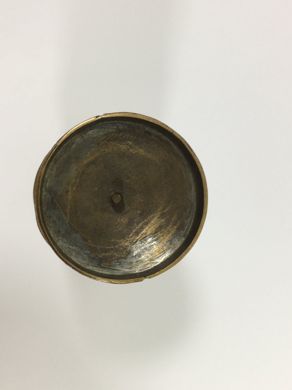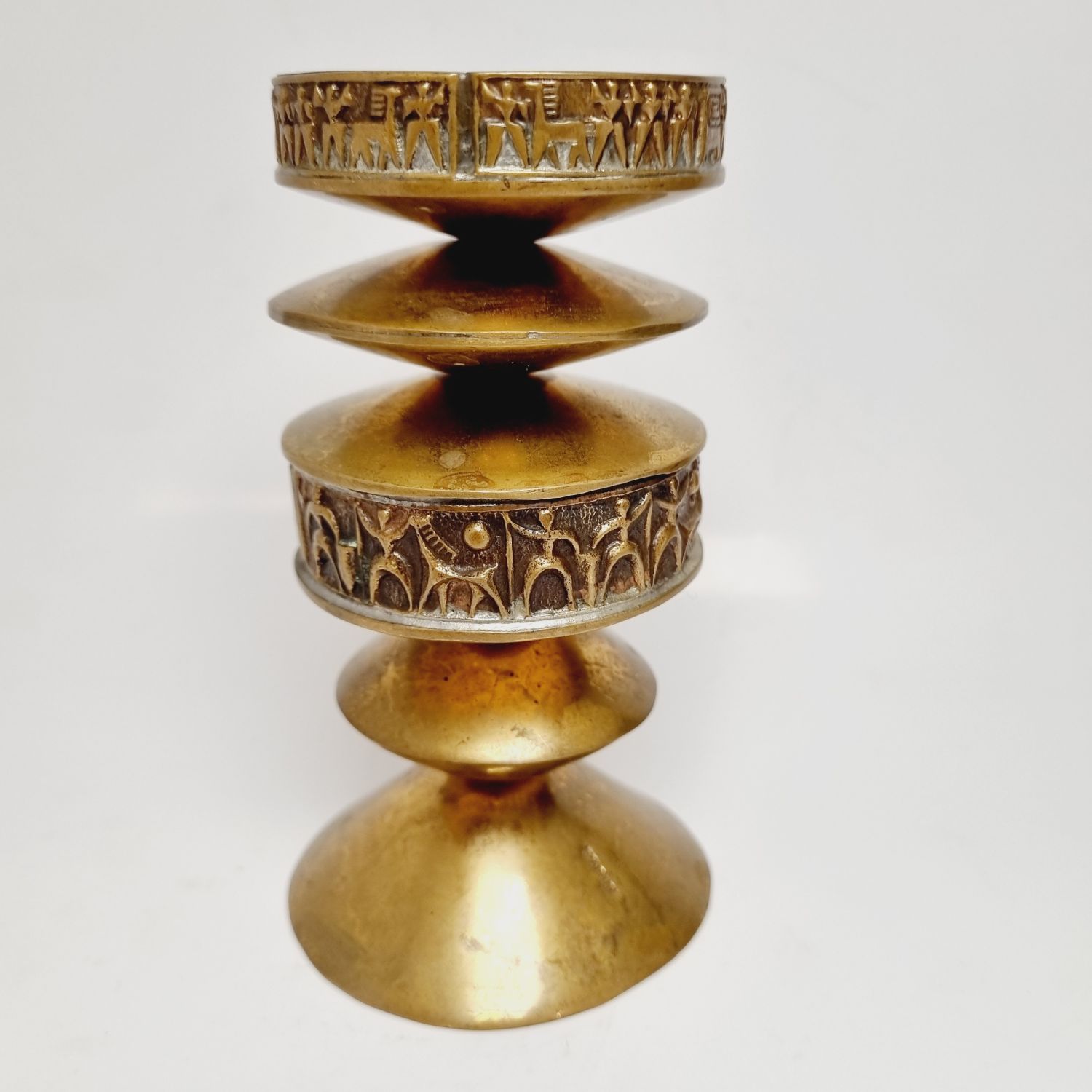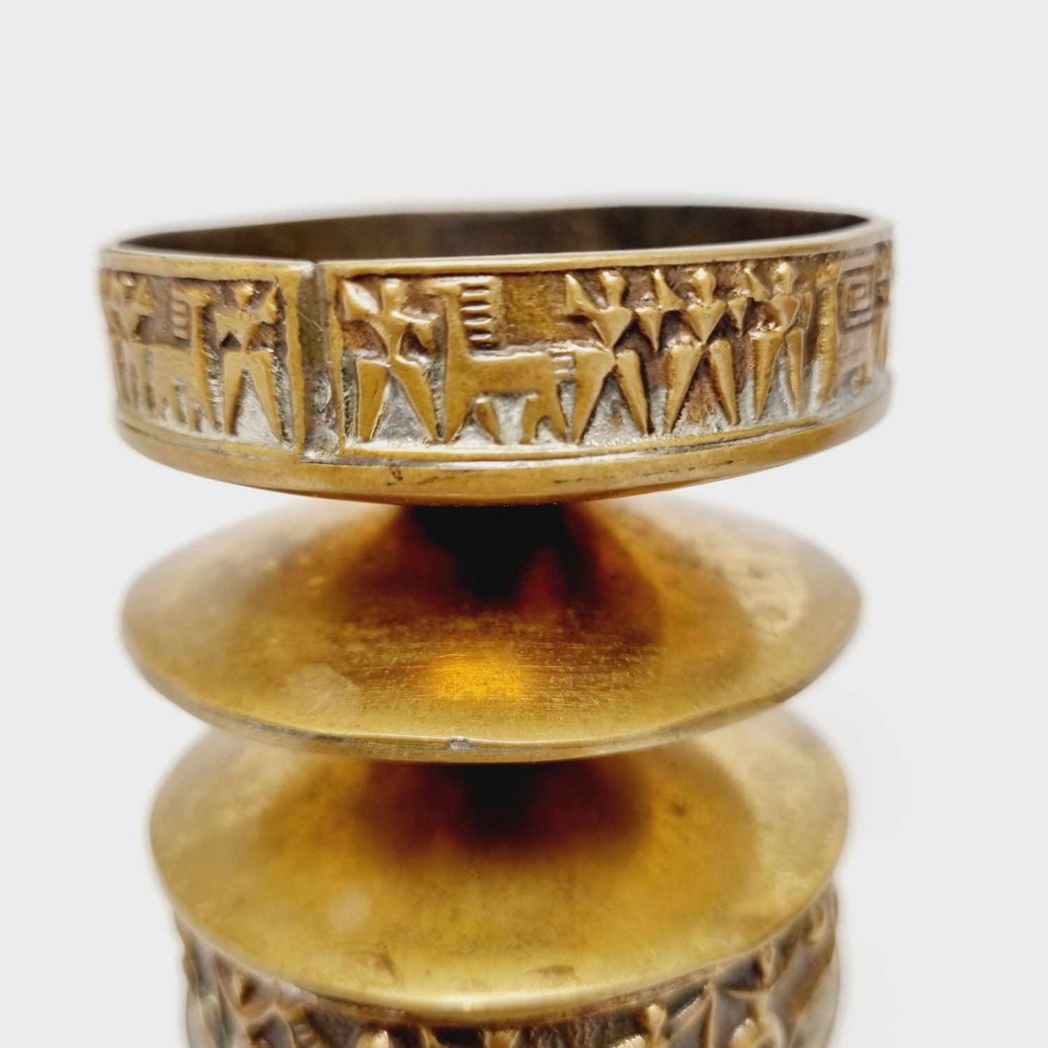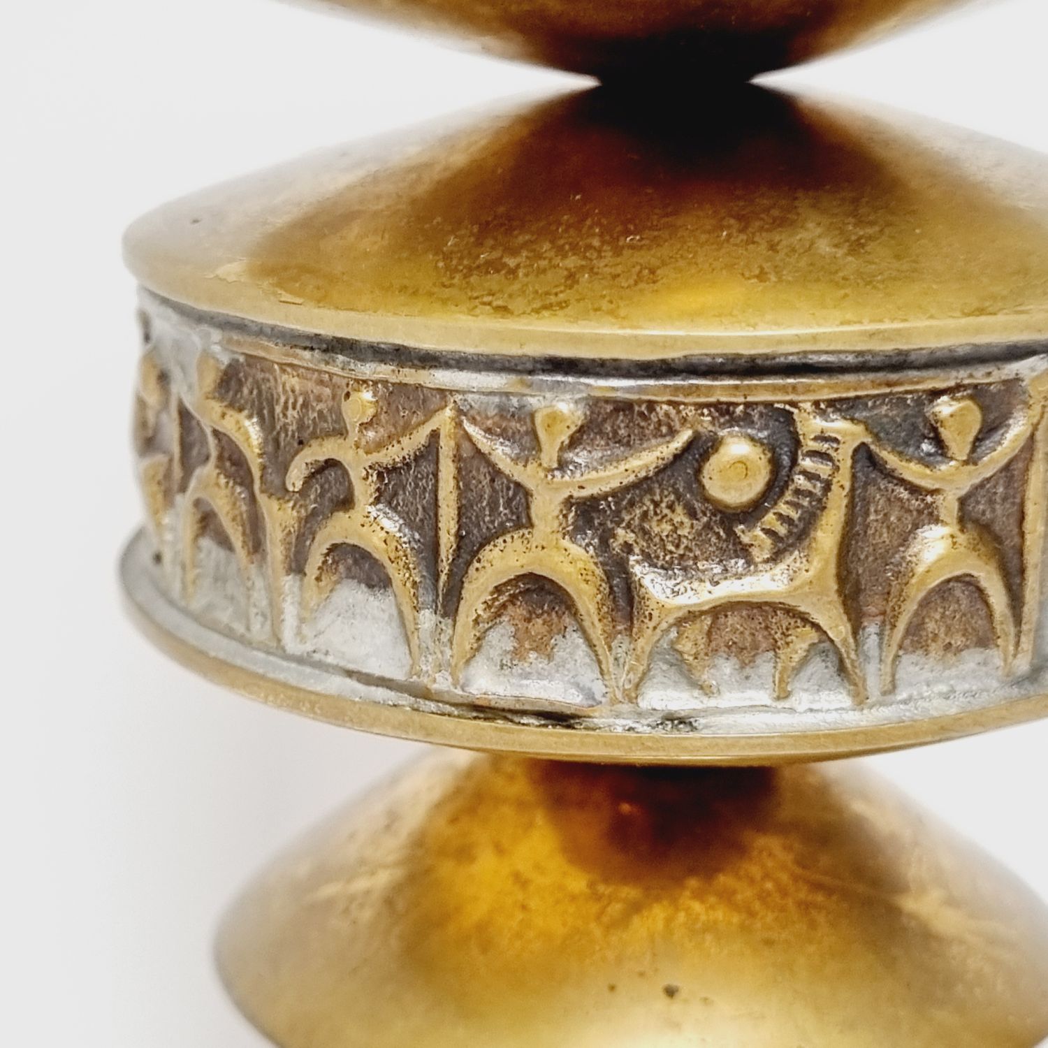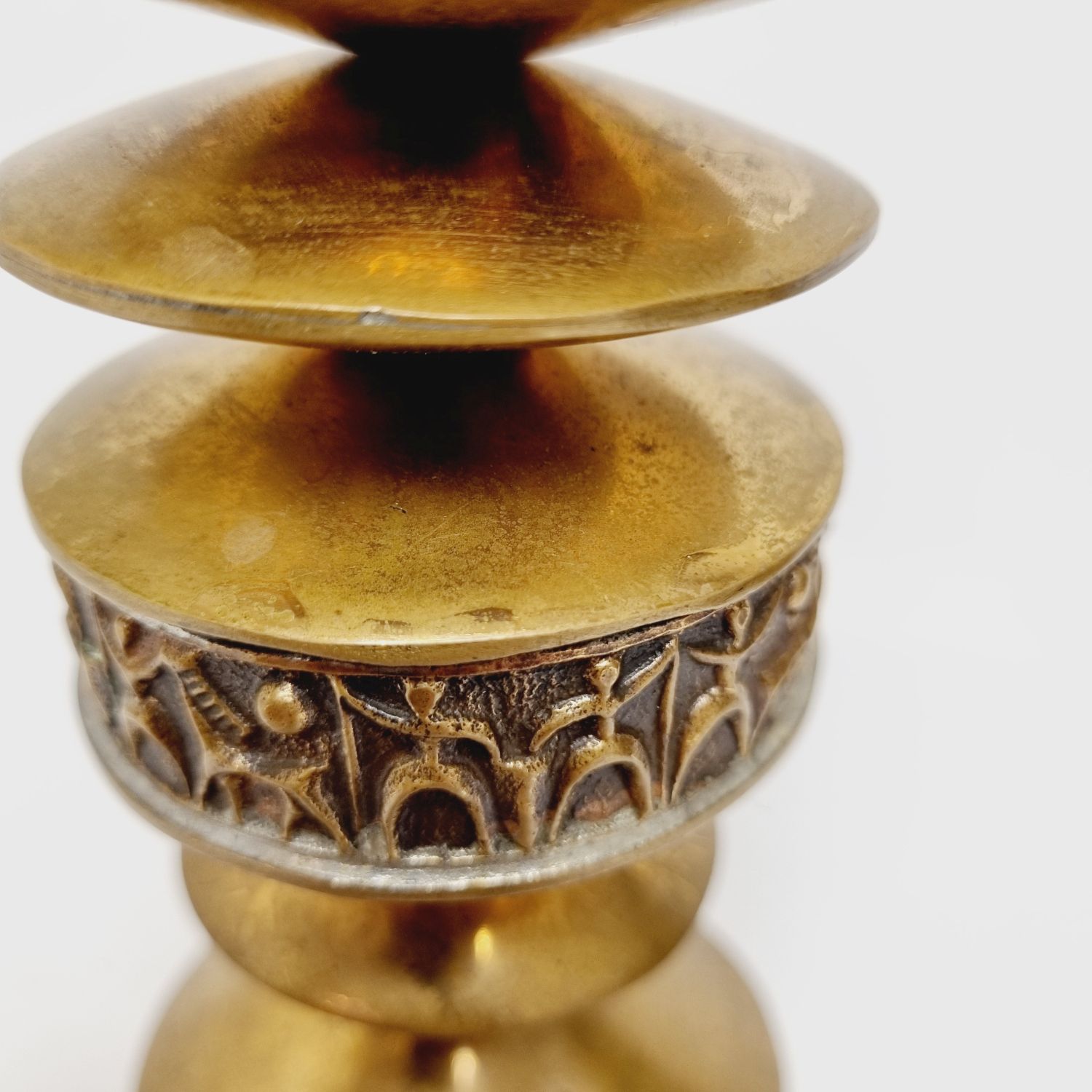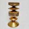 Szabó Gyula által az 1970-es években tervezett réz gyertyatartó lenyűgöző geometriai formával és domborműves felülettel büszkélkedhet. Egyedi kialakítása és gyönyörű állapota miatt a vintage tárgyak gyűjtői számára kötelező darab.