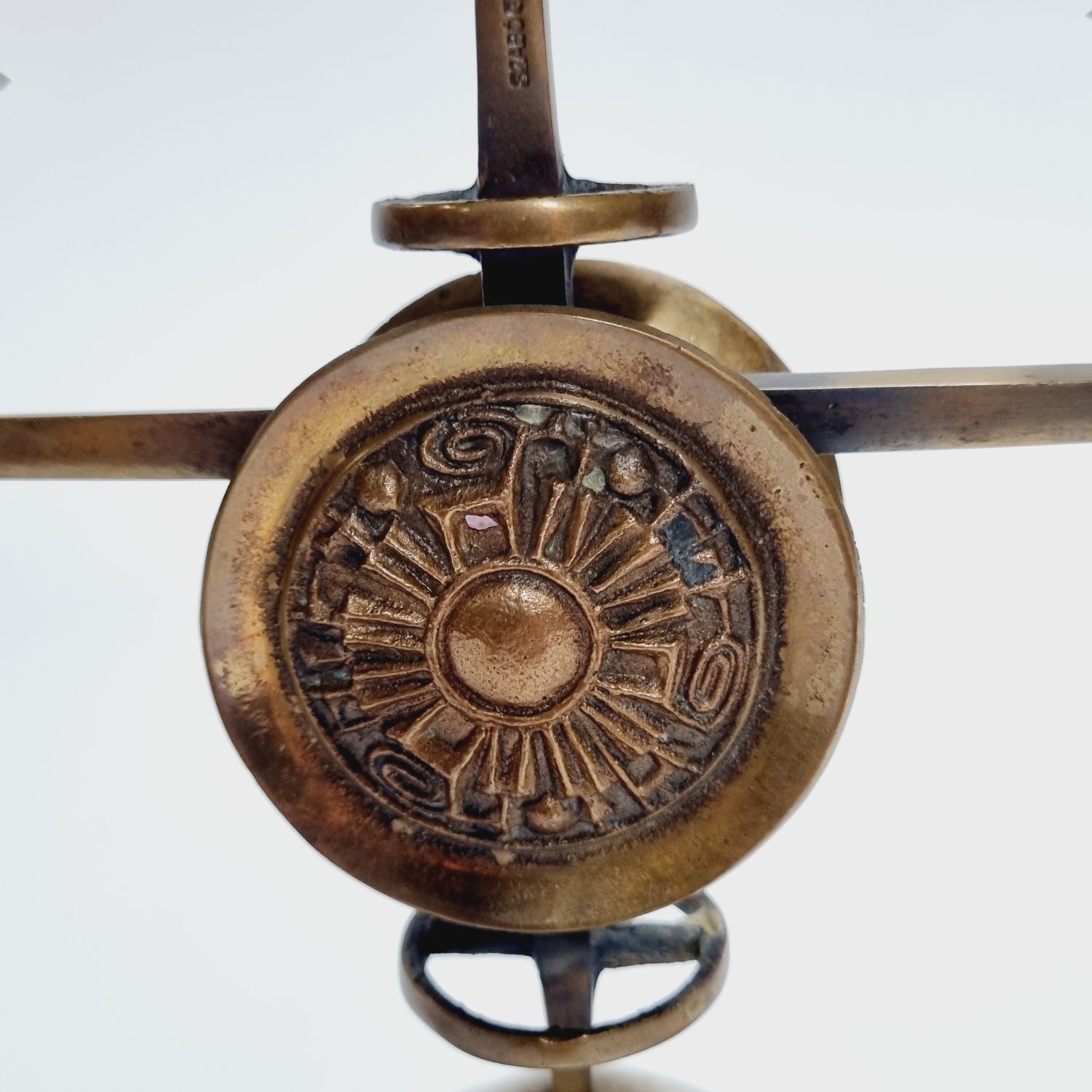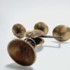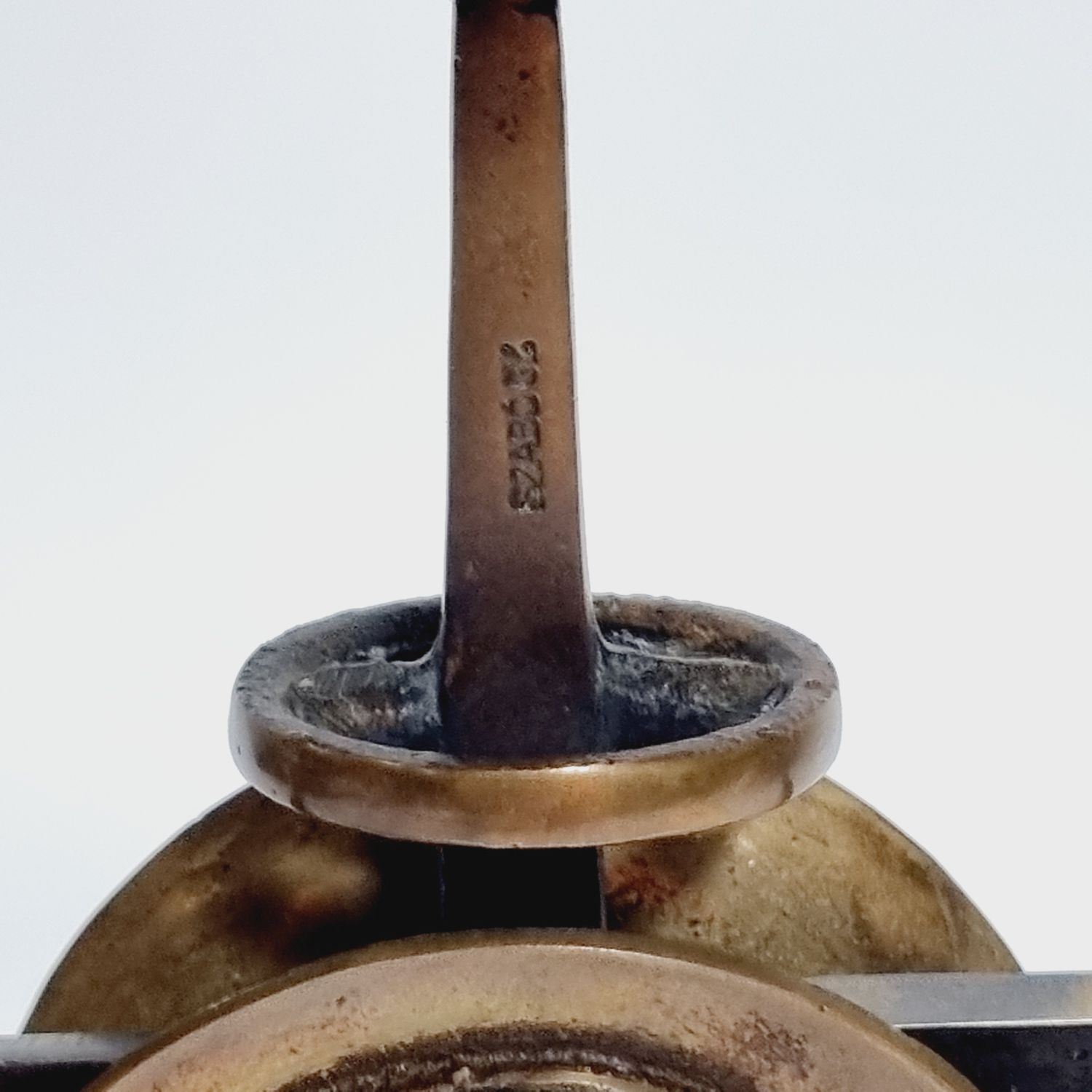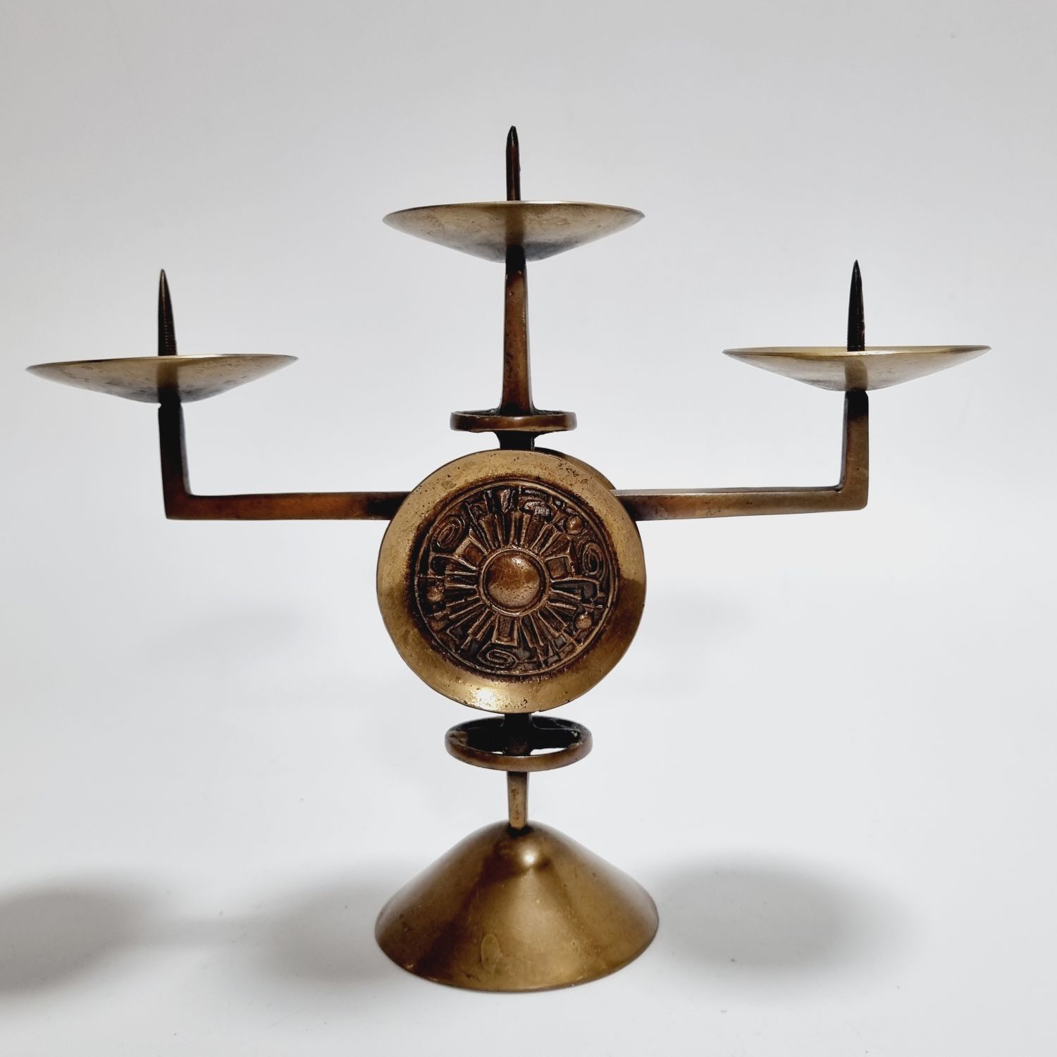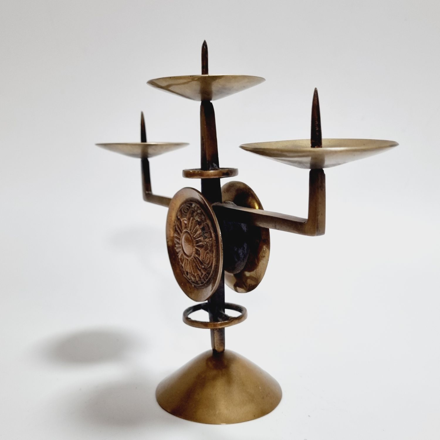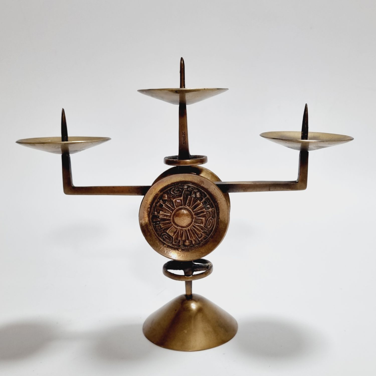 Szabó Gyula: 3 ágú sárgaréz gyertyatartója az 1970-es években született.Indusztriális stílusa miatt rusztikus enteriőrök izgalmas darabja. Méretei: 24 x 20