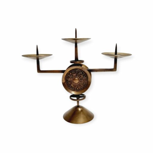 Szabó Gyula: 3 ágú sárgaréz gyertyatartója az 1970-es években született.Indusztriális stílusa miatt rusztikus enteriőrök izgalmas darabja. Méretei: 24 x 20