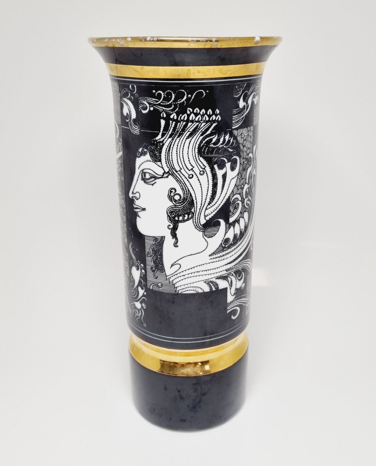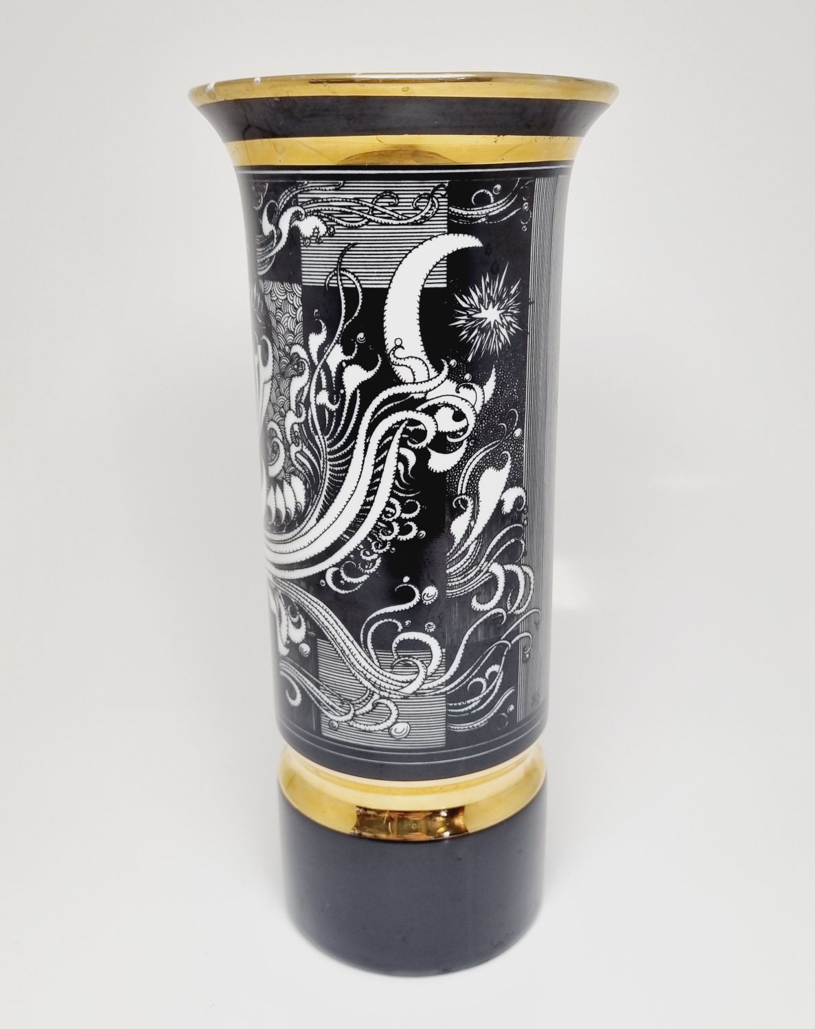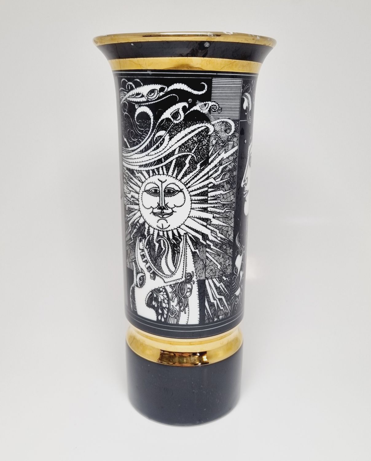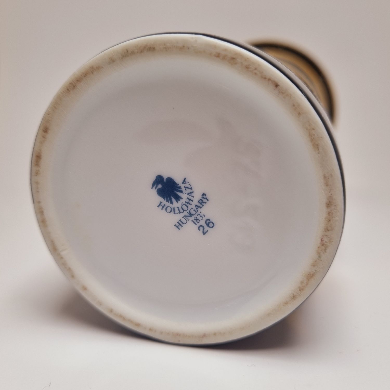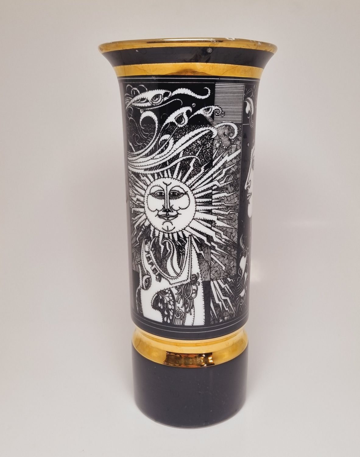 Szász Endre porcelánvázája az 1990s években készült a Hollóházi porcelángyárban. Gazdag motívumkészletéből egy jellegzetes darab. Jelzett, Szász Endre szignóval. Méretei: 20 x 9 x 9 cm.