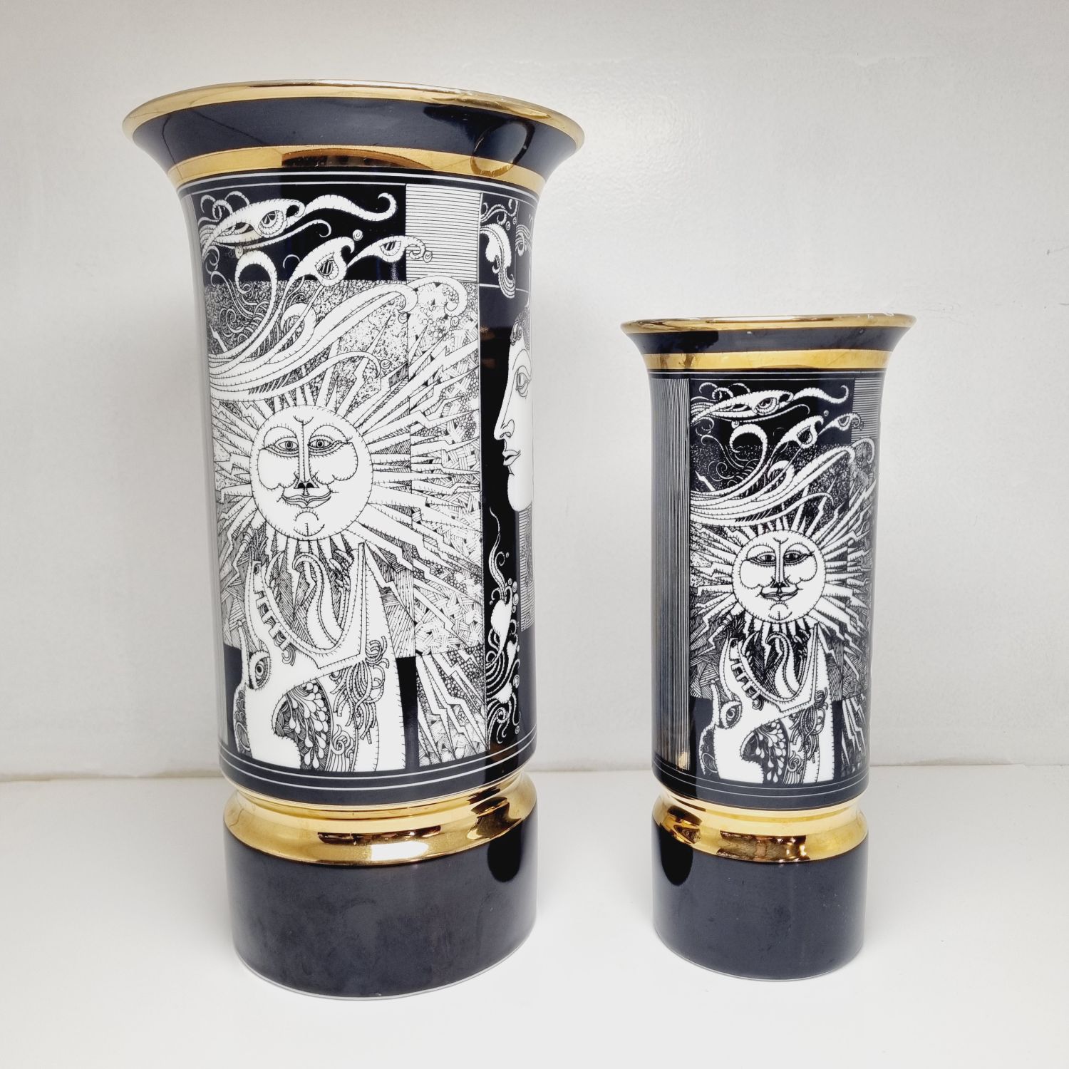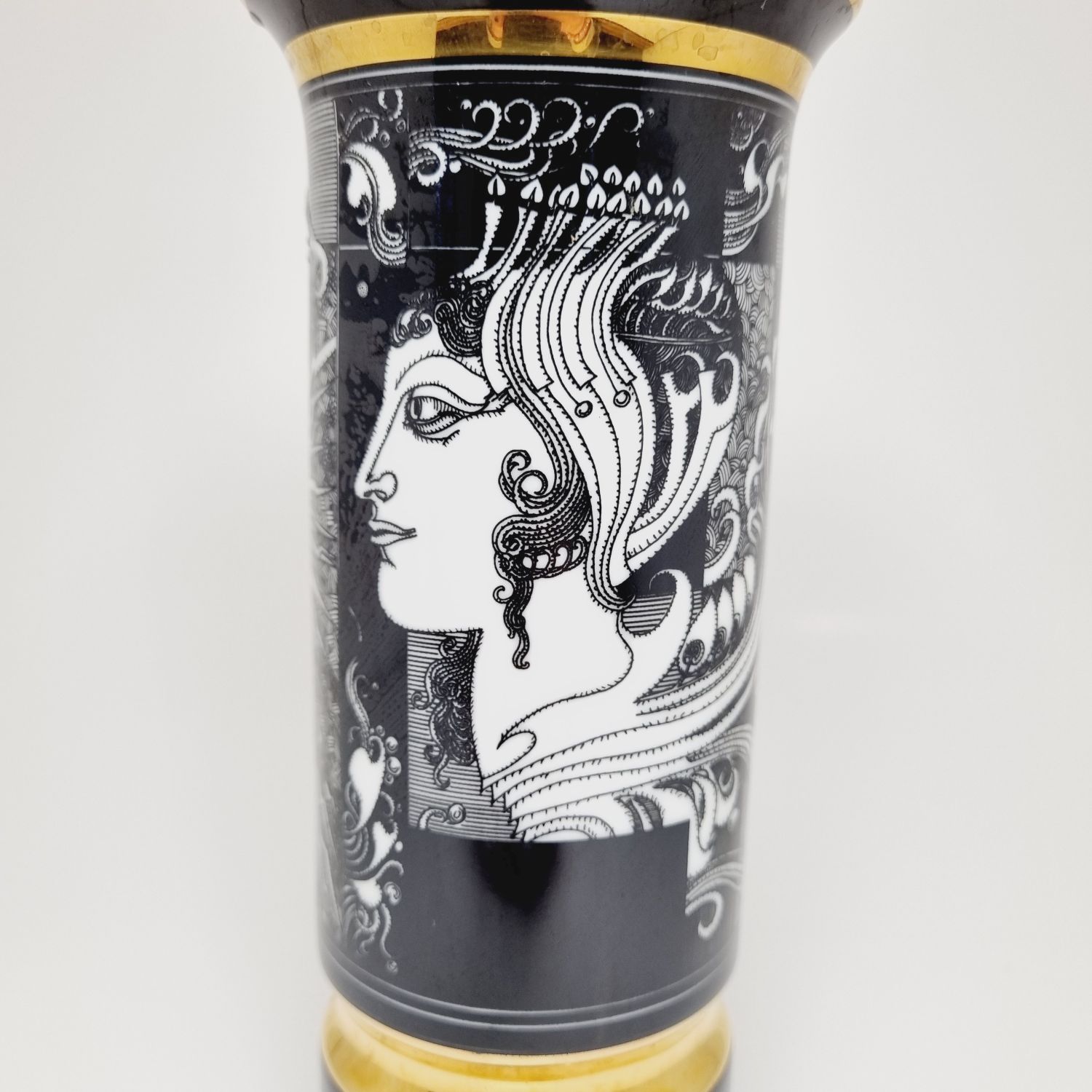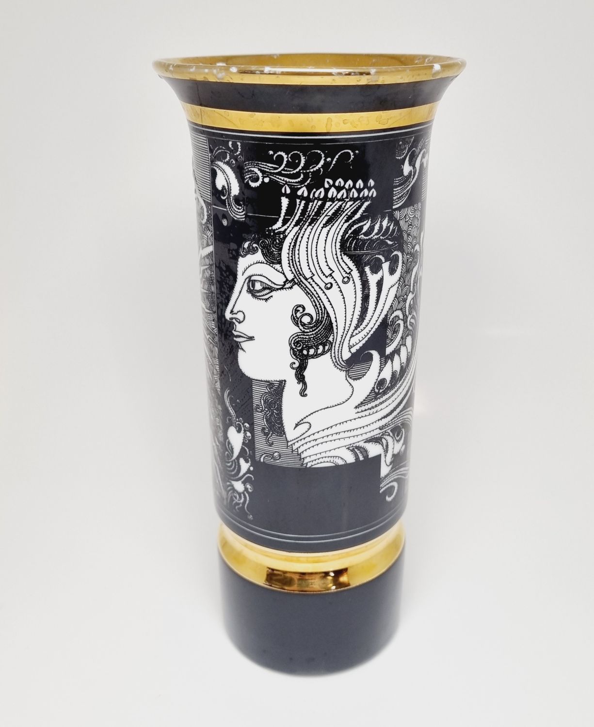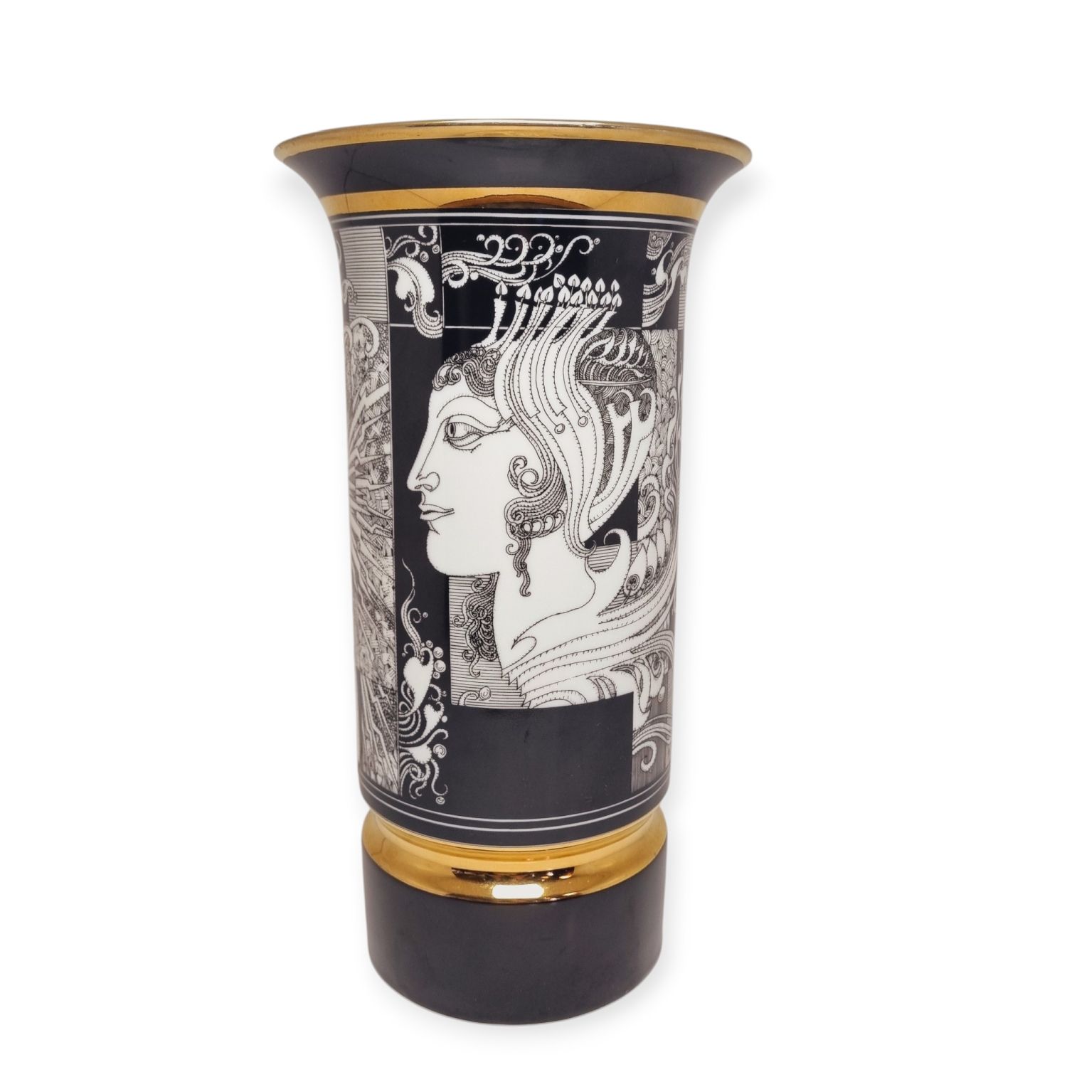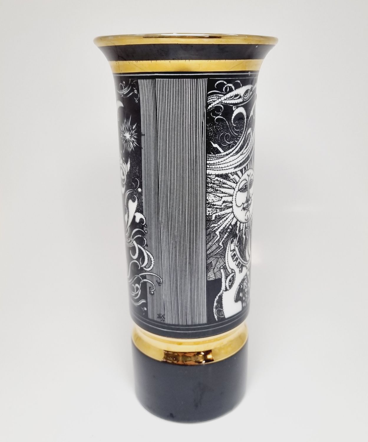 Szász Endre porcelánvázája az 1990s években készült a Hollóházi porcelángyárban. Gazdag motívumkészletéből egy jellegzetes darab. Jelzett, Szász Endre szignóval. Méretei: 20 x 9 x 9 cm.