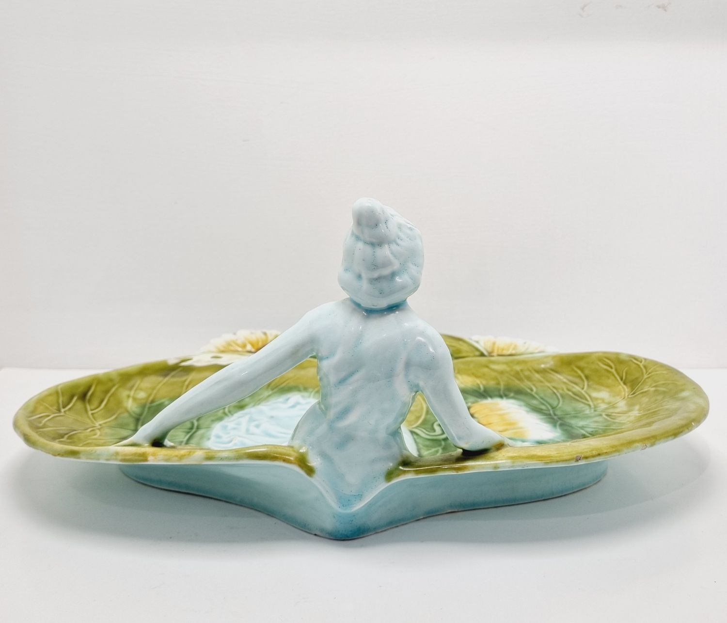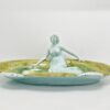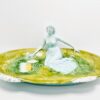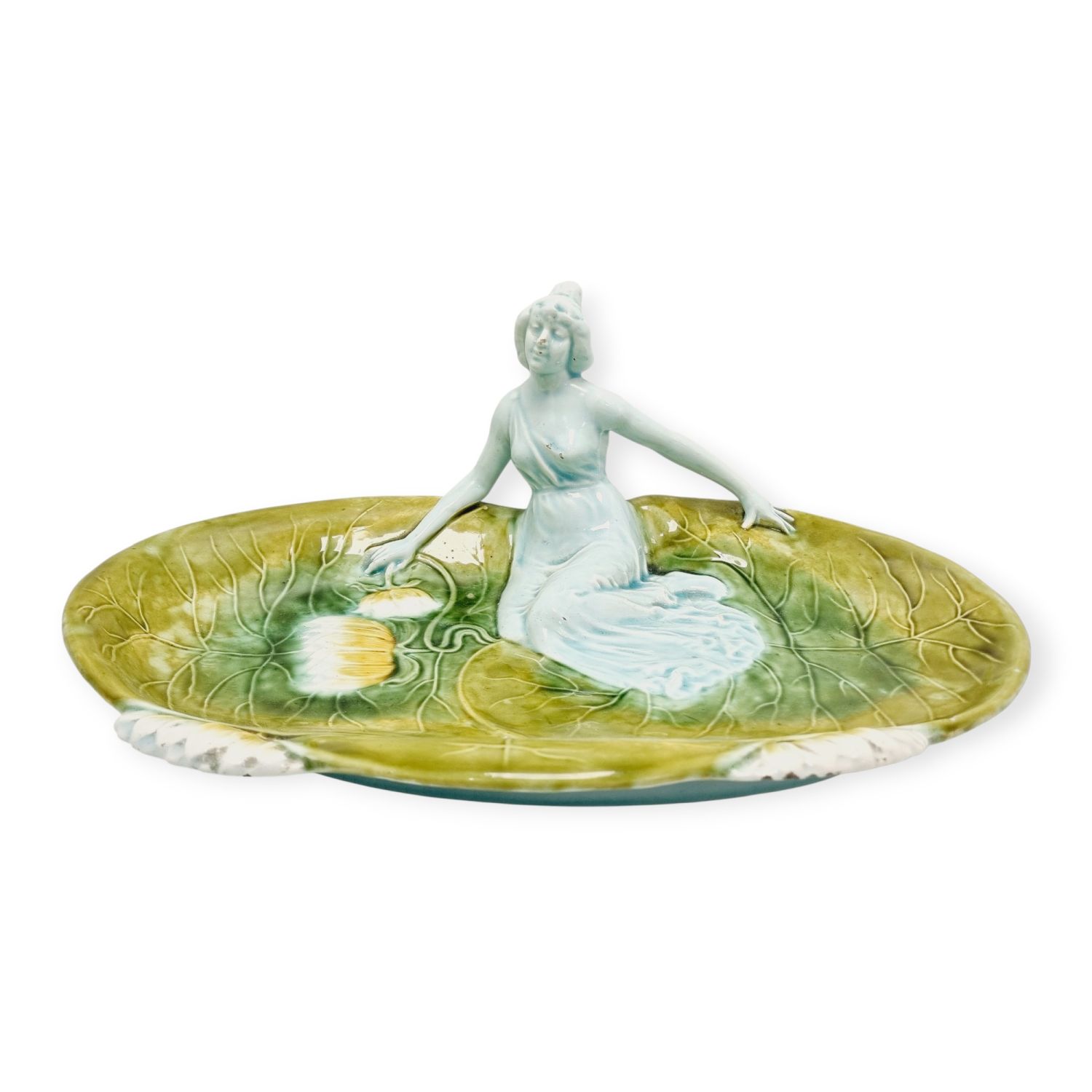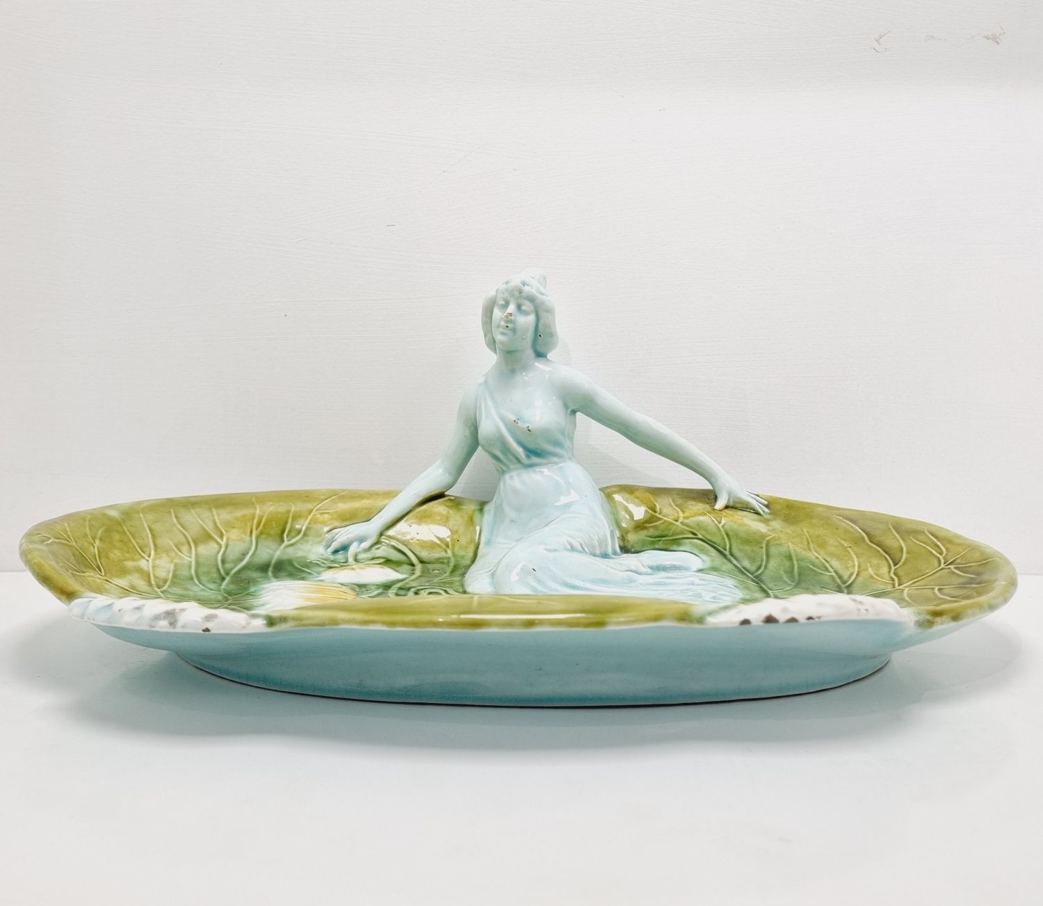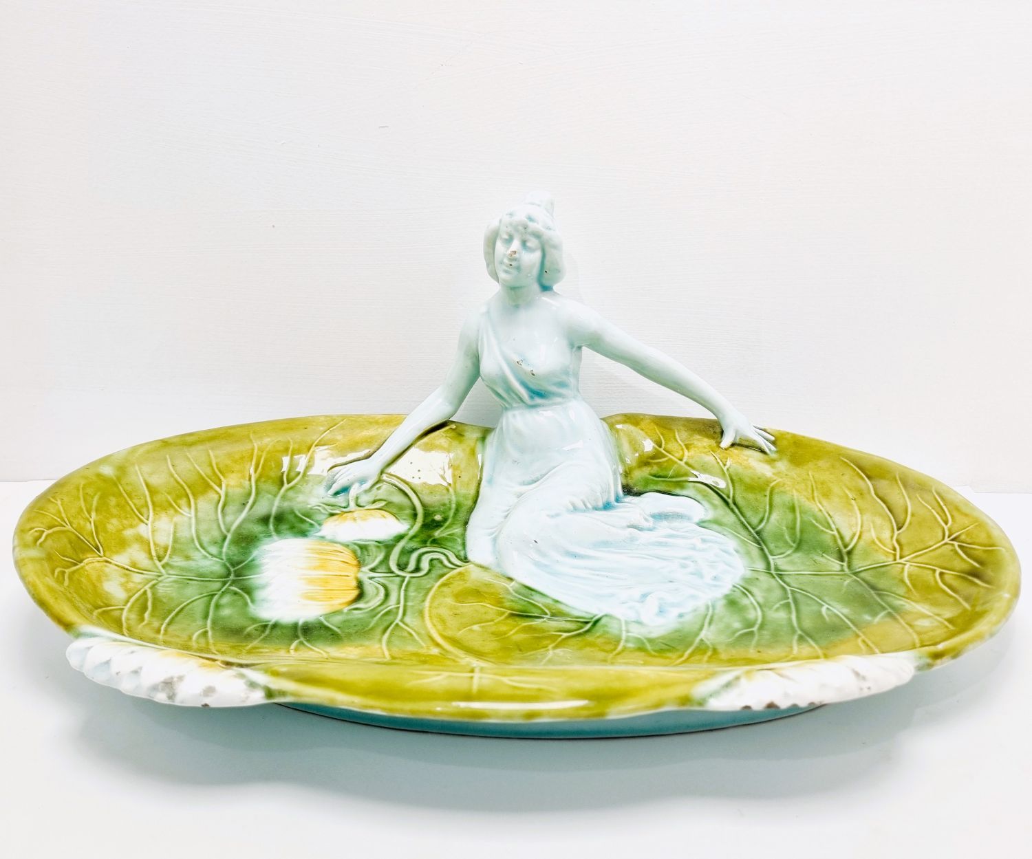 Körmöcbányai szecessziós majolika asztalközép, amely a századfordulón készült. Stilizált növényi ornamentikával, finoman kivitelezett női figurával elegáns darabja a Jugendstíl enteriőrnek. Jelzett. Korának megfelelő állapotú. Méretei: 35 x 25 x 14 cm.