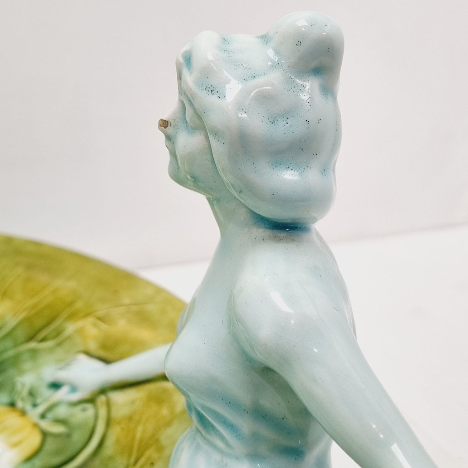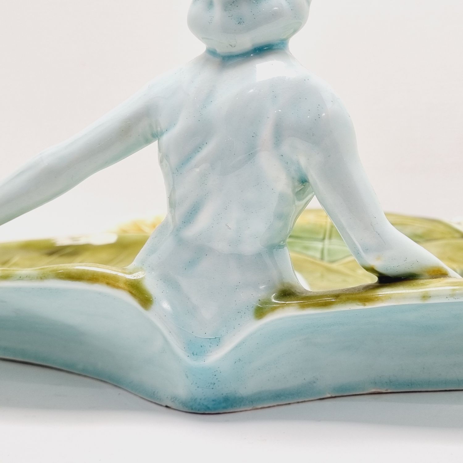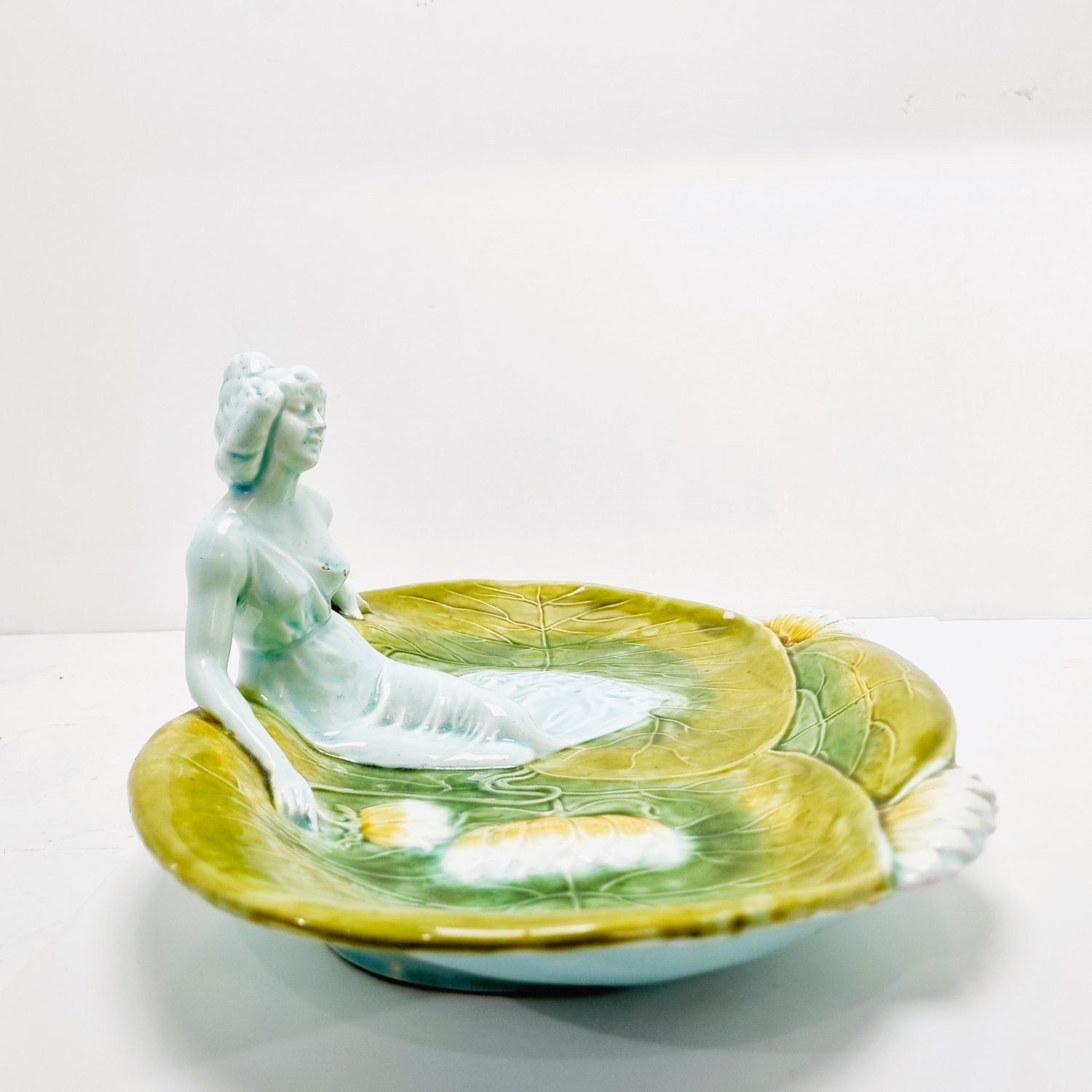 Körmöcbányai szecessziós majolika asztalközép, amely a századfordulón készült. Stilizált növényi ornamentikával, finoman kivitelezett női figurával elegáns darabja a Jugendstíl enteriőrnek. Jelzett. Korának megfelelő állapotú. Méretei: 35 x 25 x 14 cm.