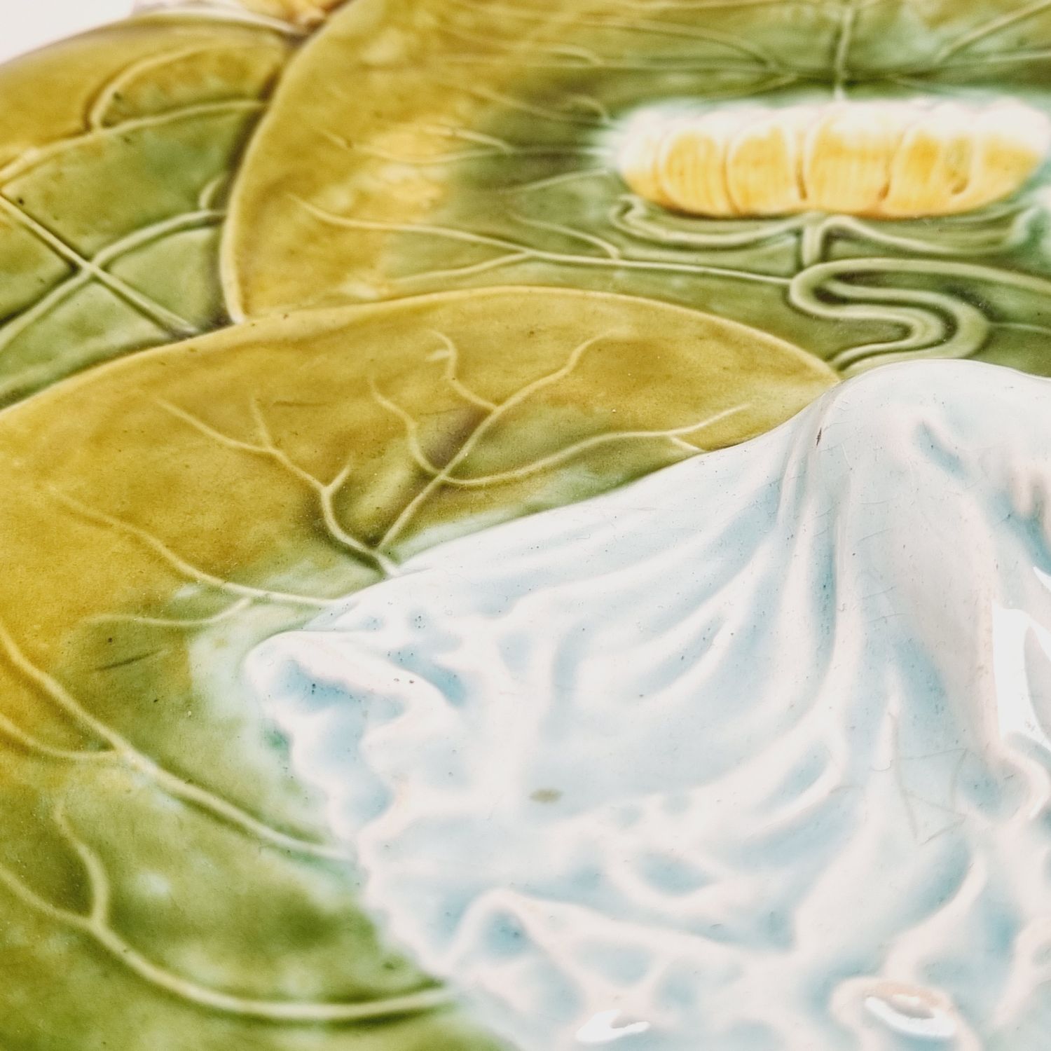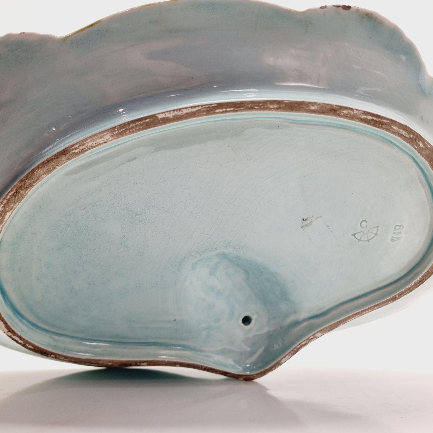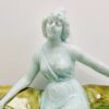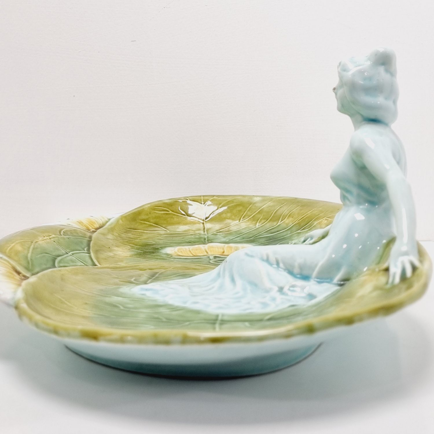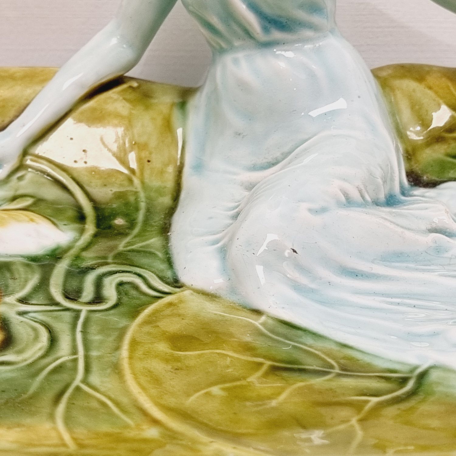 Körmöcbányai szecessziós majolika asztalközép, amely a századfordulón készült. Stilizált növényi ornamentikával, finoman kivitelezett női figurával elegáns darabja a Jugendstíl enteriőrnek. Jelzett. Korának megfelelő állapotú. Méretei: 35 x 25 x 14 cm.
