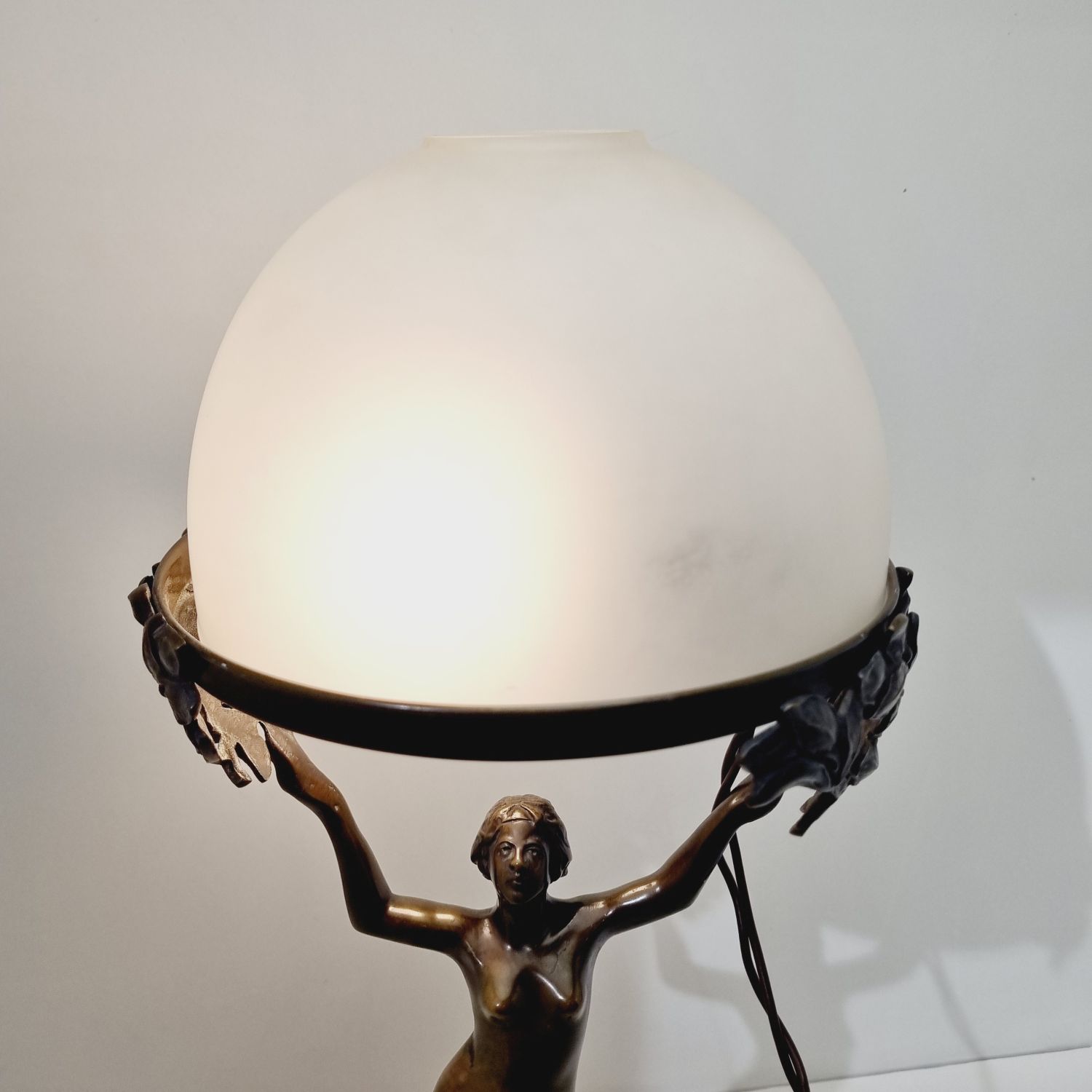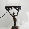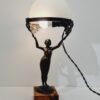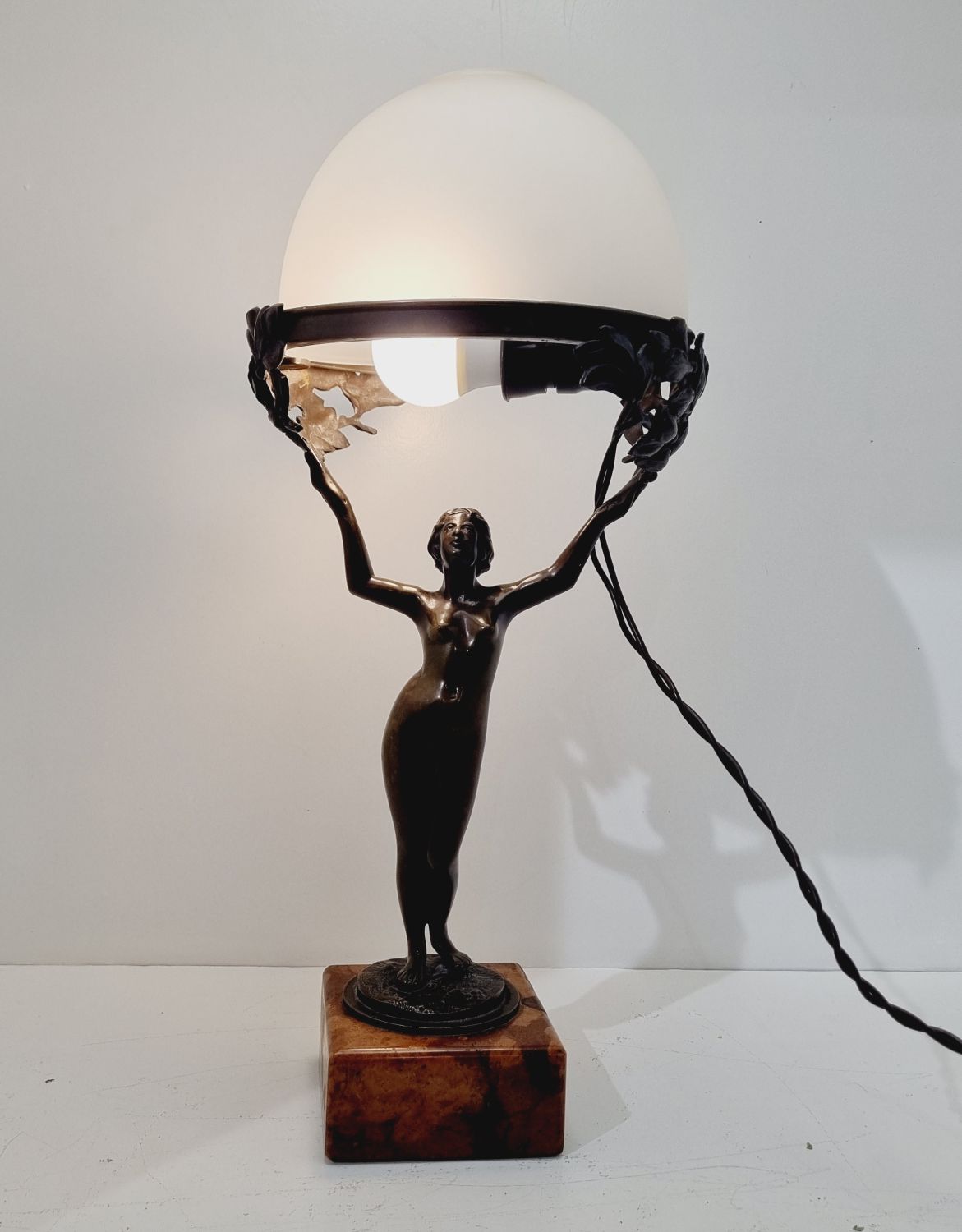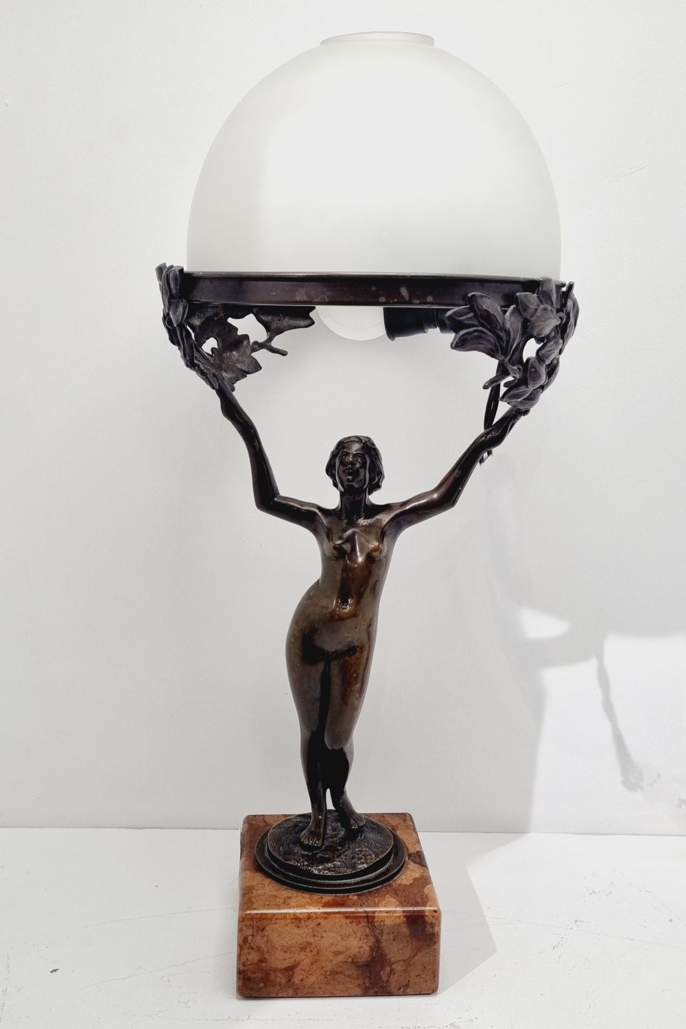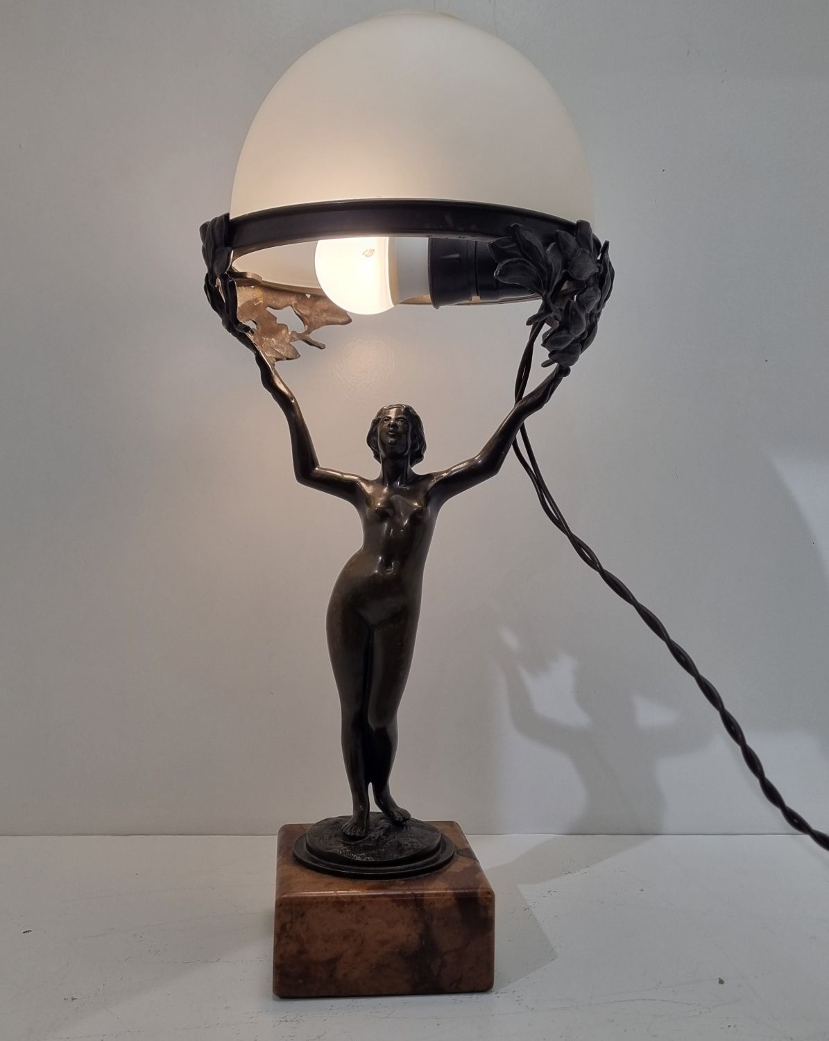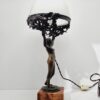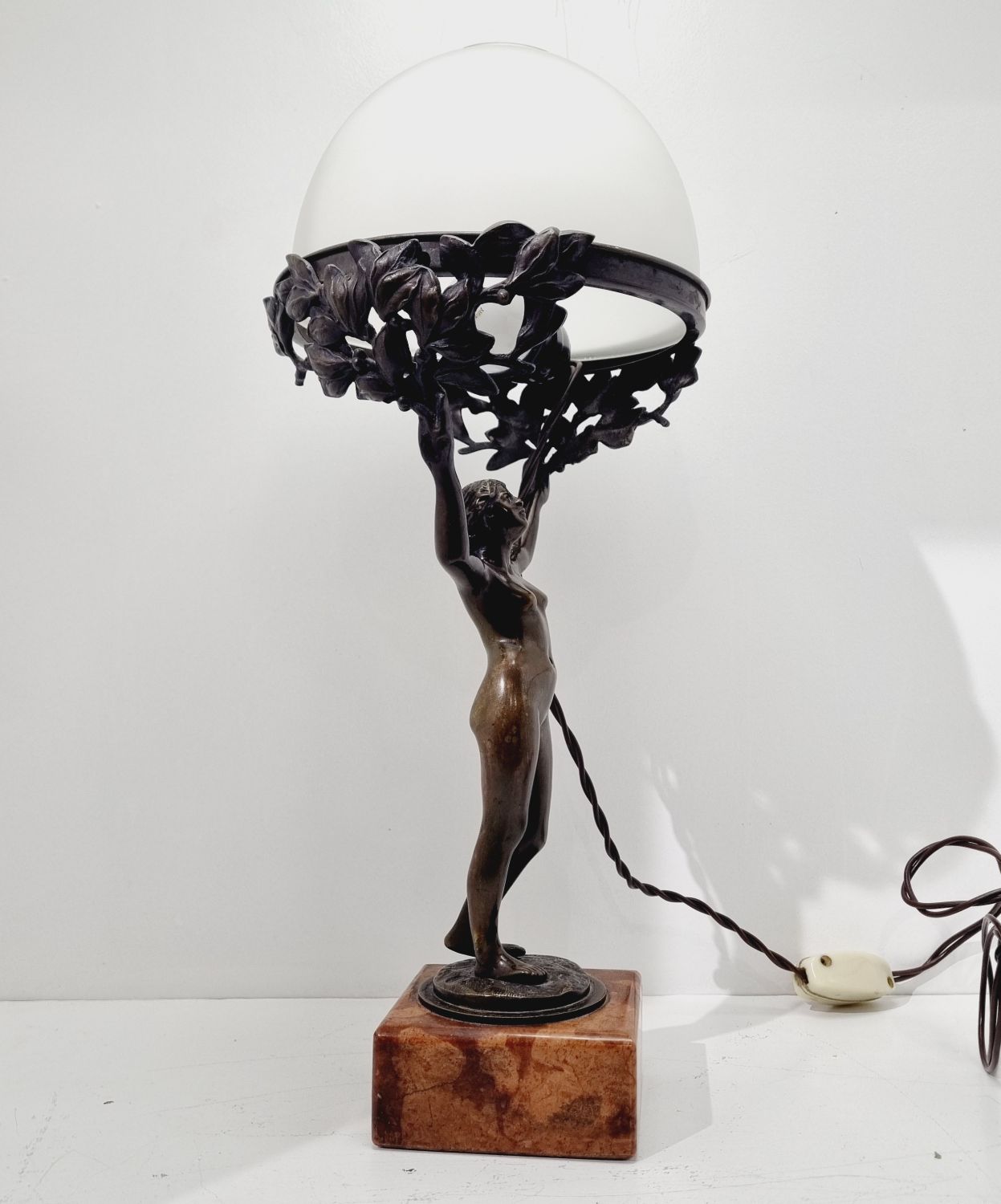 Szecessziós asztali lámpa bronzból, amely az 1920-as években készült. Díszes, organikus formavilág, ívelt vonalak, stilizált női alak, hangsúlyos növényi ornamentika jellemzi. Működőképes. A búra nem eredeti. Méretei: 33 x 19 x 3 cm.